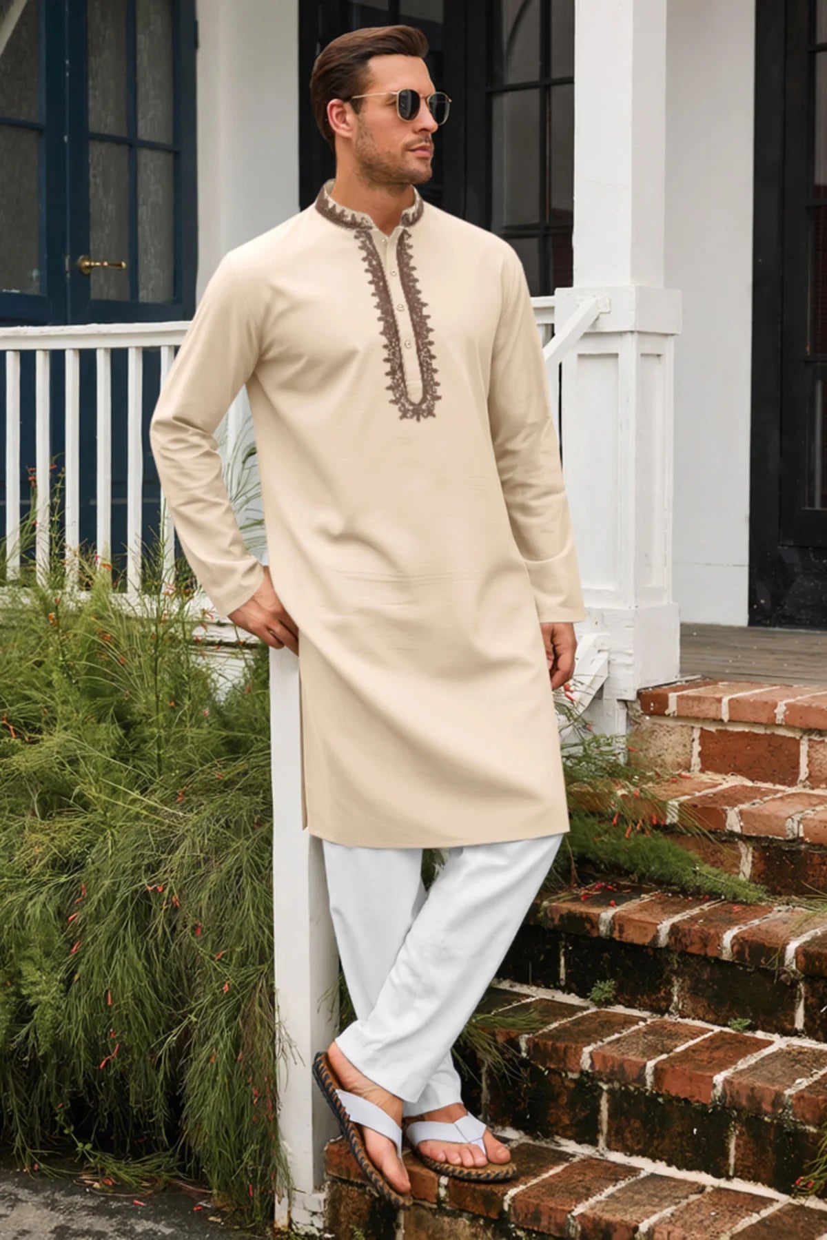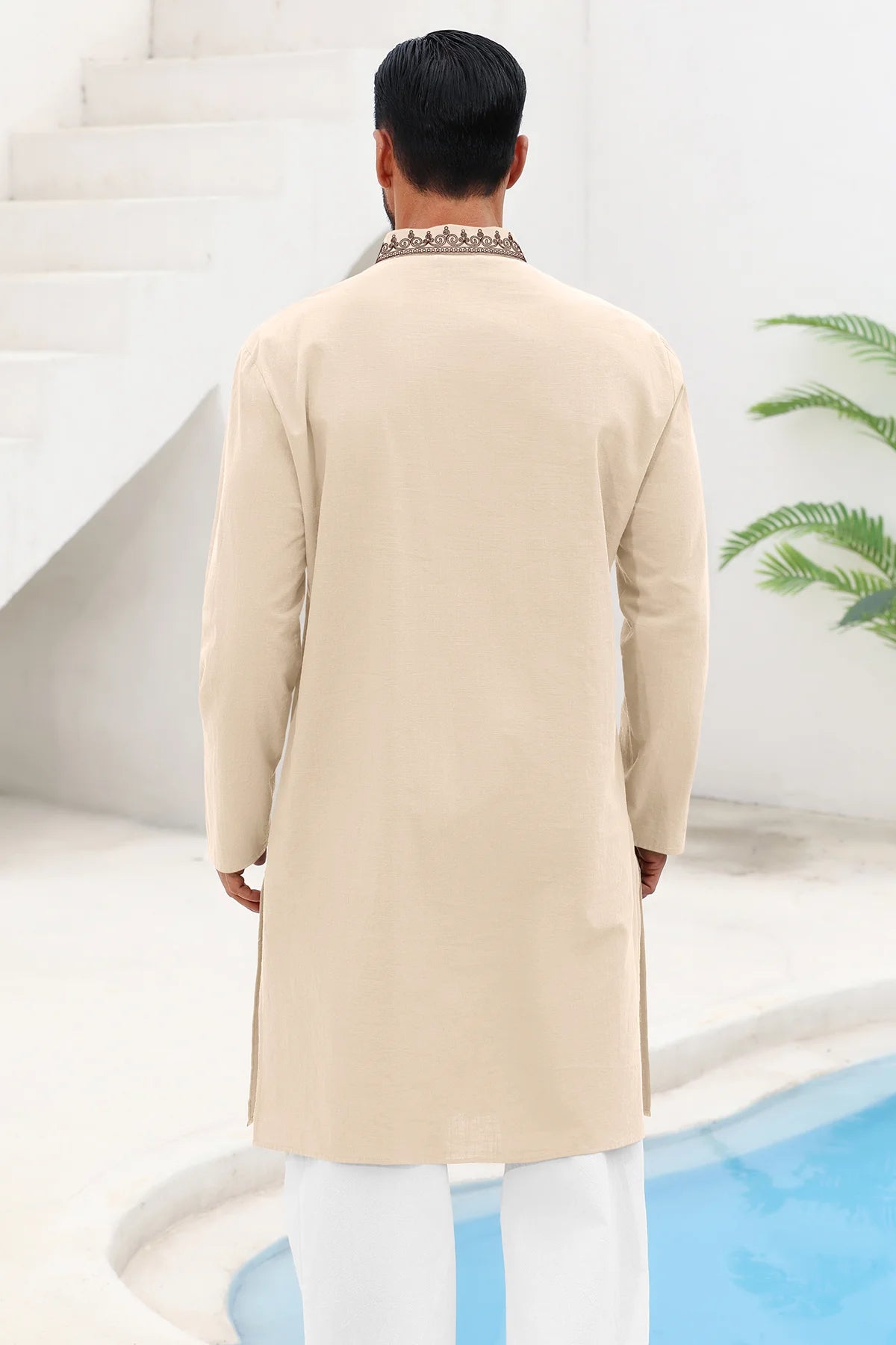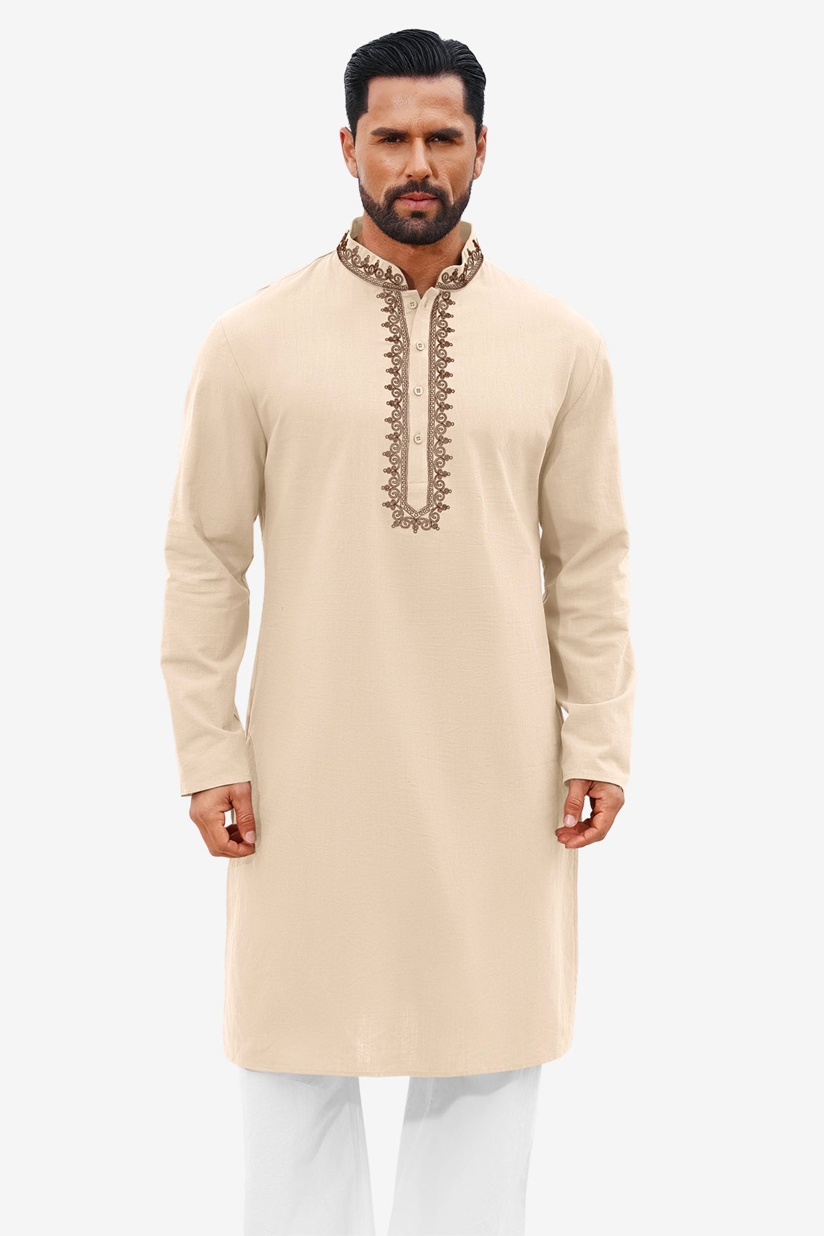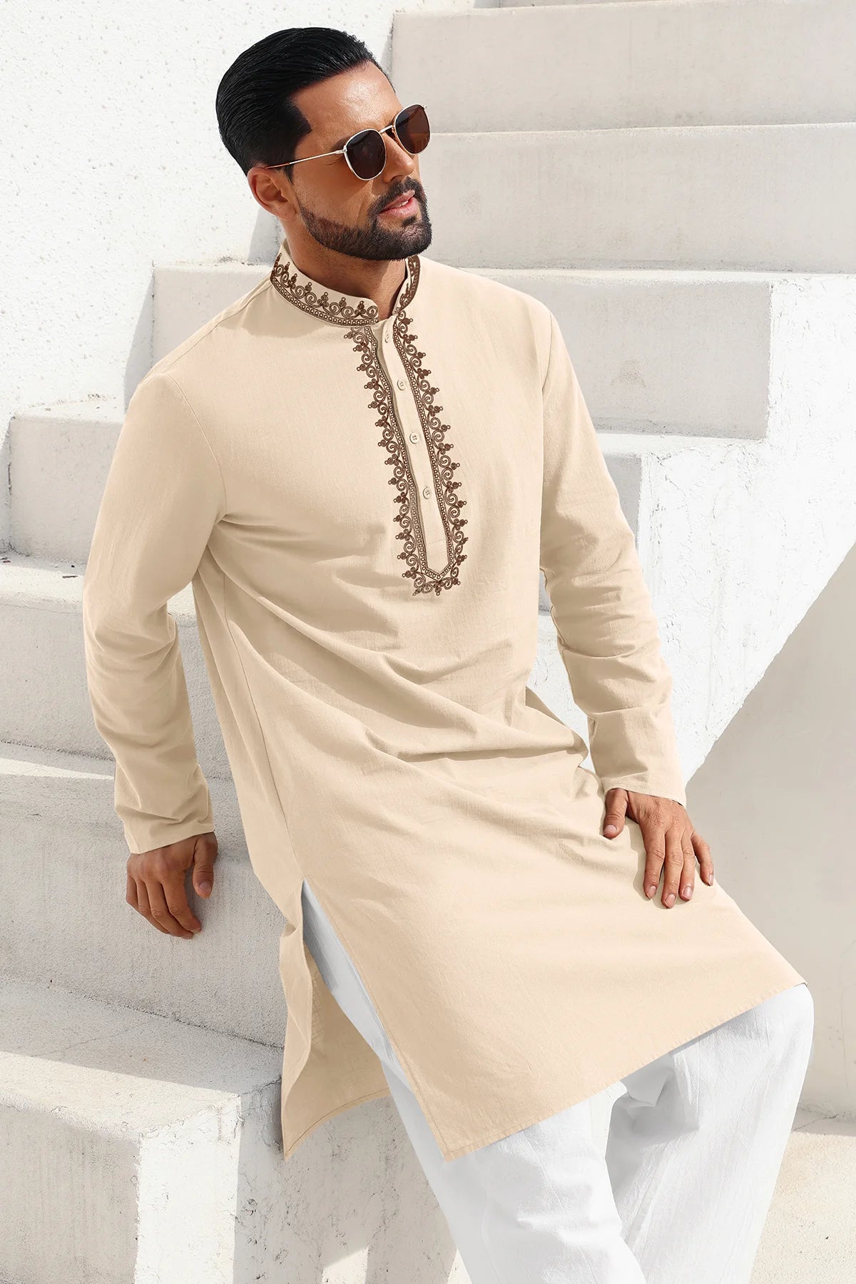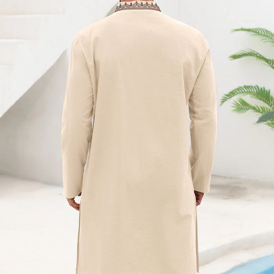 Runcati men’s vintage kaftan thobe blends timeless style with all-season comfort! Designed with a banded collar, long sleeves, elegant embroidery on a solid color base, knee-length cut, side splits, and a relaxed loose fit, it offers versatility and classic sophistication. Crafted from high-quality cotton, it’s soft, breathable, lightweight, and durable—perfect for spring, summer, fall, and winter wear. Easy to style for any occasion, it’s a versatile addition to your wardrobe.
