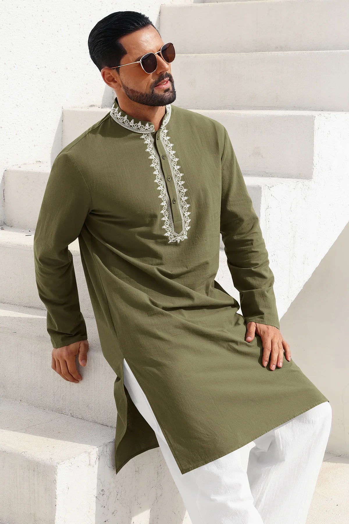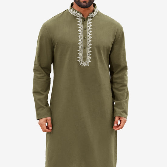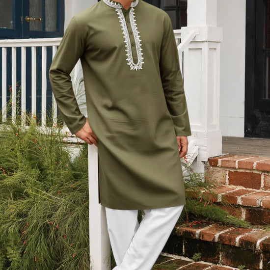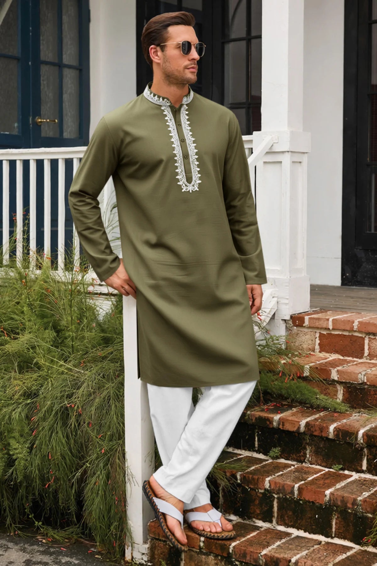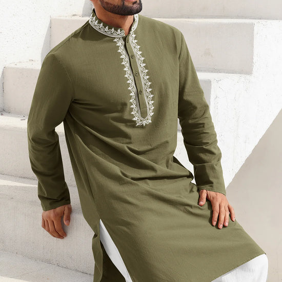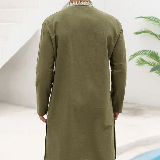 Runcati men’s vintage kaftan thobe blends timeless style with all-season comfort! Designed with a banded collar, long sleeves, elegant embroidery on a solid color base, knee-length cut, side splits, and a relaxed loose fit, it offers versatility and classic sophistication. Crafted from high-quality cotton, it’s soft, breathable, lightweight, and durable—perfect for spring, summer, fall, and winter wear. Easy to style for any occasion, it’s a versatile addition to your wardrobe.
