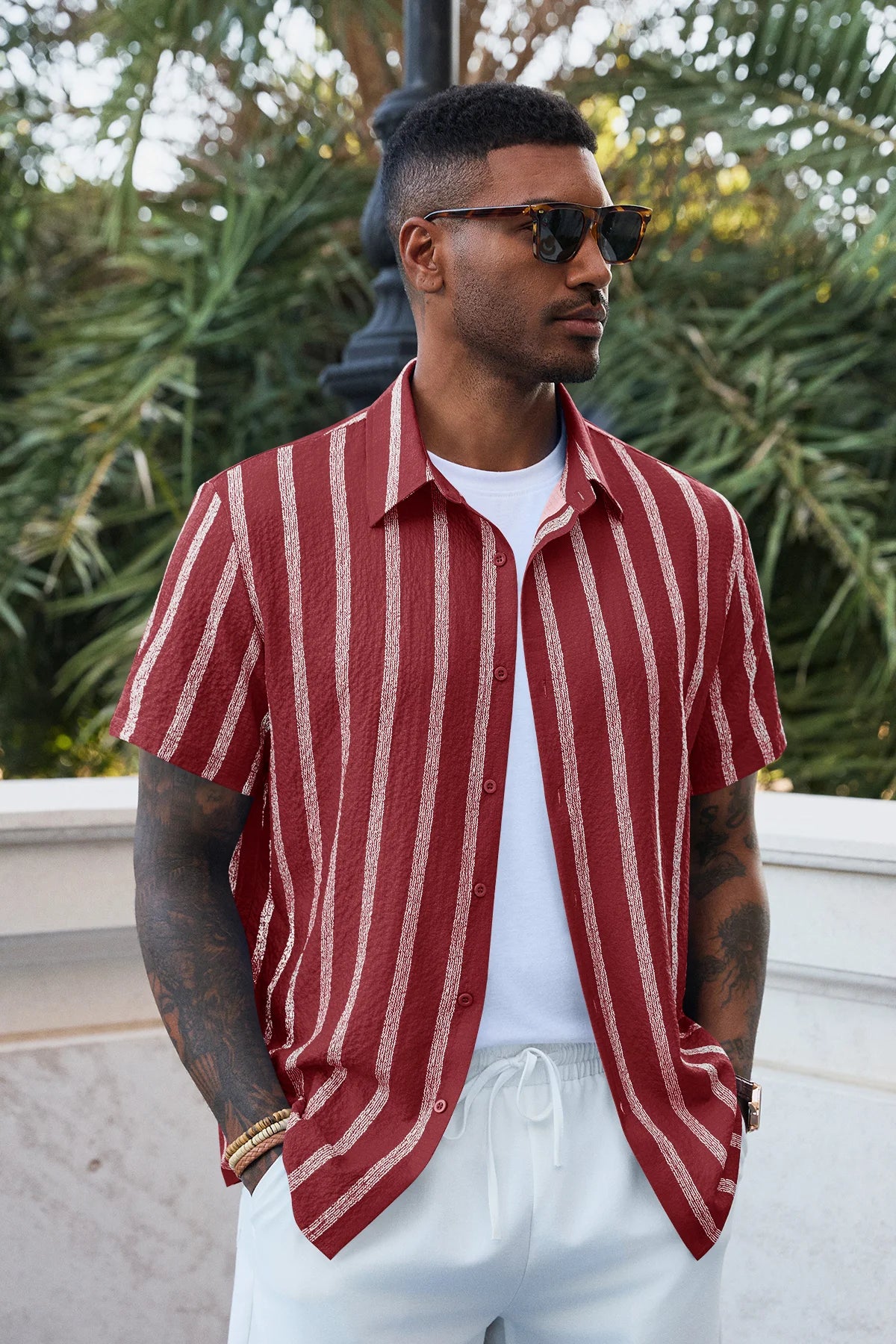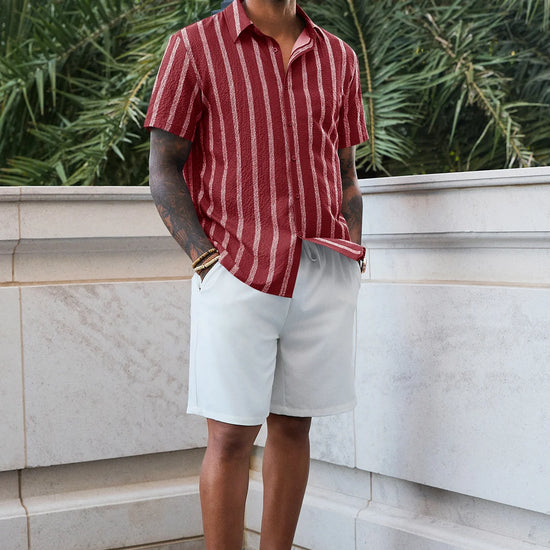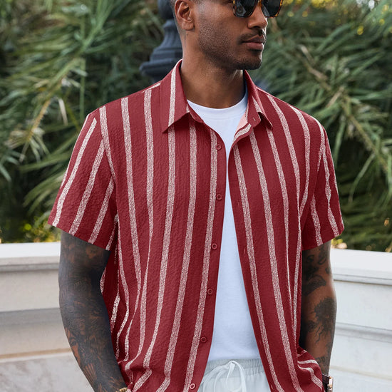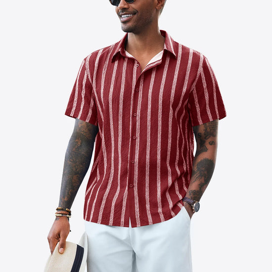 Elevate your vacation style with the Runcati Men’s Striped Button-Down. Featuring a classic spread collar and a modern curved hemline, this shirt blends vintage Hawaiian vibes with a clean, regular fit. The premium linen-like texture ensures you stay cool and confident, making it an essential piece for the modern man’s summer wardrobe.