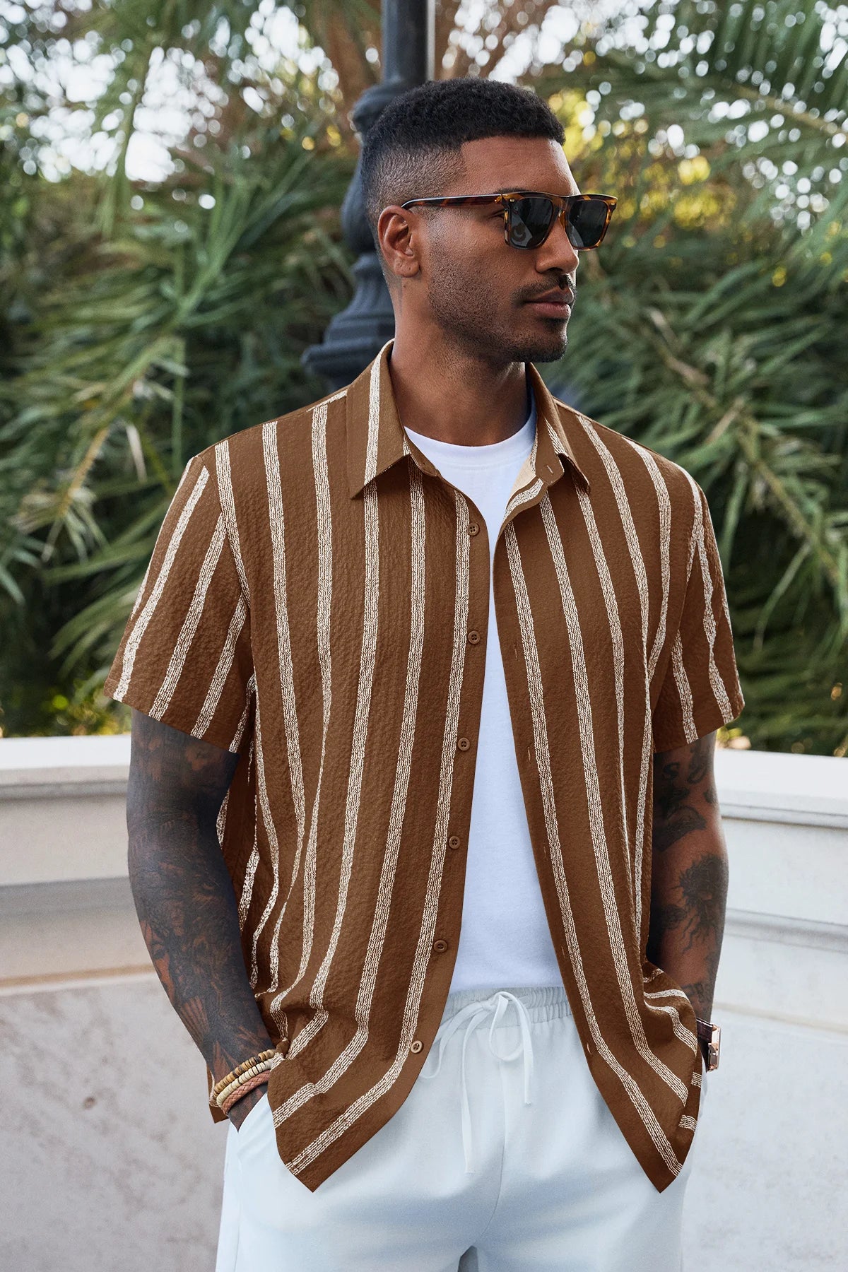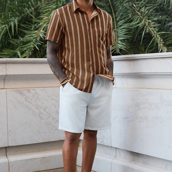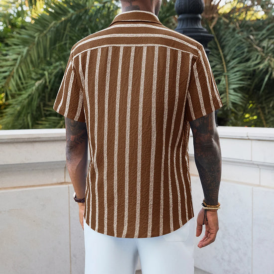 Elevate your vacation style with the Runcati Men’s Striped Button-Down. Featuring a classic spread collar and a modern curved hemline, this shirt blends vintage Hawaiian vibes with a clean, regular fit. The premium linen-like texture ensures you stay cool and confident, making it an essential piece for the modern man’s summer wardrobe.