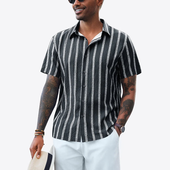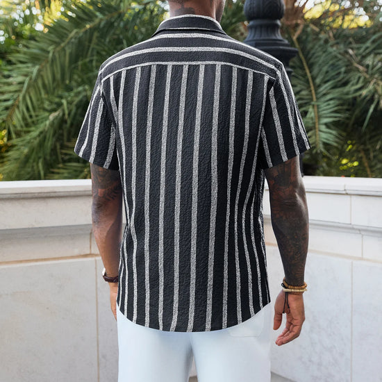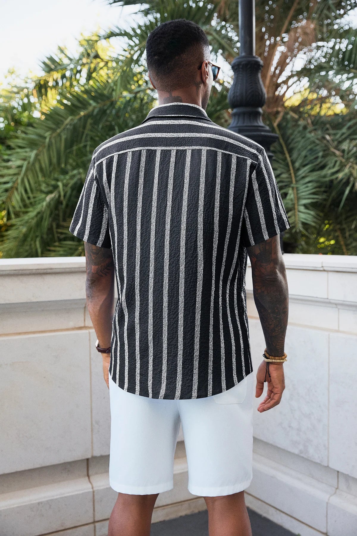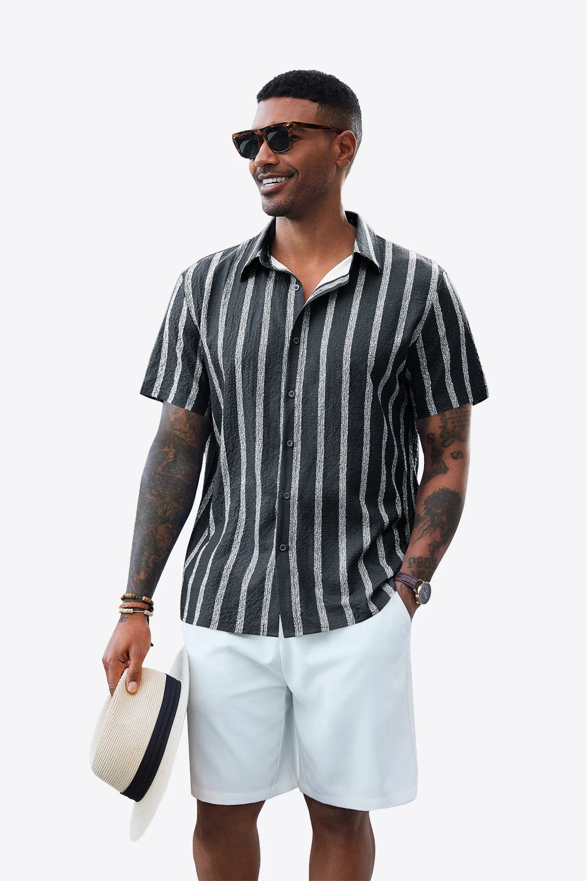Elevate your vacation style with the Runcati Men’s Striped Button-Down. Featuring a classic spread collar and a modern curved hemline, this shirt blends vintage Hawaiian vibes with a clean, regular fit. The premium linen-like texture ensures you stay cool and confident, making it an essential piece for the modern man’s summer wardrobe.