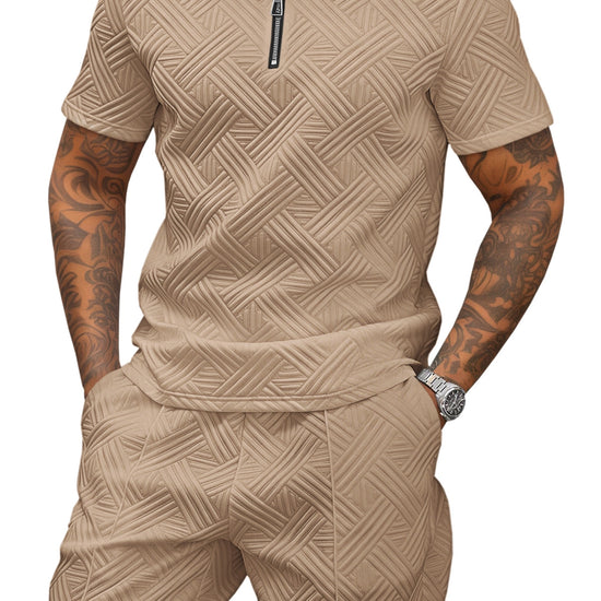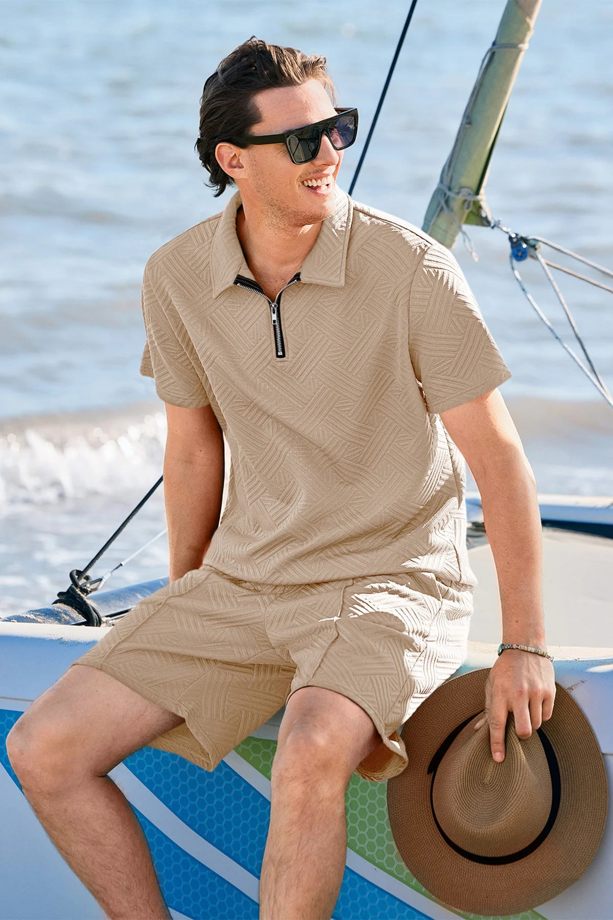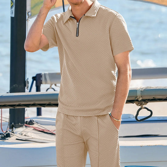 Elevate your summer leisure game with the Runcati Men’s 2-Piece Textured Tracksuit. Featuring a sophisticated quarter-zip polo and matching pleated shorts, this set is crafted from premium jacquard knit for a high-end look and feel. Designed for the modern man, it offers effortless style and breathable comfort from the golf course to the coast.