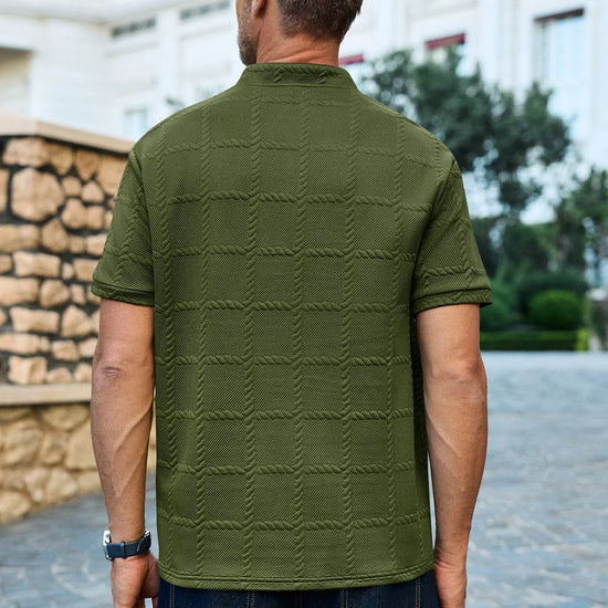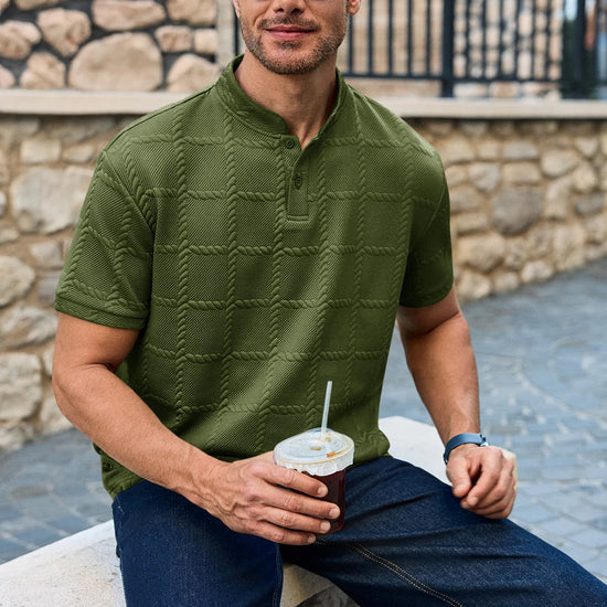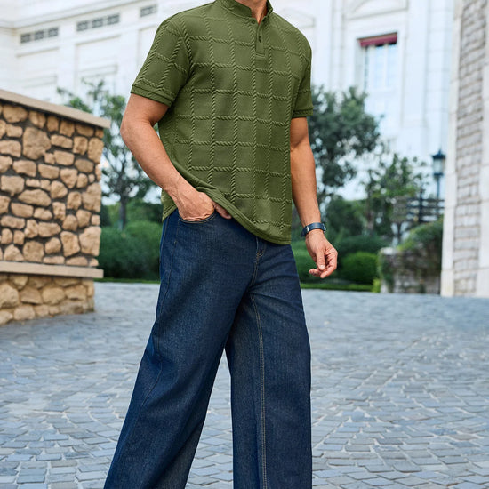 Elevate your smart-casual rotation with this Runcati men’s textured Henley shirt. Featuring a sophisticated plaid jacquard knit and a sleek stand collar, this polo alternative offers a refined, modern silhouette. Perfectly balanced between business-casual and weekend-ready, its wrinkle-free fabric ensures you maintain a polished, professional look from the office to the airport.