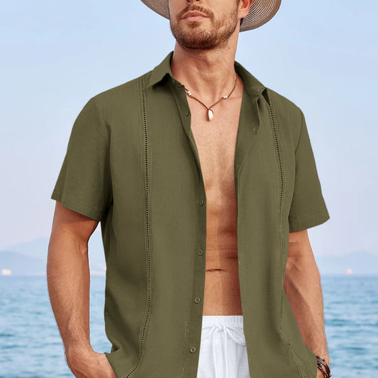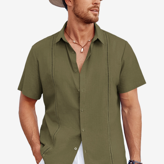 Authentic Cuban Guayabera design with short sleeves, turn-down collar, and button closure for classic appeal.