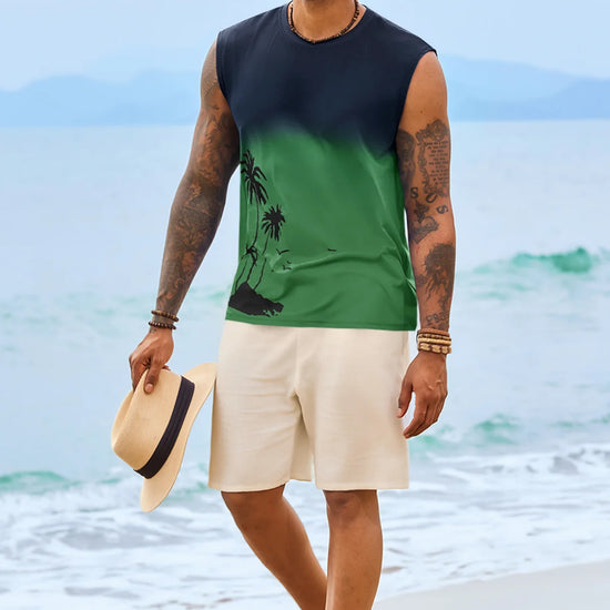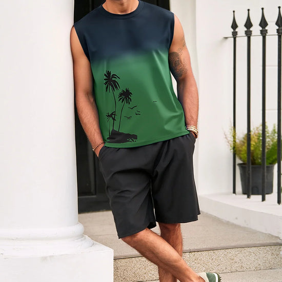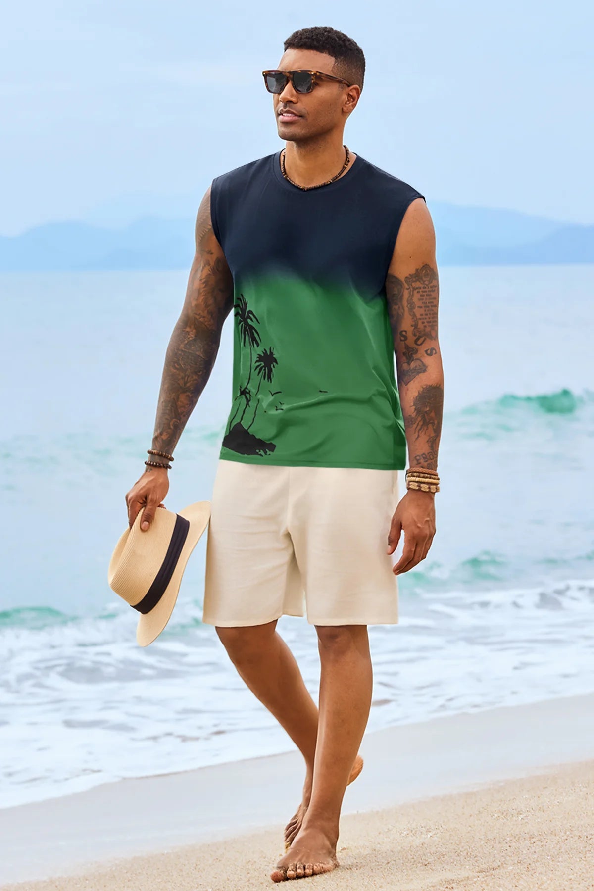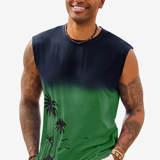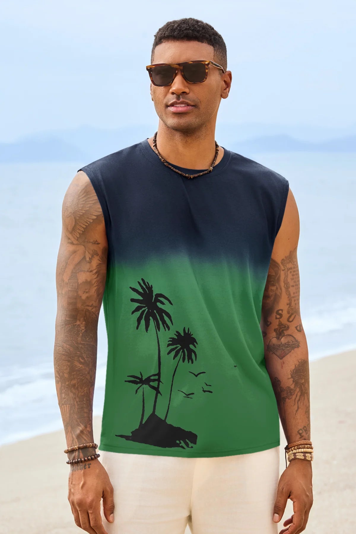 Elevate your summer vibe with this Runcati men's graphic tank top. Featuring a striking palm tree gradient print, this sleeveless shirt blends retro Hawaiian aesthetics with a modern muscle fit. Whether you're hitting the gym or heading to a beach bonfire, its moisture-wicking fabric ensures you stay cool, dry, and stylish under the sun.