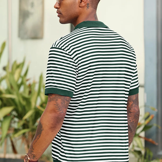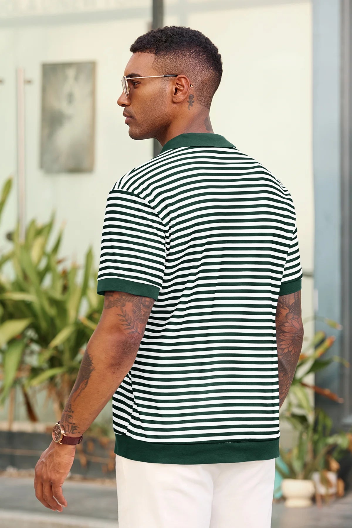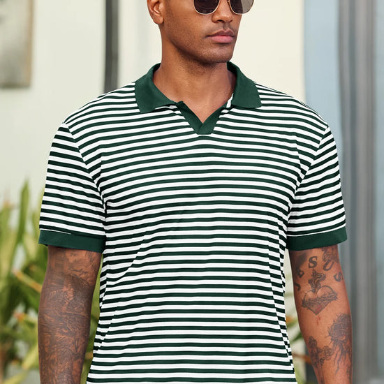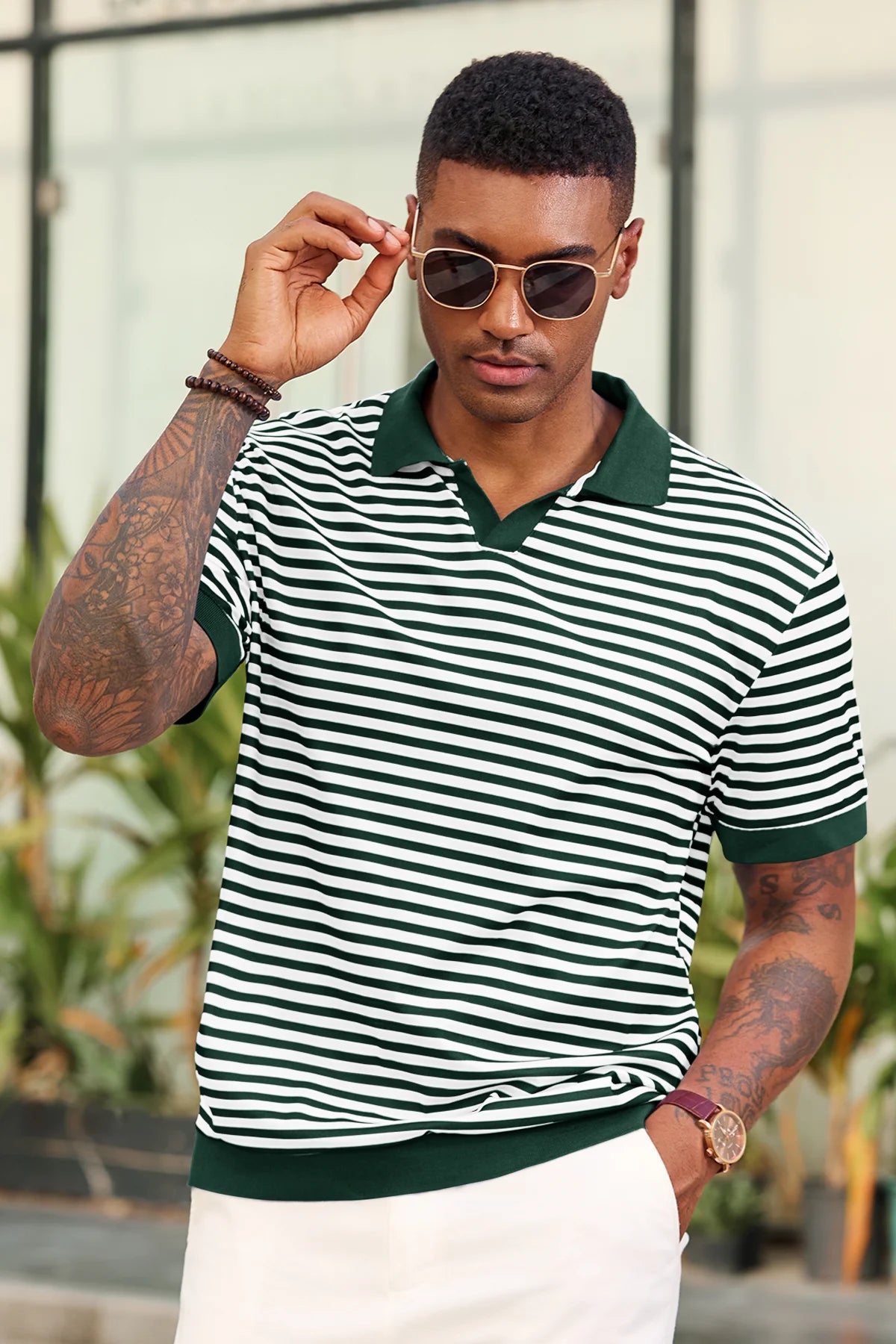 Elevate your wardrobe with Runcati Men’s Short Sleeve Knit Polo Shirt—crafted for comfort and classic style. This 100% polyester polo features a timeless V-neck, resort collar, and striped design, paired with ribbed sleeves and hem for a tailored fit. Soft, stretchy, and breathable, it keeps you cool in hot summer weather while offering versatility for casual or formal moments.