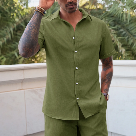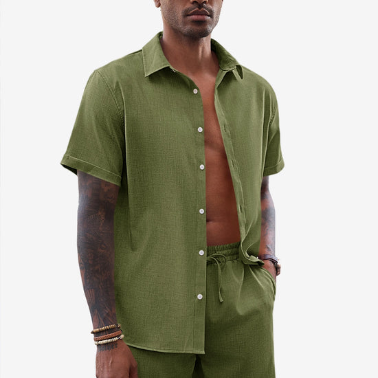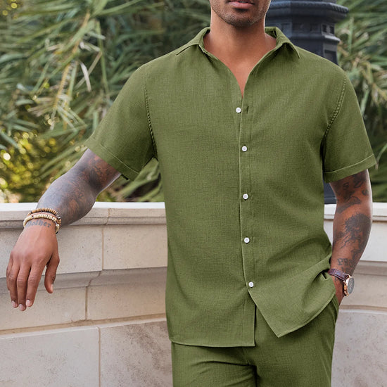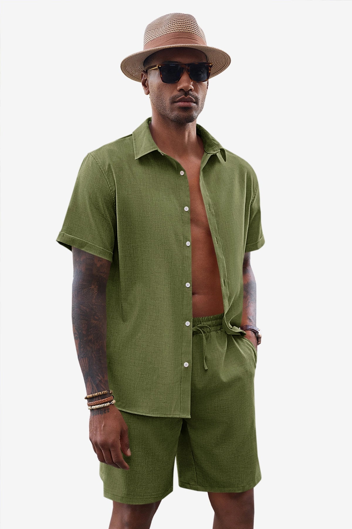 Runcati Mens Army Green Linen Short Sleeve 2 Piece Sets