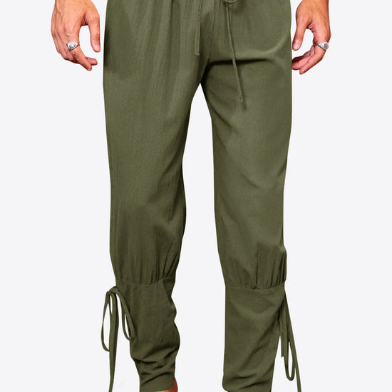 Adjustable Tied Ankles: Functional lace-up cuffs at the calf ensure a secure fit and prevent the pants from riding up.