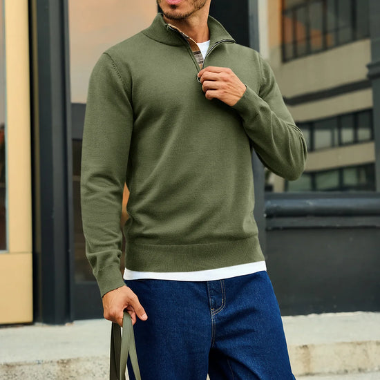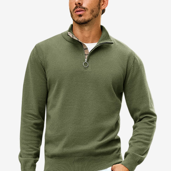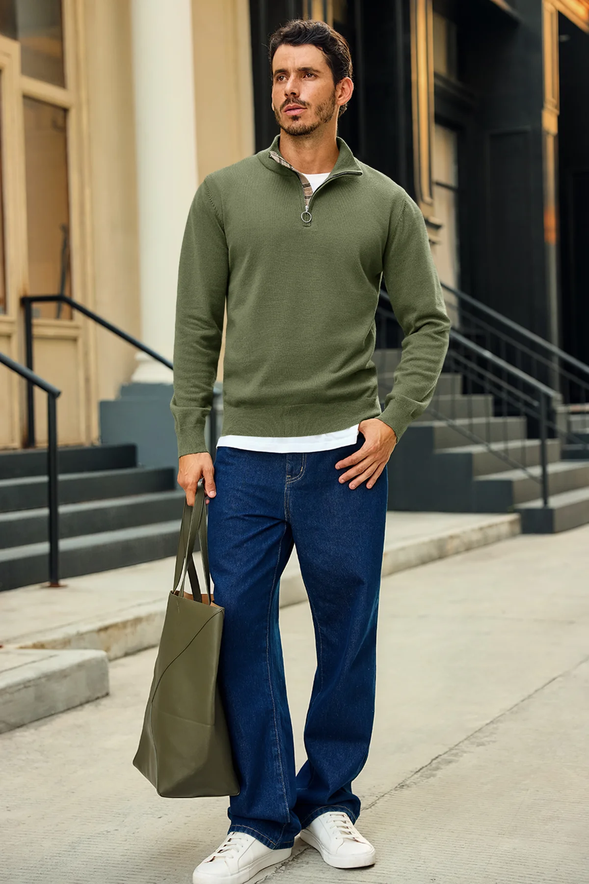 Check out this stylish men's lightweight pullover sweater! With a slim fit, long sleeves, and a half zip mock neck, it’s both comfy and trendy. The unique plaid patchwork collar adds a cool touch. Perfect for casual outings or dressing up over a shirt, it pairs well with jeans or chinos. Made from soft, stretchy fabric, it's warm yet breathable.