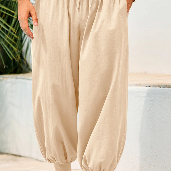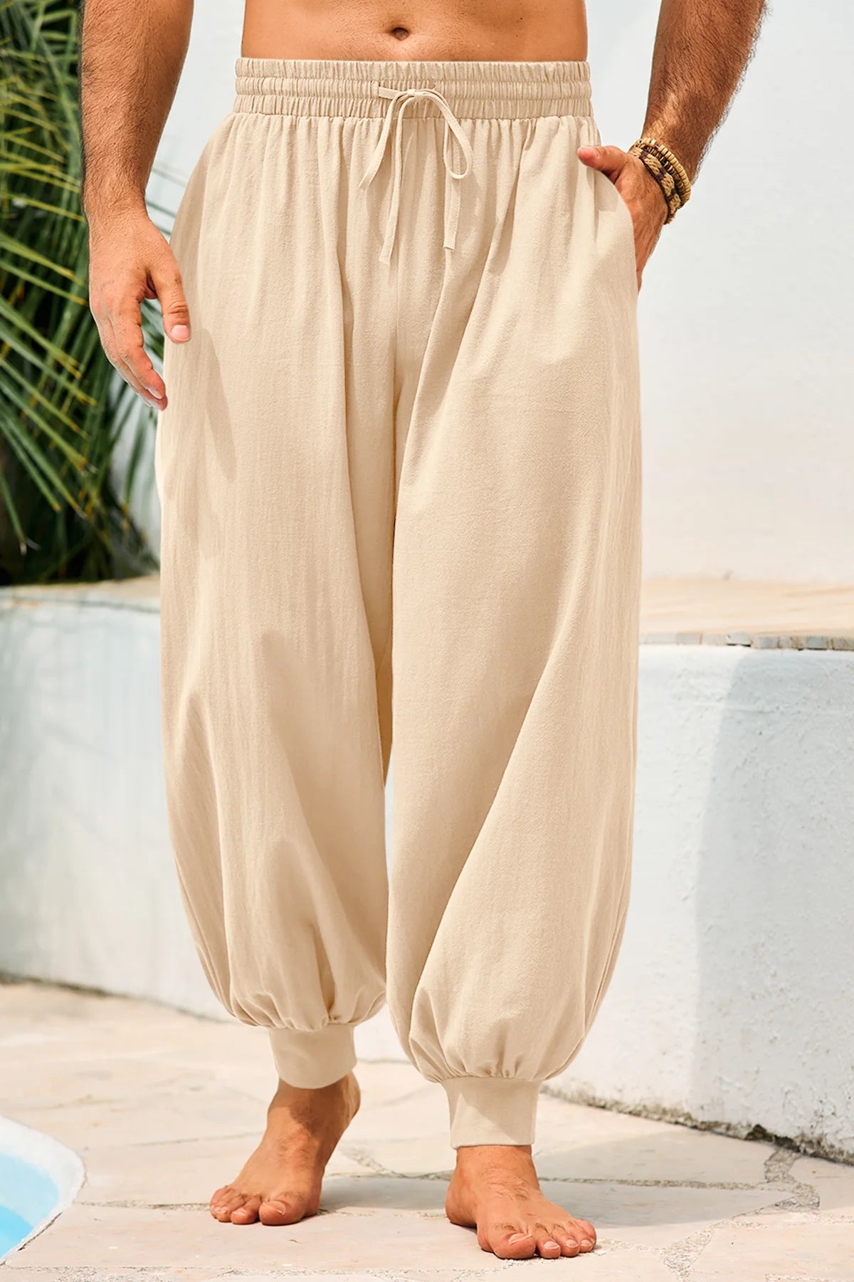 TThese men’s baggy harem pants are comfy and trendy—2 side pockets, elastic waist with drawstring, solid color, loose fit for all-day ease, plus elastic hems for a chill look. Made of good cotton, soft, breathable, light, keeps you cool. Pair with tees, button-downs, sneakers for daily wear, or beach shirts, sandals for vacation. Great for yoga, travel, beach, home, holidays—even pirate cosplay or Halloween, works all year.