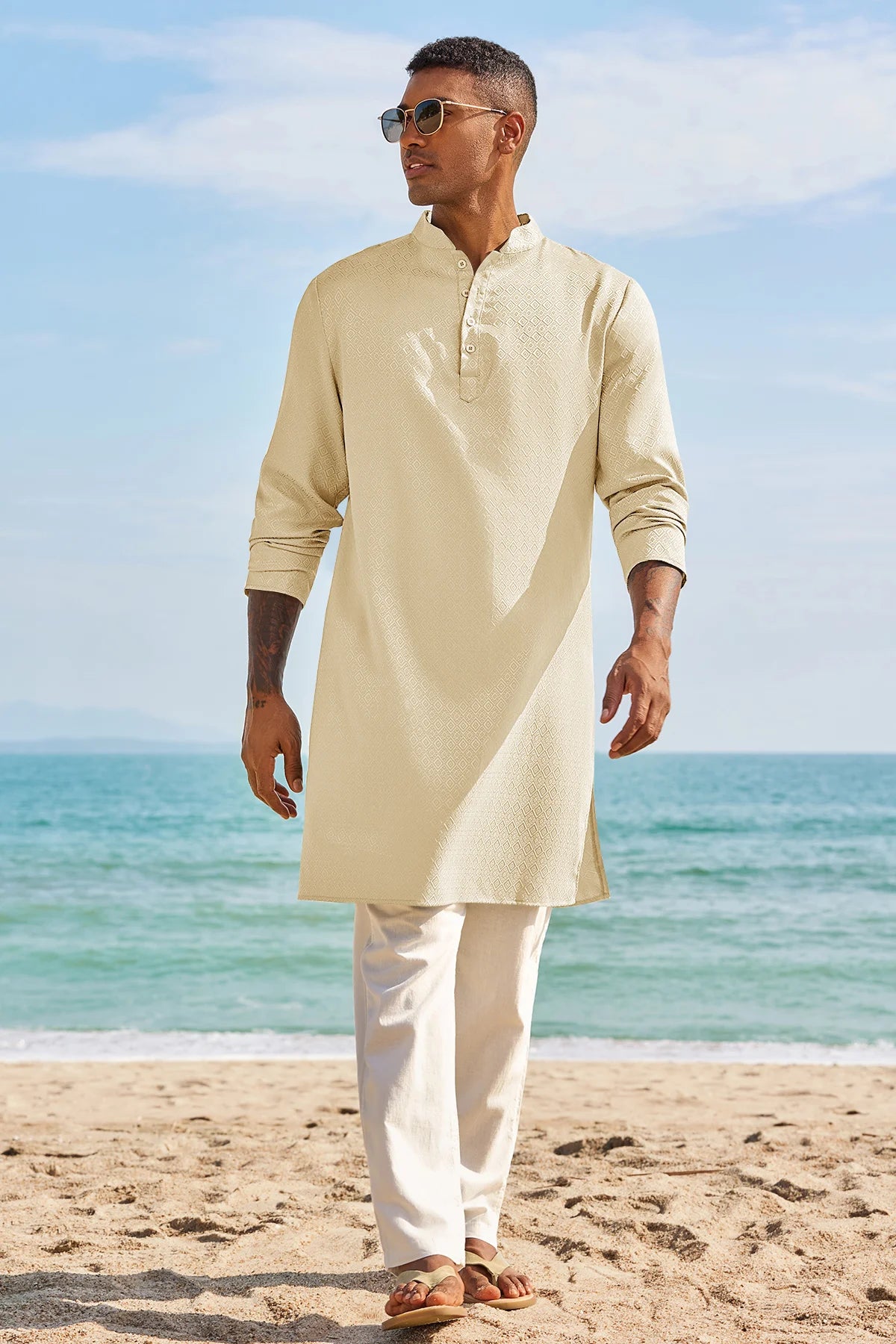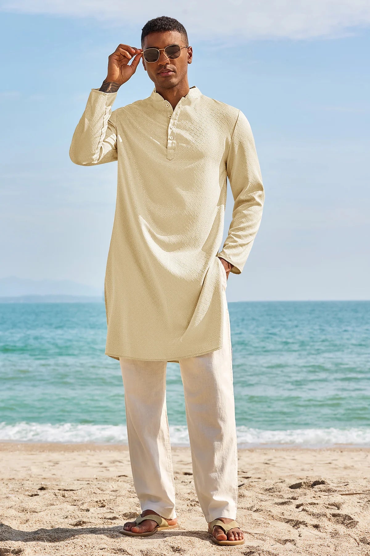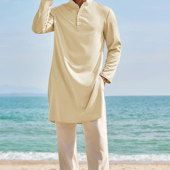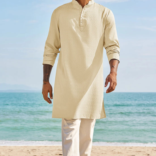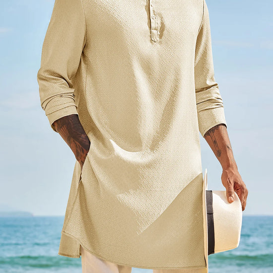 Elevate your wardrobe with Runcati Men’s Long Sleeve Kaftan Robe—blending traditional charm with contemporary comfort. This textured thobe features a Henley neck, banded collar, and loose fit, paired with side splits and knee length for ease of movement. Crafted from 98% polyester and 2% elastane, it’s soft, breathable, and lightweight, ideal for year-round wear.