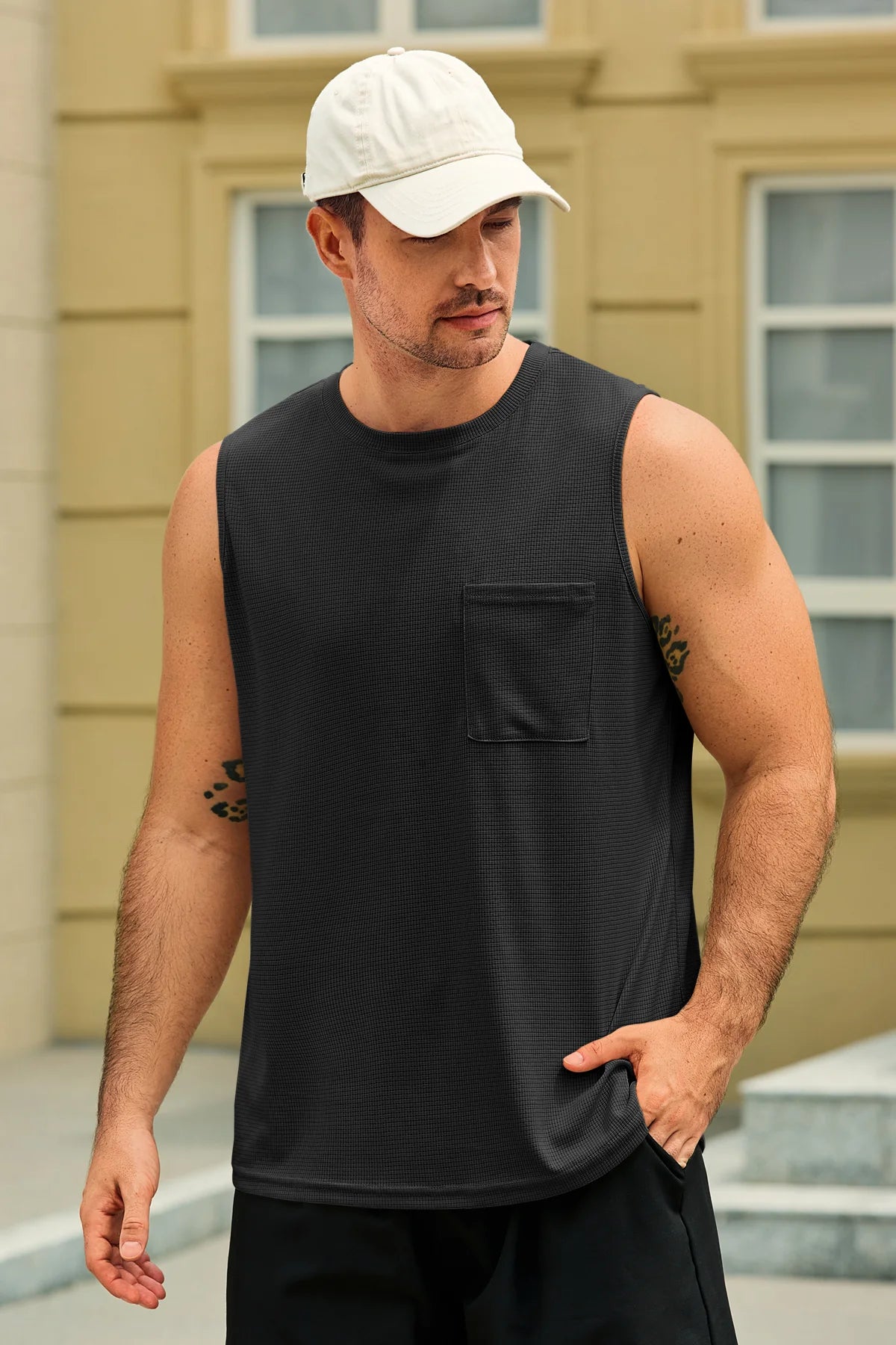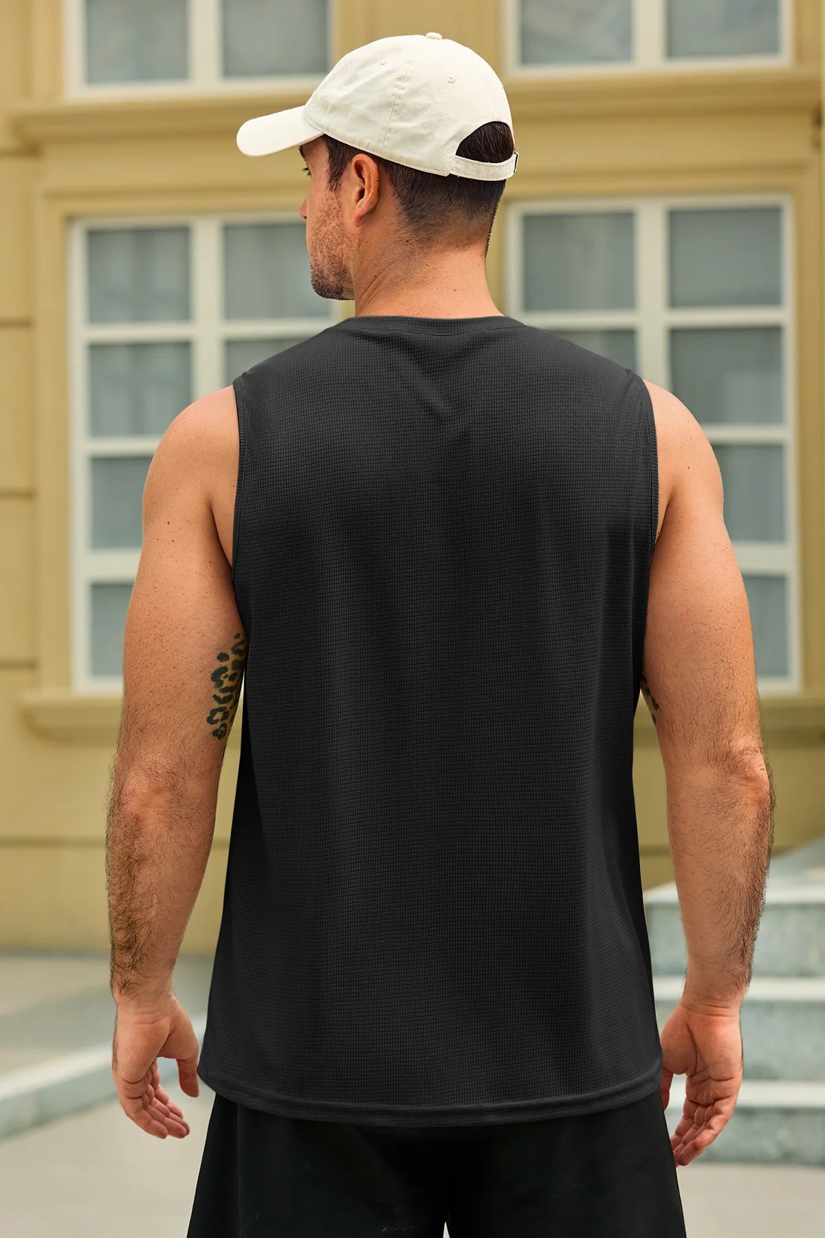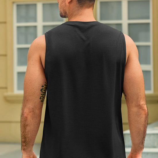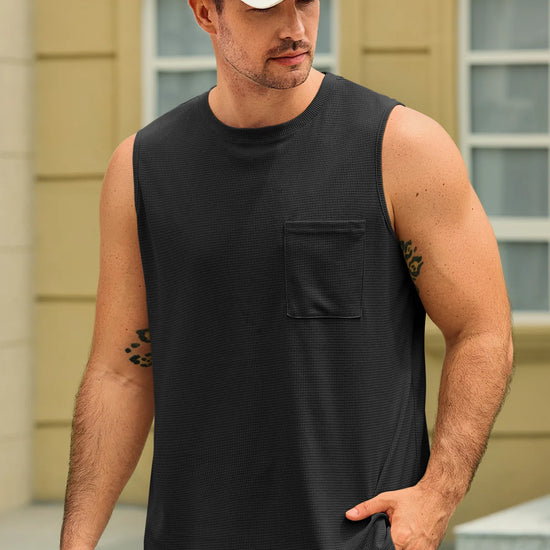 Men's summer beach casual tank tops feature a round neck, sleeveless design, waffle jacquard texture, loose fit, straight hem, and solid color. Crafted from high-quality fabric, they’re lightweight, soft, skin-friendly, moisture-wicking, and breathable, offering maximum comfort and free movement for workouts, running, or swimming.