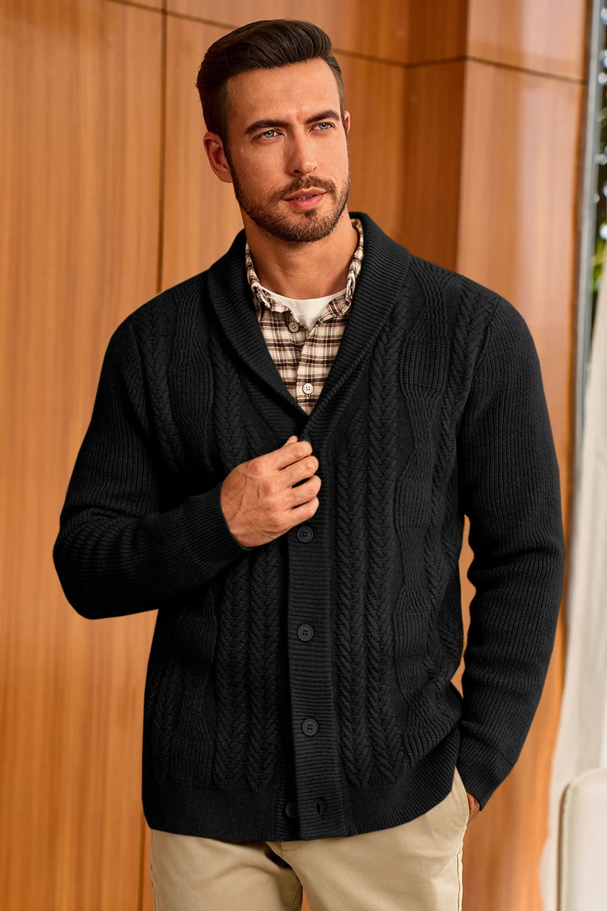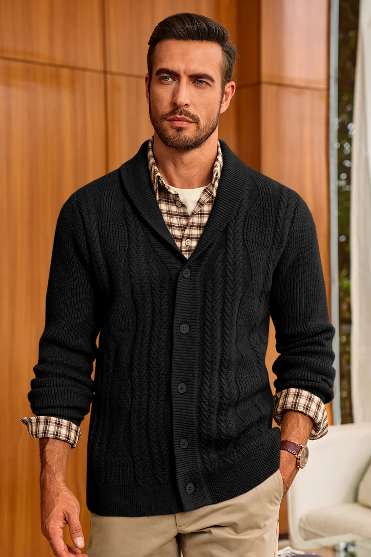 Stay cozy and stylish in this classic cable-knit cardigan! Made from soft, thick fabric, it’s perfect for cool days—whether at home, the office, or a holiday gathering. Layer it over a t-shirt or dress shirt for a casual or polished look. With its shawl collar and regular fit, you’ll feel warm and look great all season. Easy to care for, too! Check the size chart before ordering.