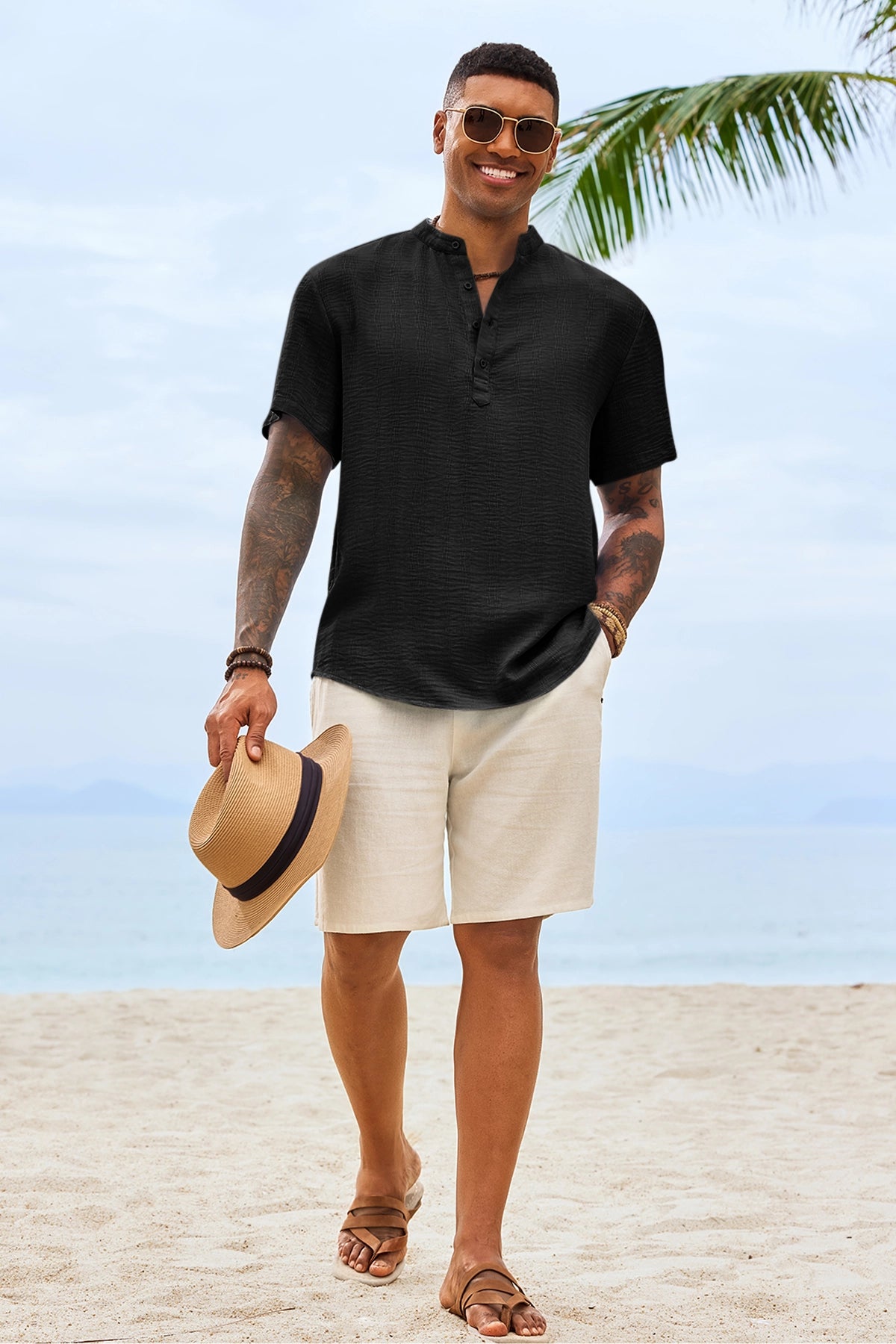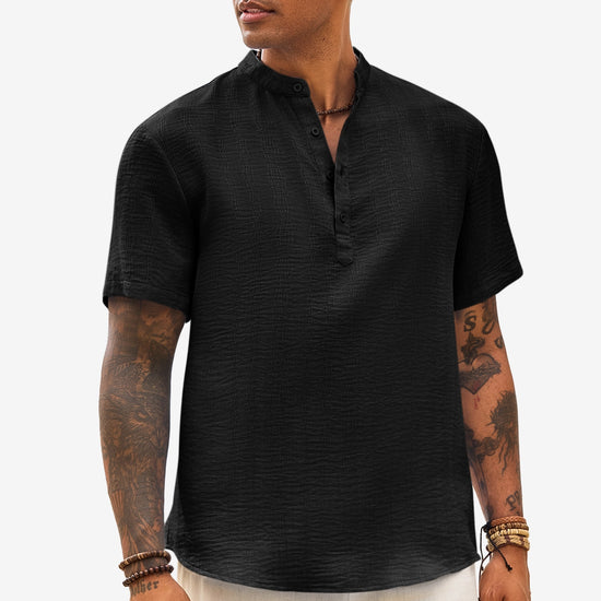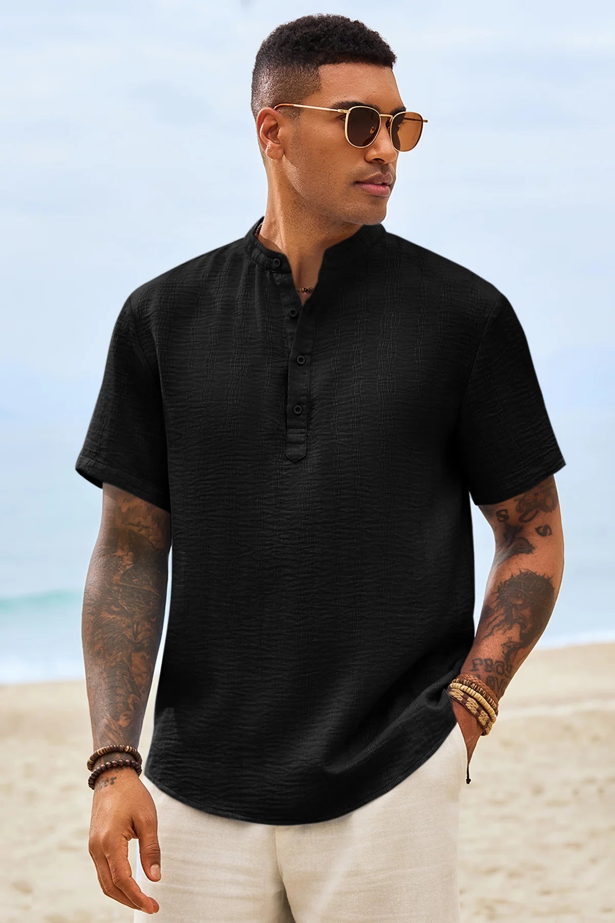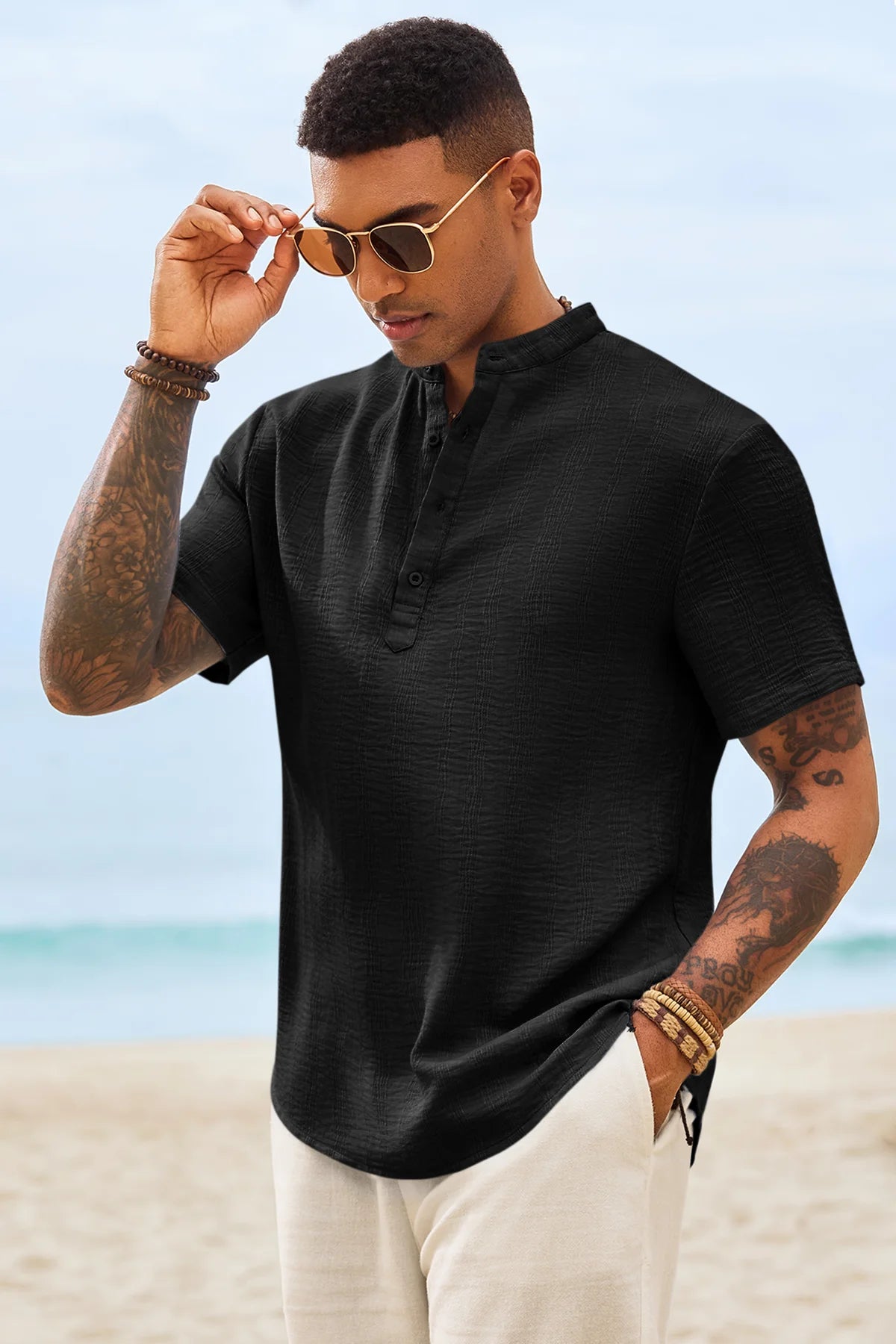Elevate your casual wardrobe with Runcati Men’s Short Sleeve Henley Shirt—crafted for comfort and timeless style. This textured band collar shirt features a classic four-button placket and regular fit, blending hippie vibes with modern versatility. Lightweight and breathable 100% polyester keeps you cool on summer beaches, daily outings, or casual gatherings.