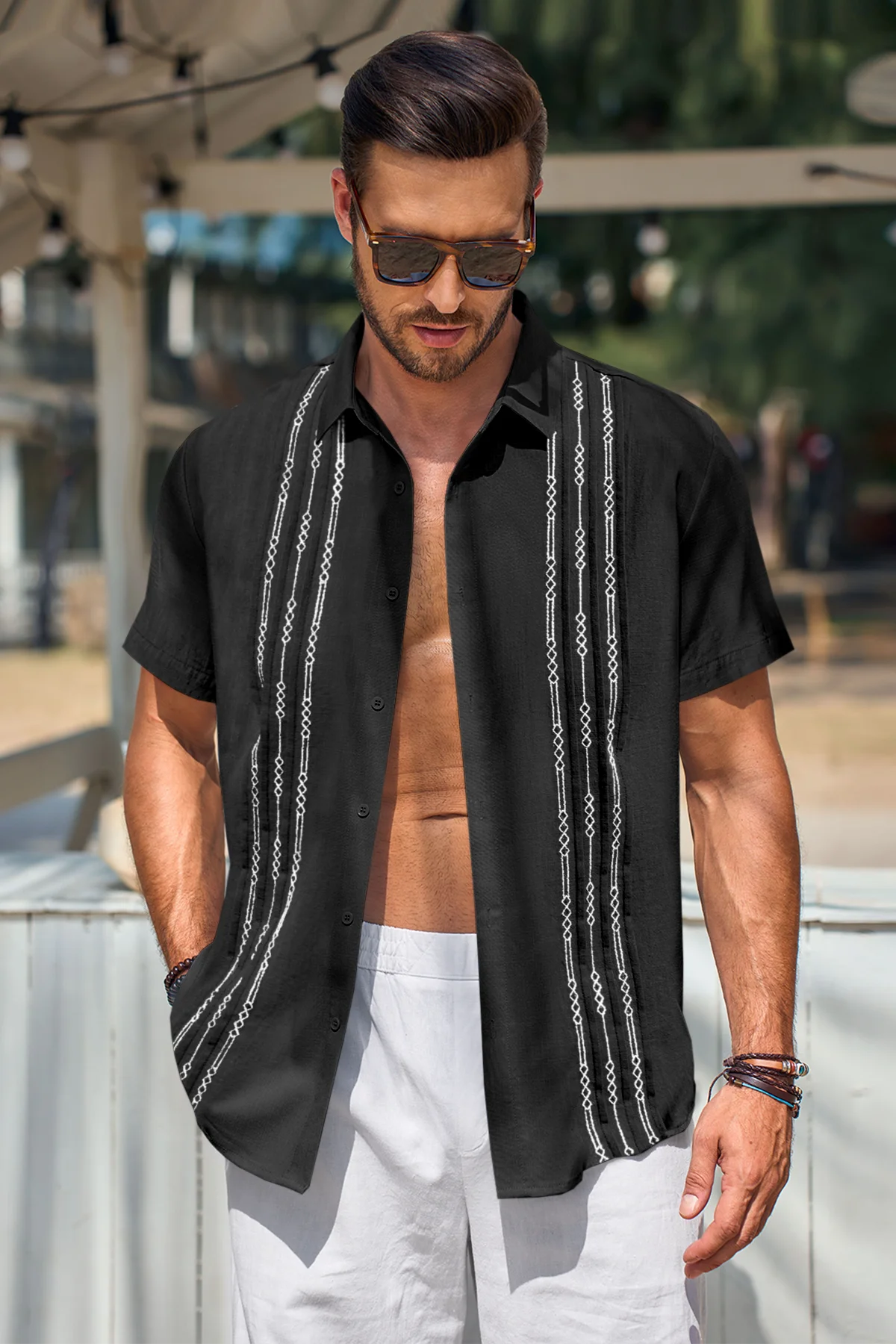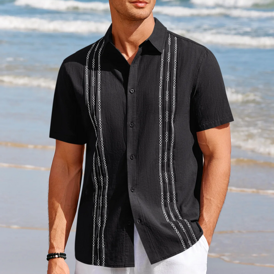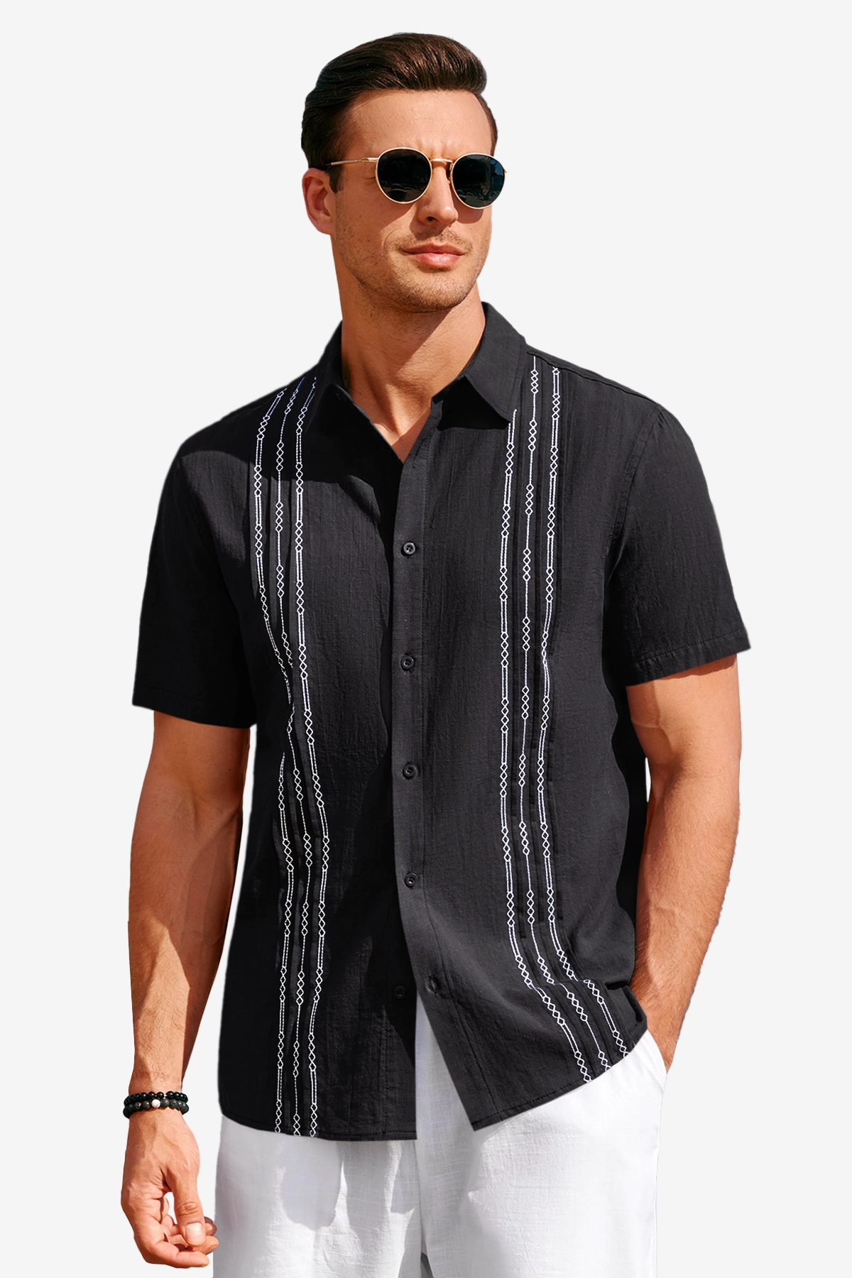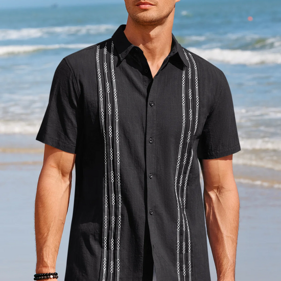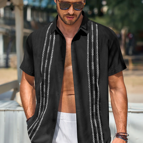 Introducing the Easy Fit Mexican Guayabera shirt – a perfect blend of style and comfort! Made from light linen cotton, it’s designed for a relaxed fit with a classic short sleeve, button-down, v-neck, and spread collar. Featuring elegant embroidery on the sides, it’s great for weddings or casual beach outings. Available in vibrant colors like Black, White, Sky Blue, and more, this shirt is a must-have for any wardrobe!