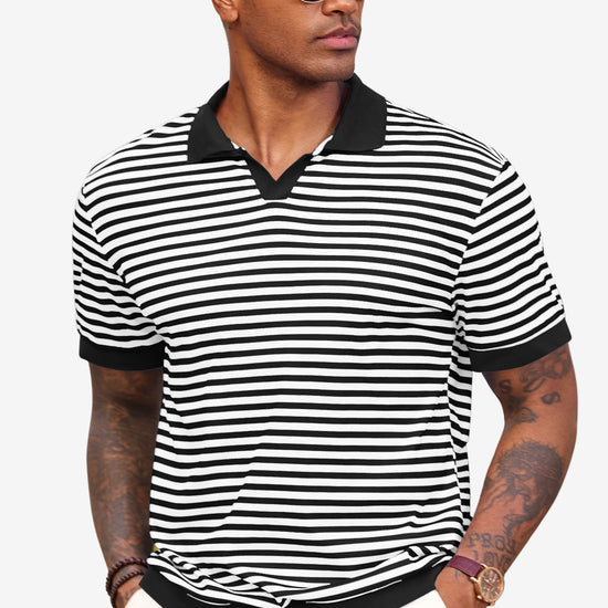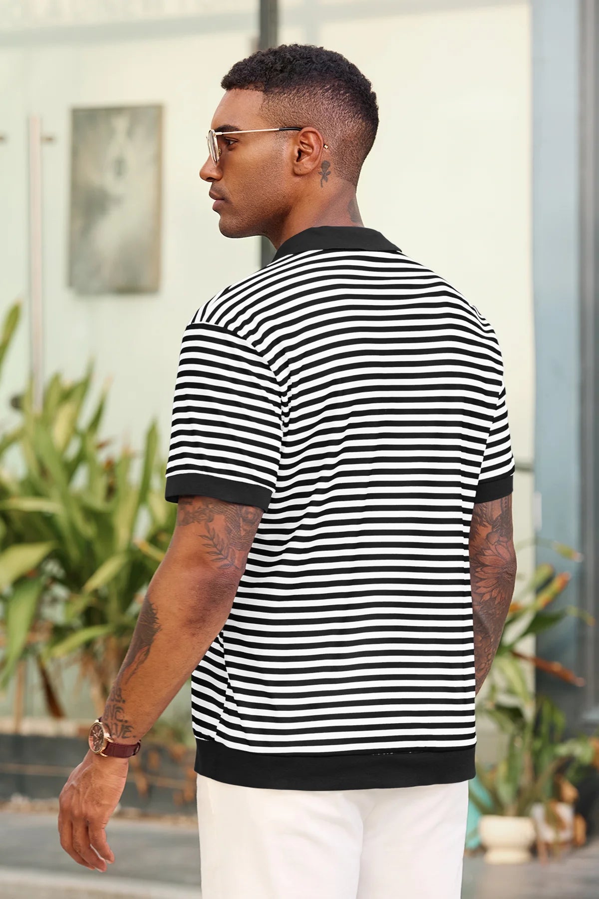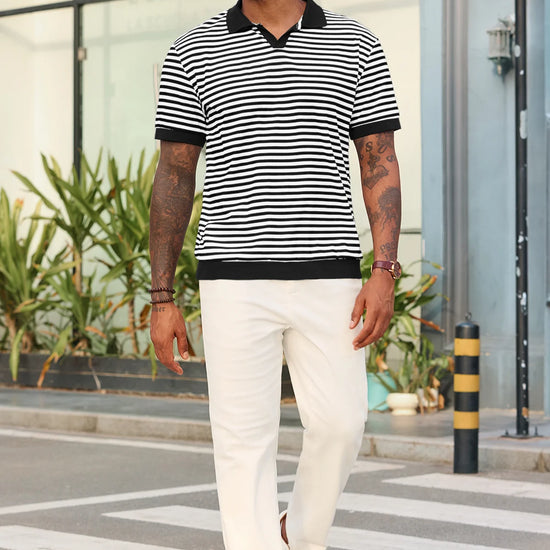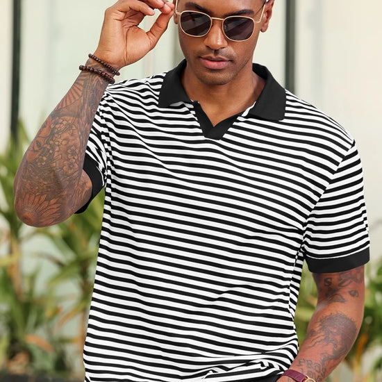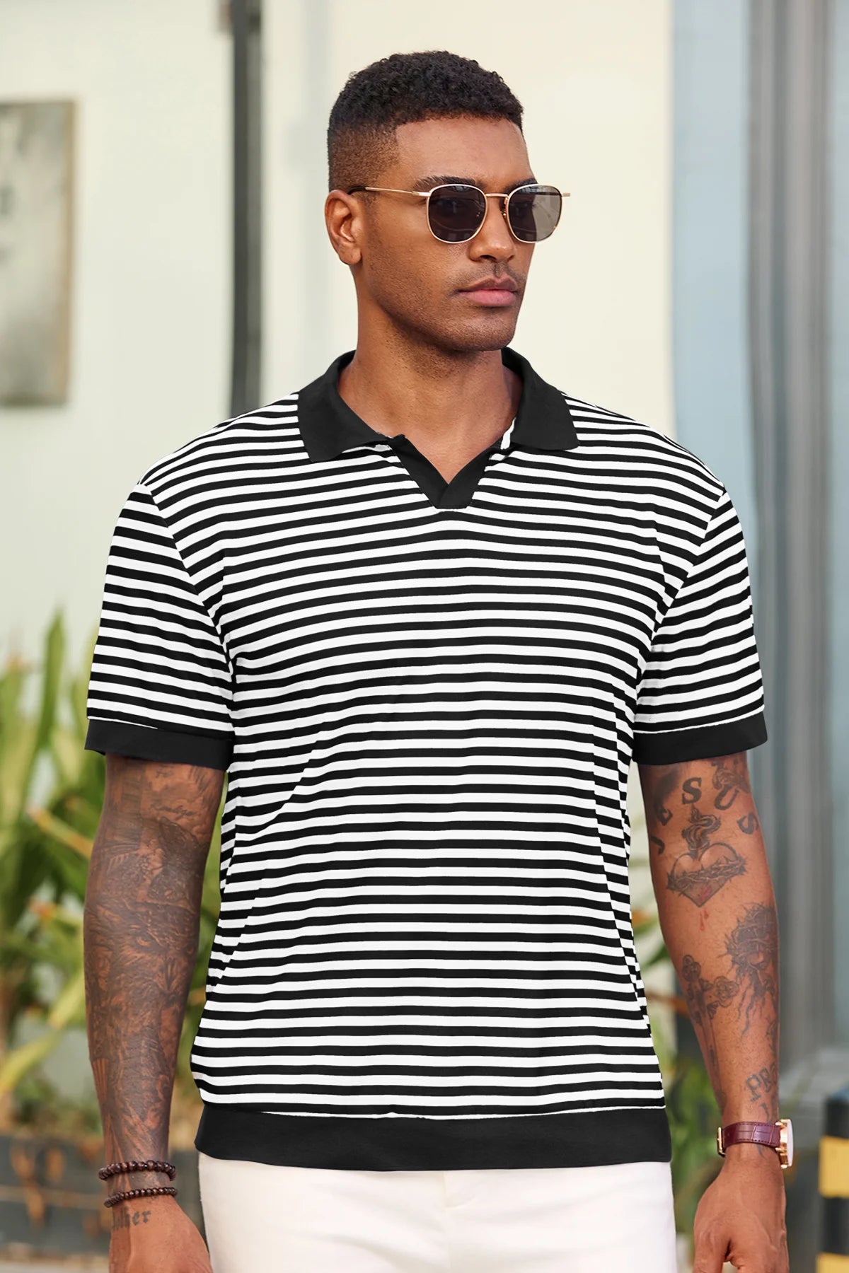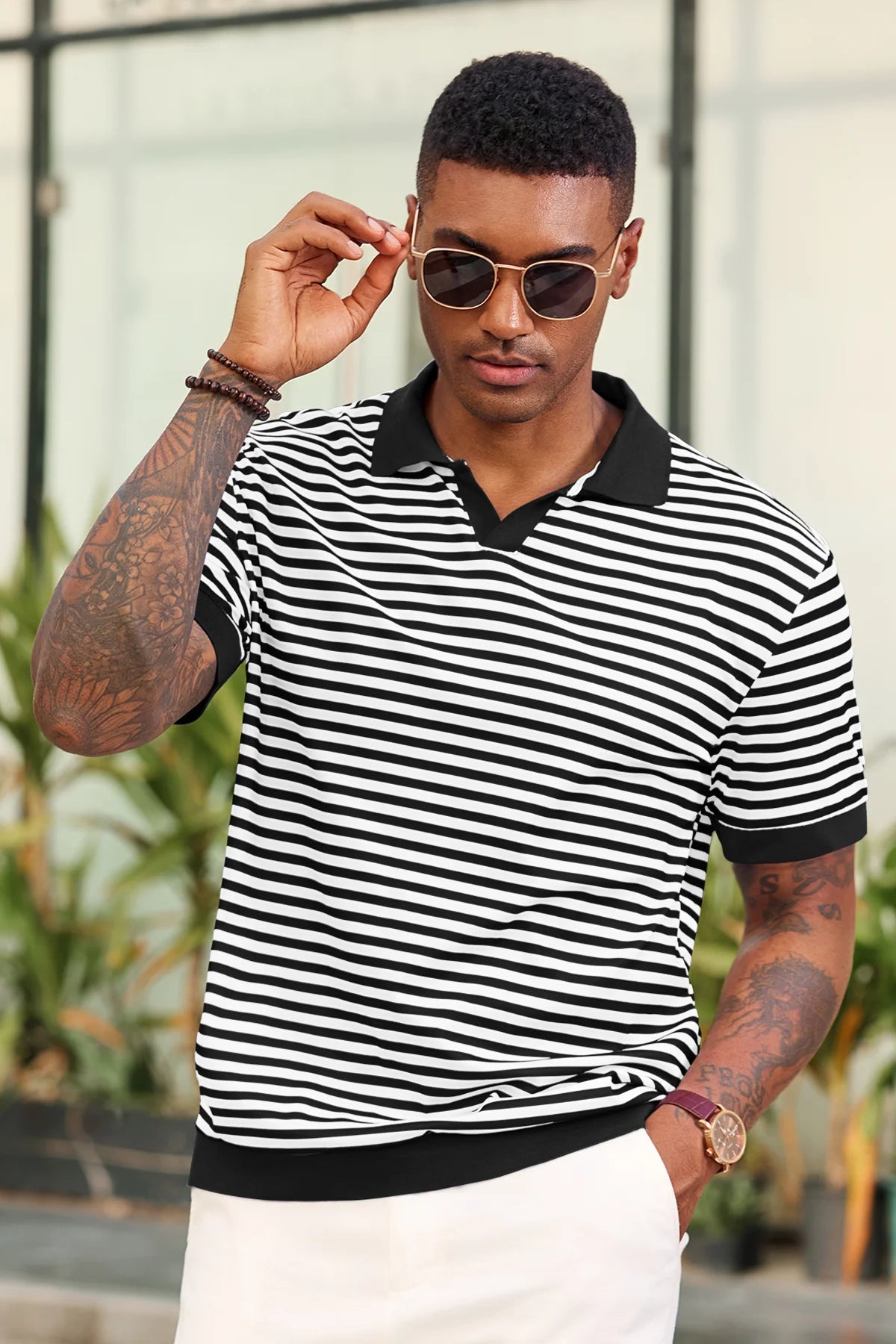 Elevate your wardrobe with Runcati Men’s Short Sleeve Knit Polo Shirt—crafted for comfort and classic style. This 100% polyester polo features a timeless V-neck, resort collar, and striped design, paired with ribbed sleeves and hem for a tailored fit. Soft, stretchy, and breathable, it keeps you cool in hot summer weather while offering versatility for casual or formal moments.