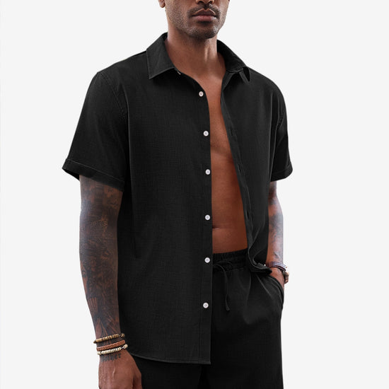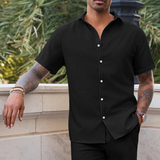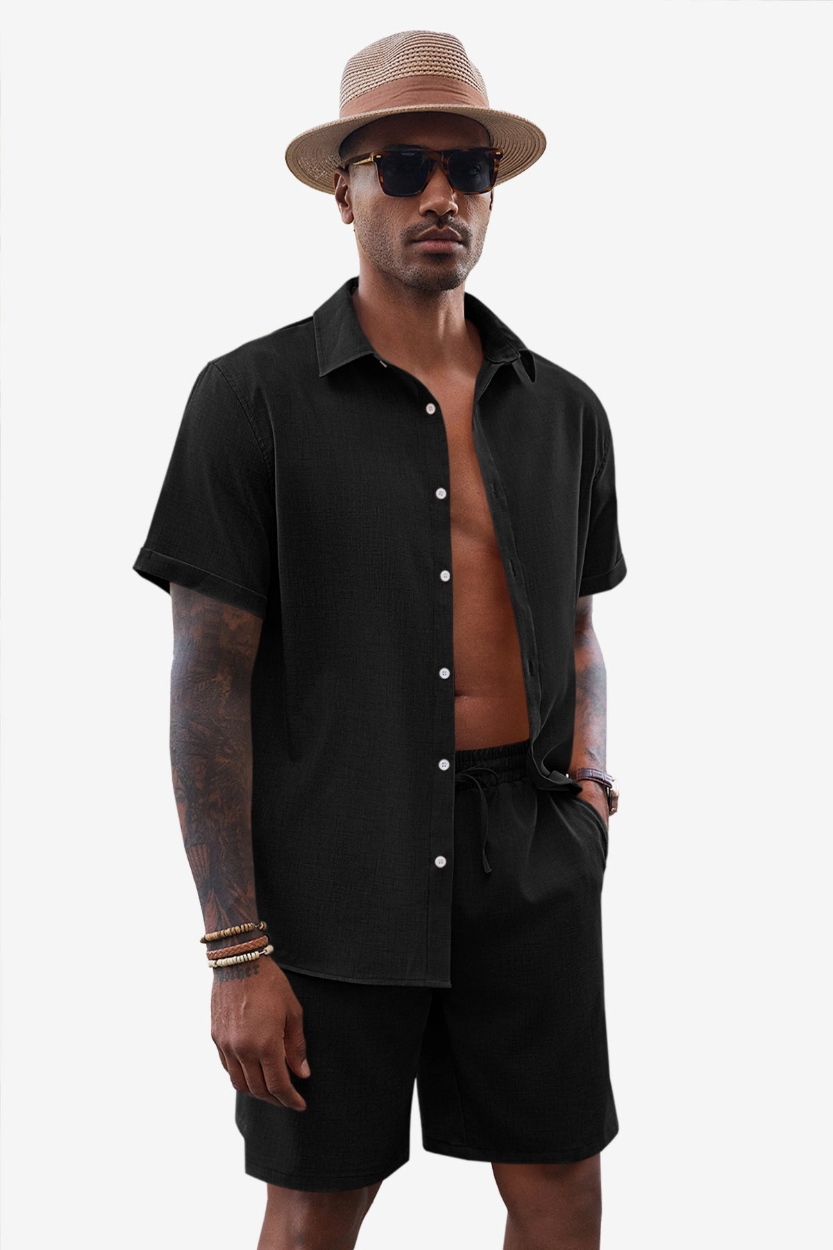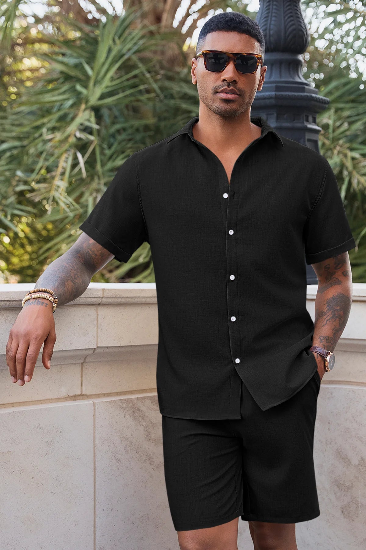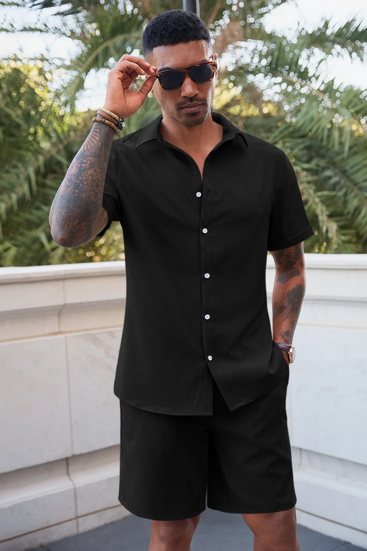 Runcati Mens Black Linen Short Sleeve 2 Piece Sets