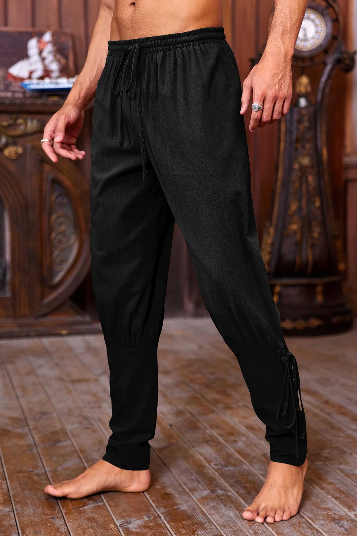 Adjustable Tied Ankles: Functional lace-up cuffs at the calf ensure a secure fit and prevent the pants from riding up.