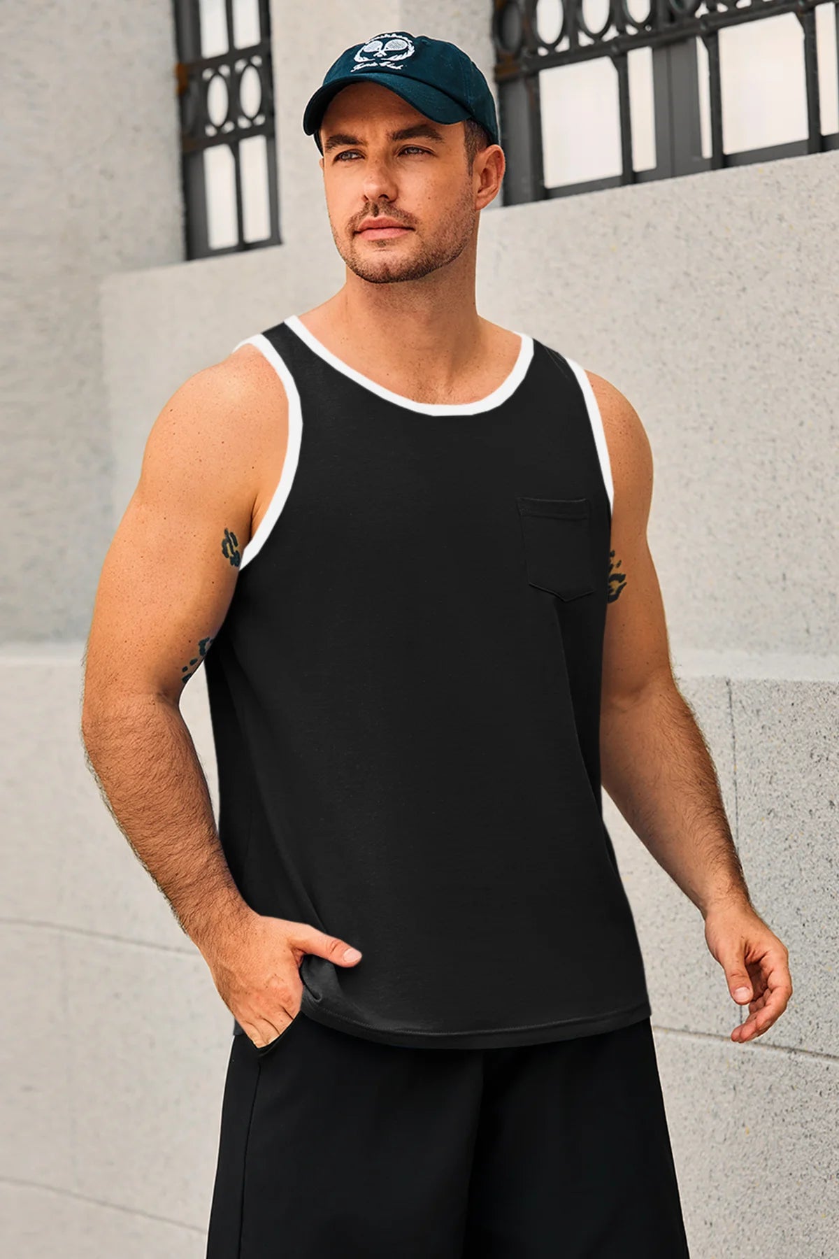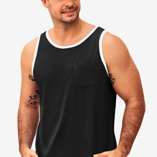 Men's workout athletic tank tops feature crewneck, sleeveless cut-off design, color block, one chest pocket, and loose fit for maximum freedom and comfort—keeping you cool all summer. Crafted from high-quality cotton blend, the sleeveless tee is breathable, soft, lightweight, skin-friendly, and quick-drying to keep you dry during intense workouts.