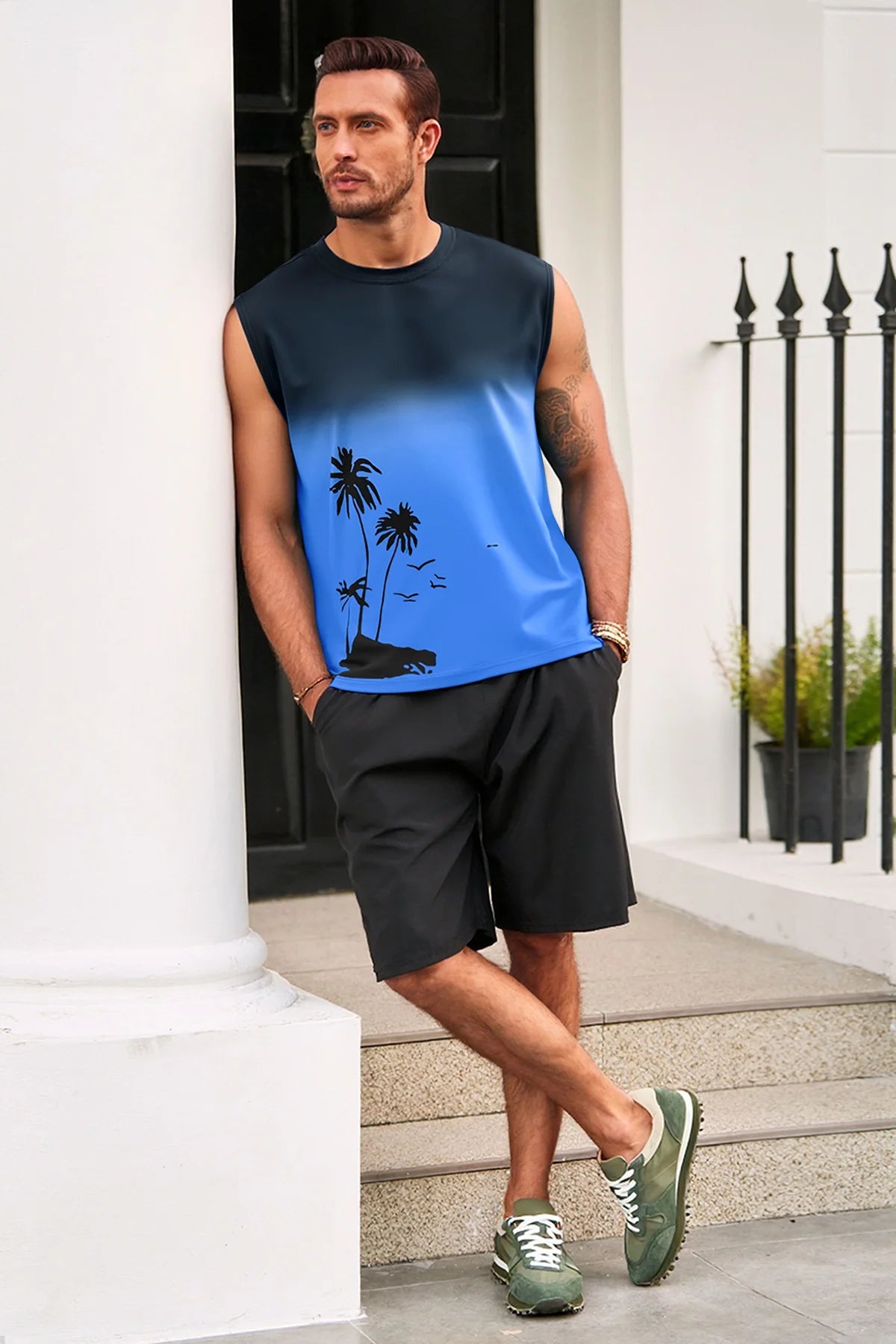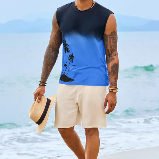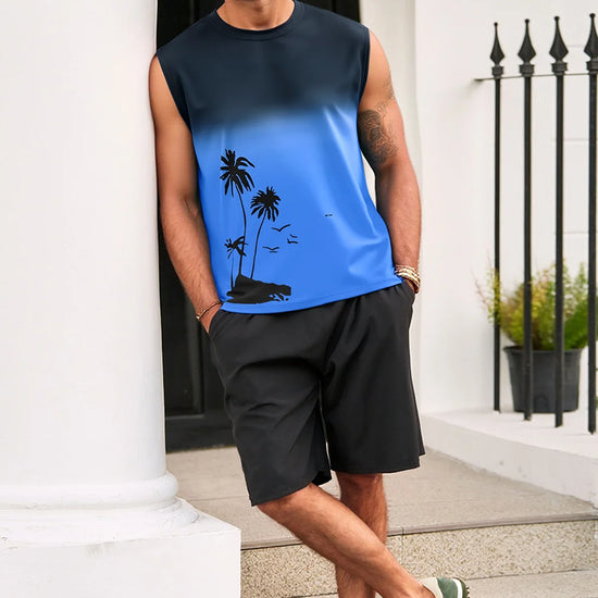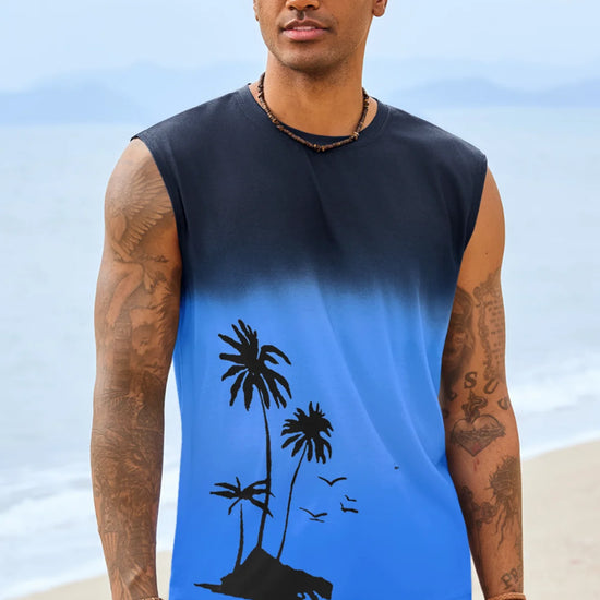 Elevate your summer vibe with this Runcati men's graphic tank top. Featuring a striking palm tree gradient print, this sleeveless shirt blends retro Hawaiian aesthetics with a modern muscle fit. Whether you're hitting the gym or heading to a beach bonfire, its moisture-wicking fabric ensures you stay cool, dry, and stylish under the sun.