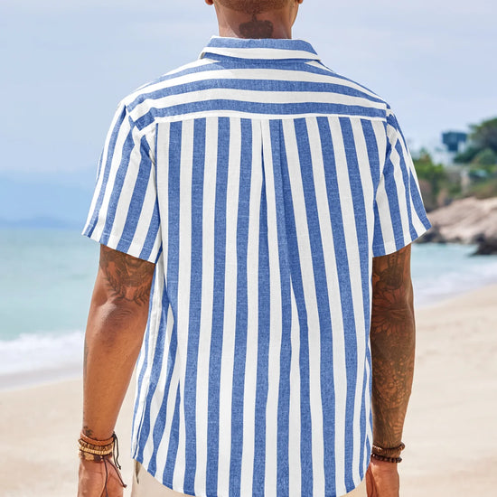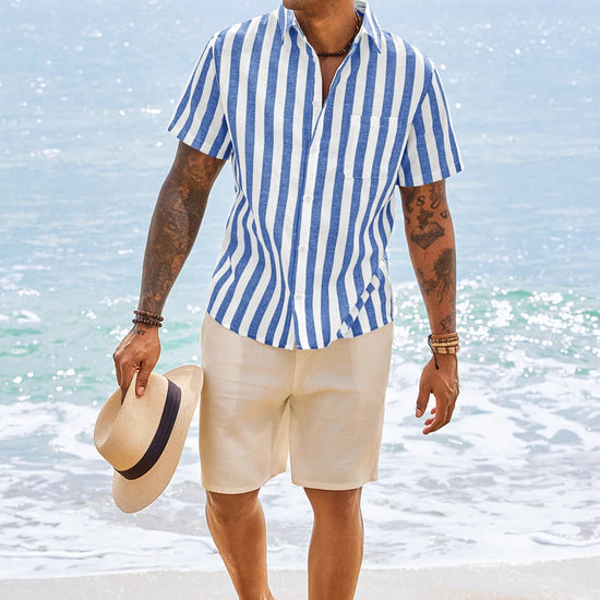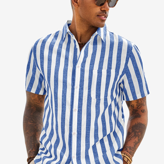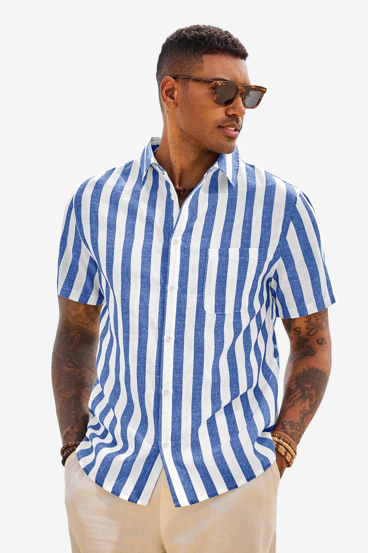 Introducing the men’s casual stripe shirt – a timeless blend of style and comfort! It features classic timeless stripe patterns (available in slim or wide stripe options) for versatile appeal. Designed with a relaxed fit, short sleeves, button-down closure, and spread collar, it’s perfect for business casual, beach outings, weddings, or daily wear. A wardrobe staple that balances sophistication and ease!