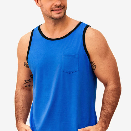 Men's workout athletic tank tops feature crewneck, sleeveless cut-off design, color block, one chest pocket, and loose fit for maximum freedom and comfort—keeping you cool all summer. Crafted from high-quality cotton blend, the sleeveless tee is breathable, soft, lightweight, skin-friendly, and quick-drying to keep you dry during intense workouts.