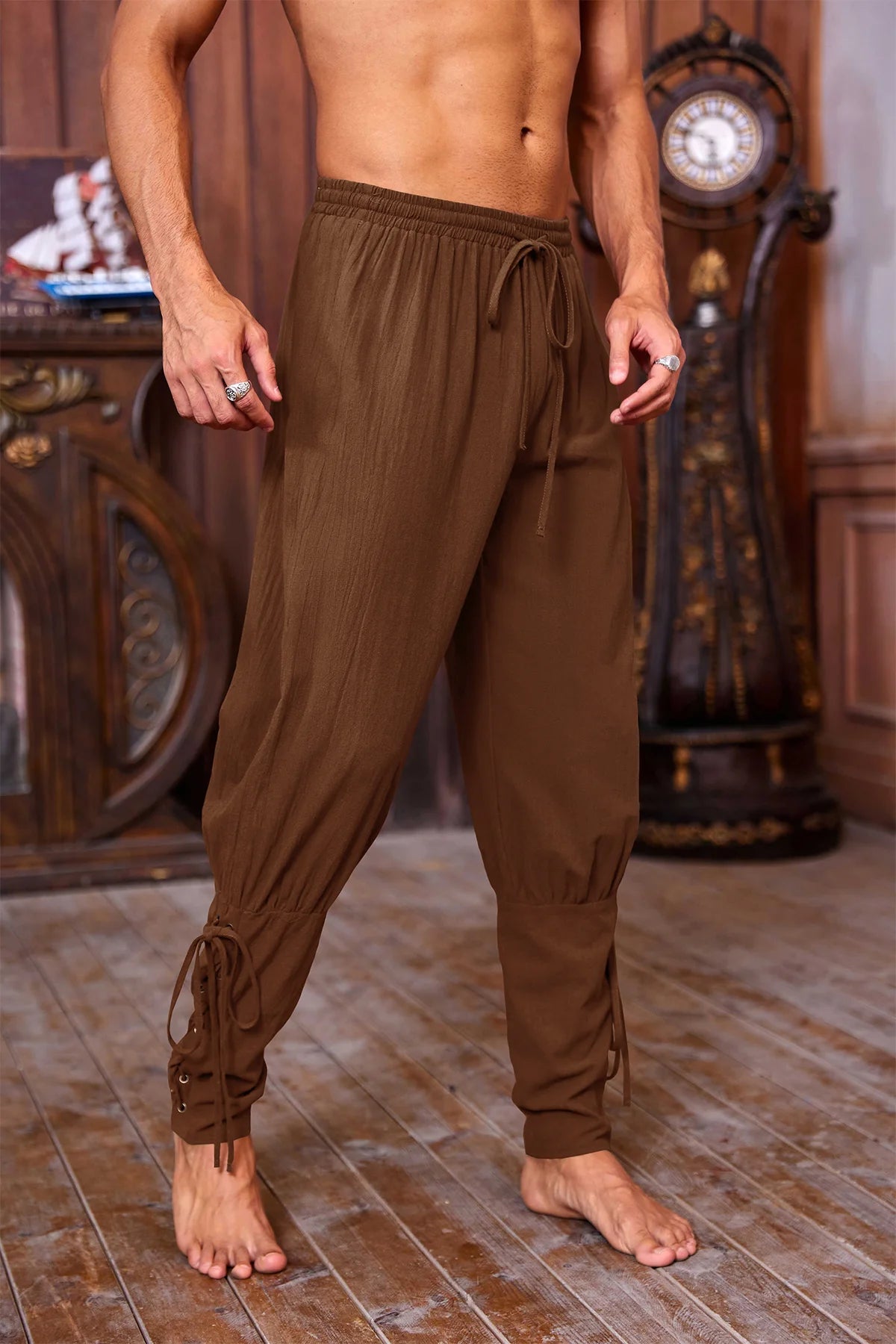To preserve the integrity of the lace-up details and the fabric's texture, these pants are Hand Wash Only. Avoid using bleach. Hang or lay flat to dry in the shade to maintain the rich color and prevent shrinkage. Please consult our size chart to ensure the perfect fit for your specific costume or casual needs.