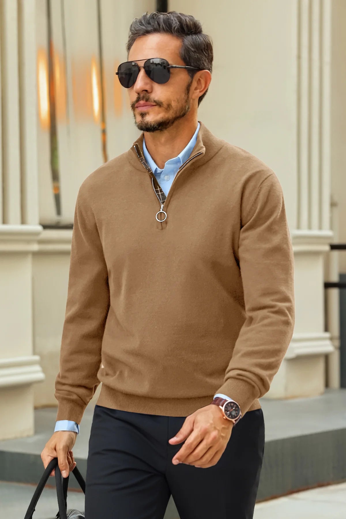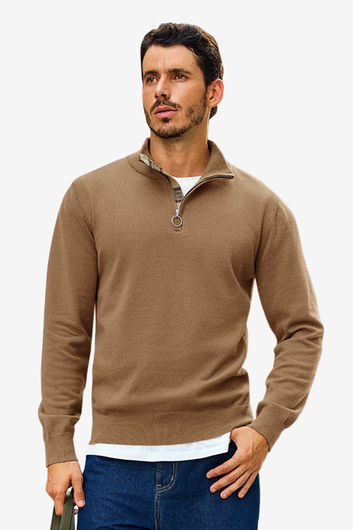 Check out this stylish men's lightweight pullover sweater! With a slim fit, long sleeves, and a half zip mock neck, it’s both comfy and trendy. The unique plaid patchwork collar adds a cool touch. Perfect for casual outings or dressing up over a shirt, it pairs well with jeans or chinos. Made from soft, stretchy fabric, it's warm yet breathable.
