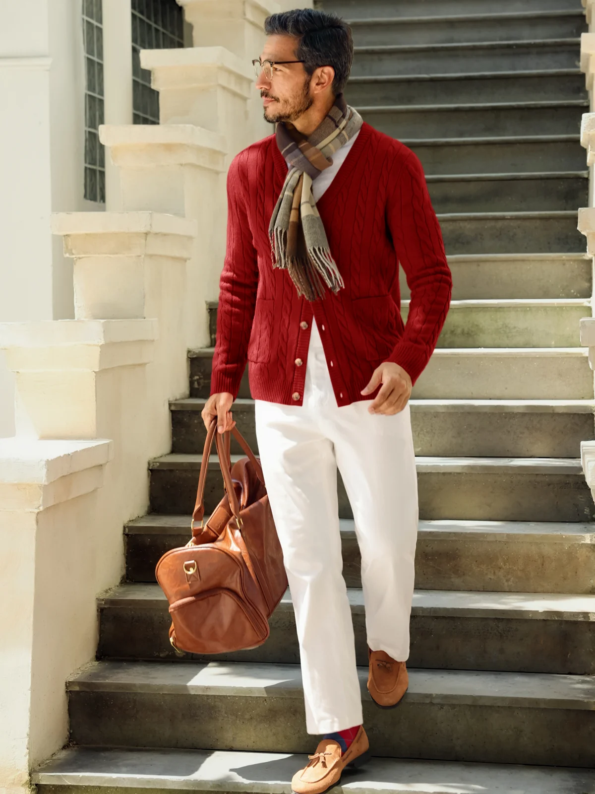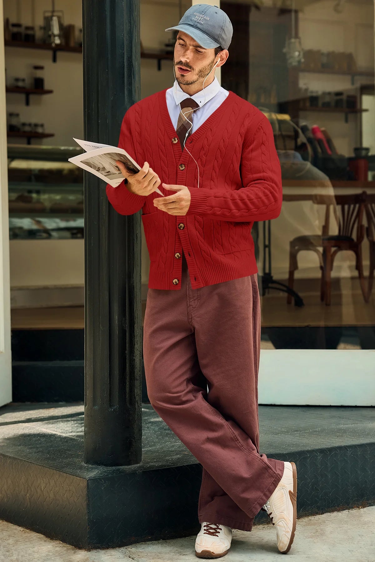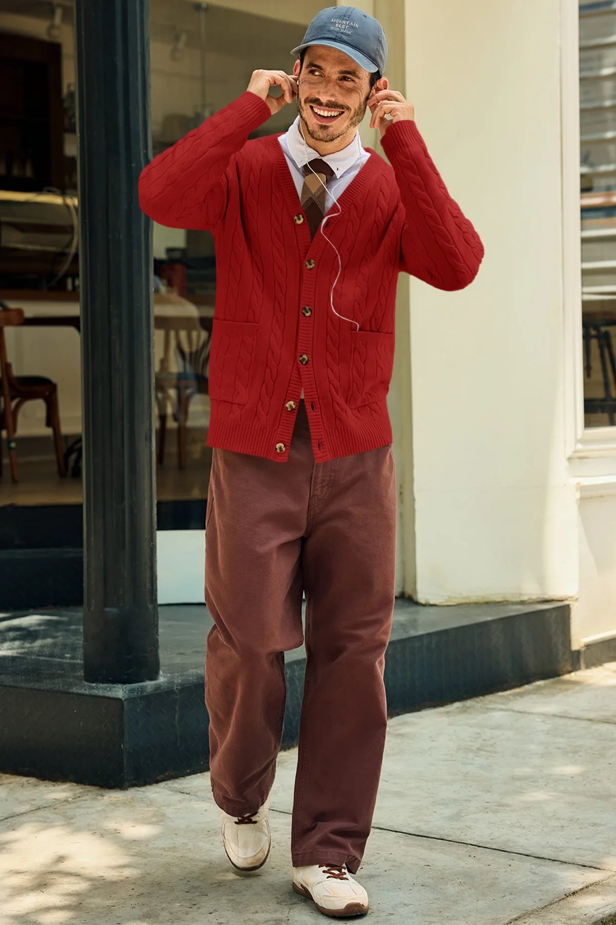 This stylish men's cardigan sweater features a classic V-neck, intricate cable knit design, and two handy patch pockets. Made from soft, quality fabric, it offers lightweight warmth and all-day comfort. Perfect for any occasion, dress it up with a formal shirt or keep it casual with a tee. Plus, it's machine washable for easy care and durability, making it a must-have in your wardrobe!
