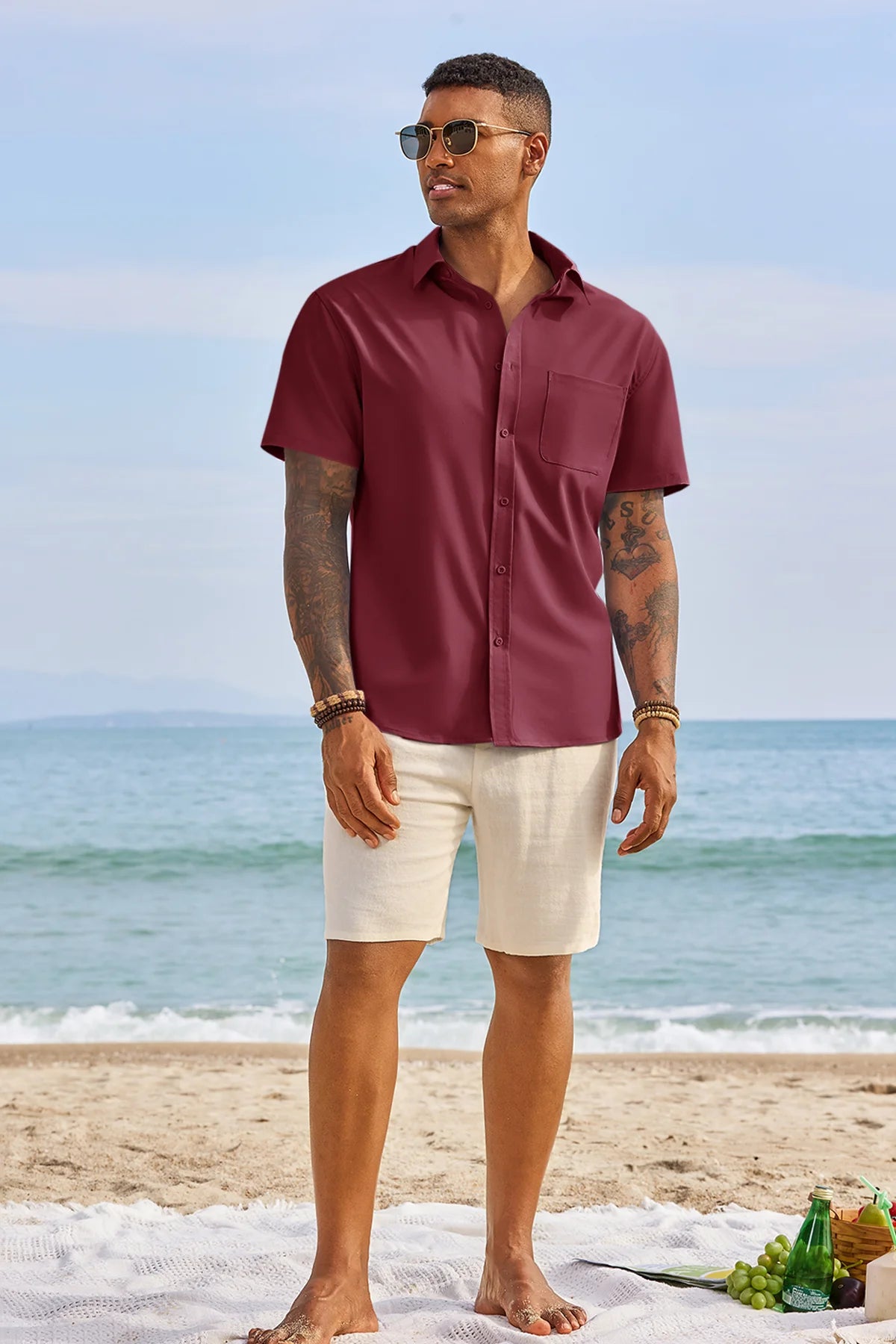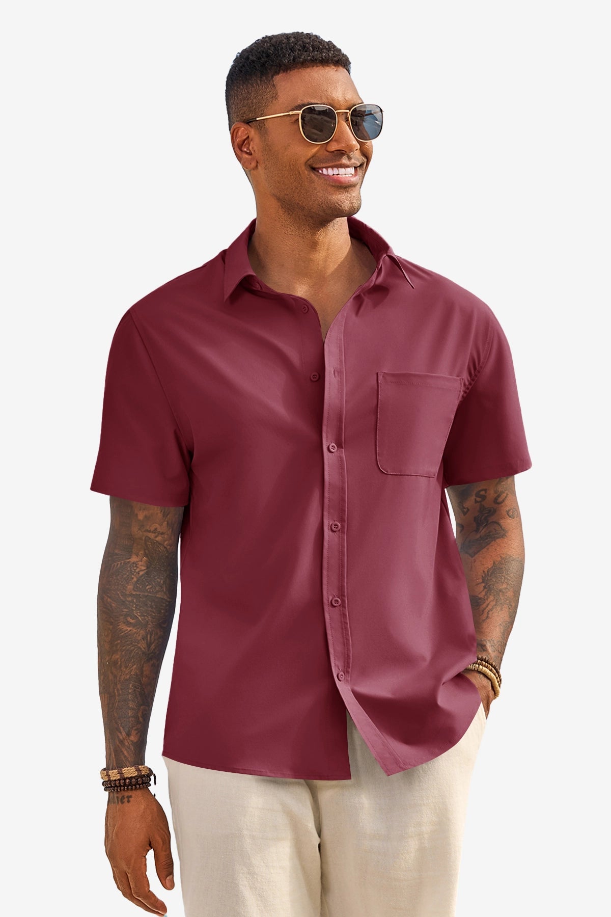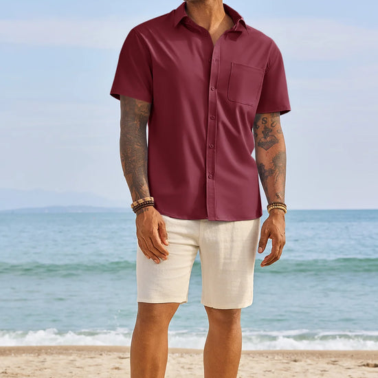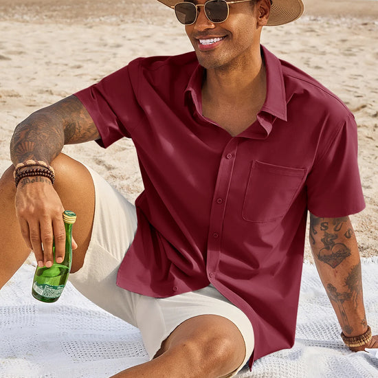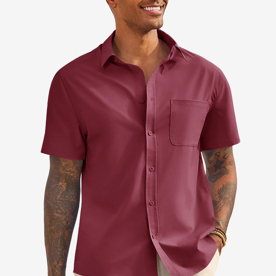 Runcati Mens Burgundy Short Sleeve Casual Dress Shirt