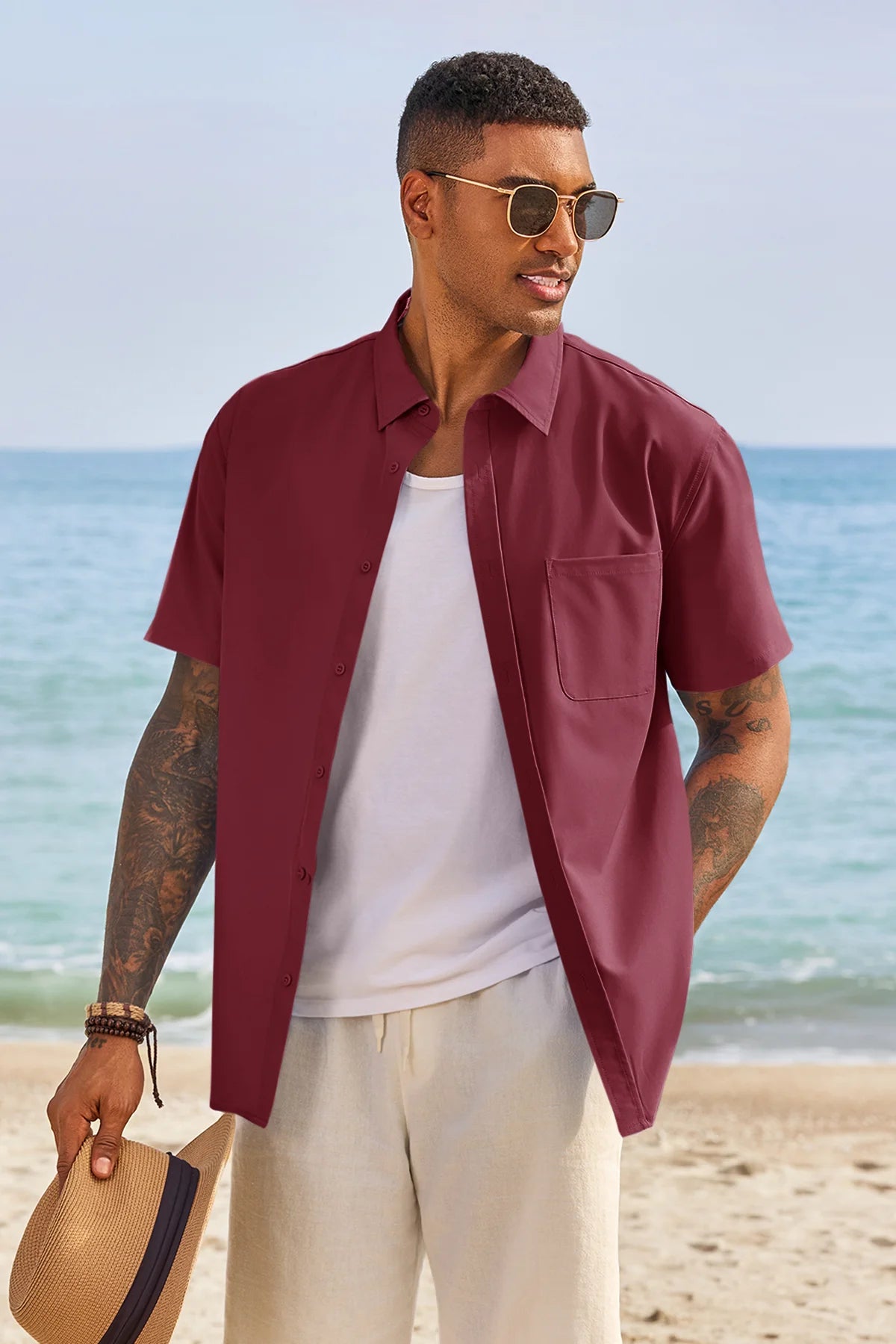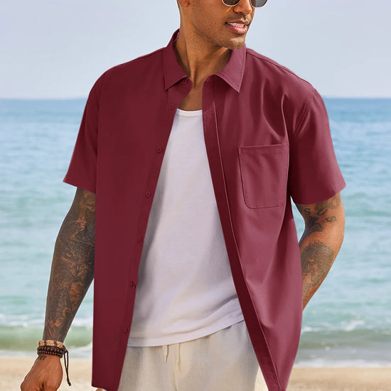 Design: Classic solid-color aesthetic with a functional chest pocket and button-front closure.