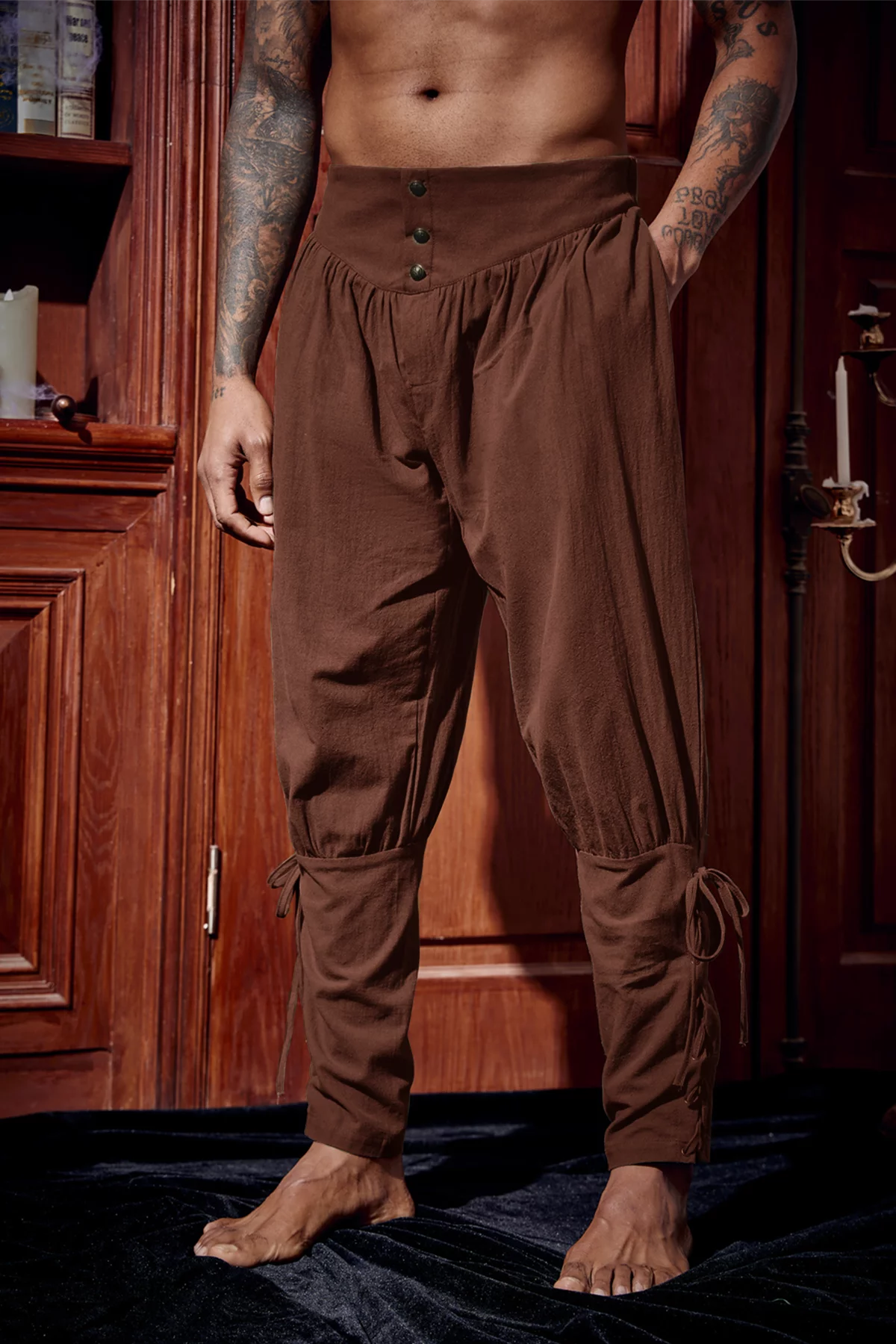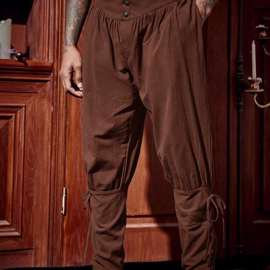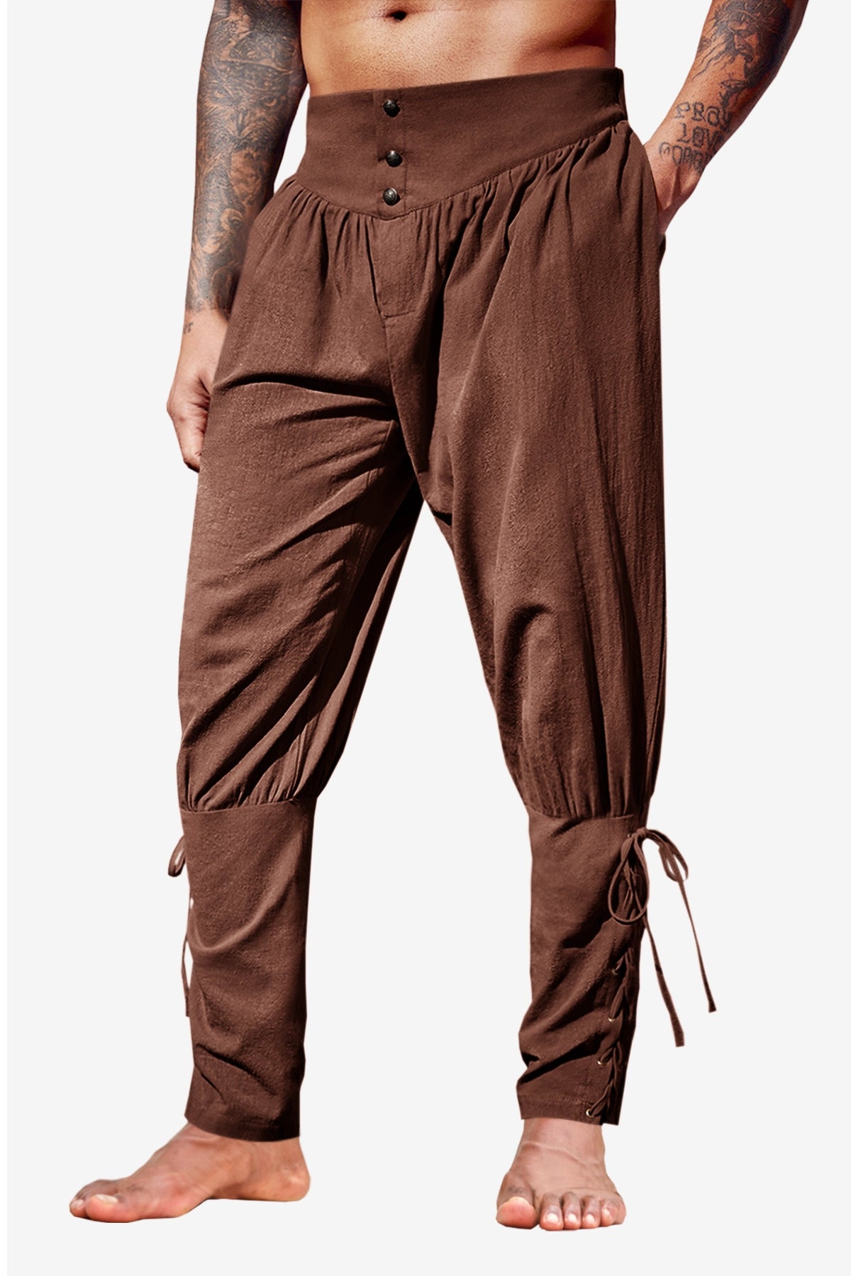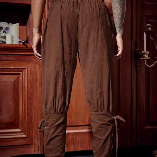 Check out these Renaissance pirate costume pants! They feature a comfy elastic waist, stylish button decoration, and lace-up cuffs, making them perfect for movement. Made from soft linen and cotton, they feel great against your skin. Ideal for Halloween, cosplay, or medieval events. Pair them with a pirate shirt and accessories like a hat and sword for an eye-catching look. Easy to care for—just hand wash or machine wash at room temp.