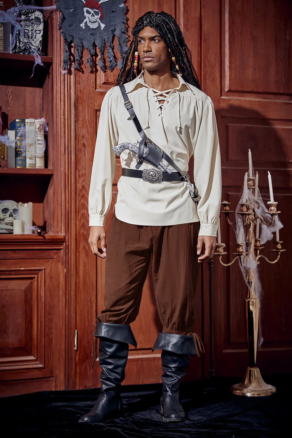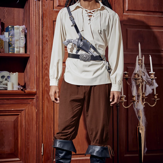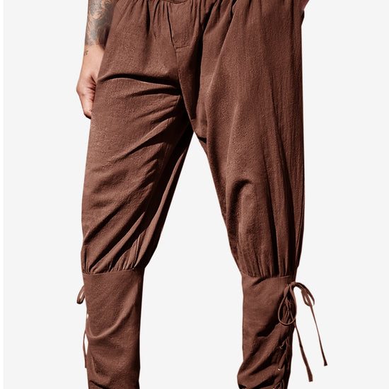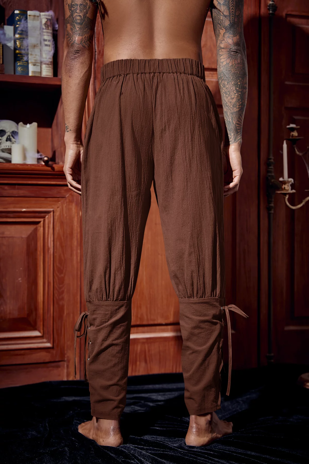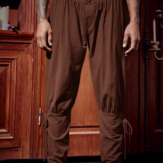 Check out these Renaissance pirate costume pants! They feature a comfy elastic waist, stylish button decoration, and lace-up cuffs, making them perfect for movement. Made from soft linen and cotton, they feel great against your skin. Ideal for Halloween, cosplay, or medieval events. Pair them with a pirate shirt and accessories like a hat and sword for an eye-catching look. Easy to care for—just hand wash or machine wash at room temp.