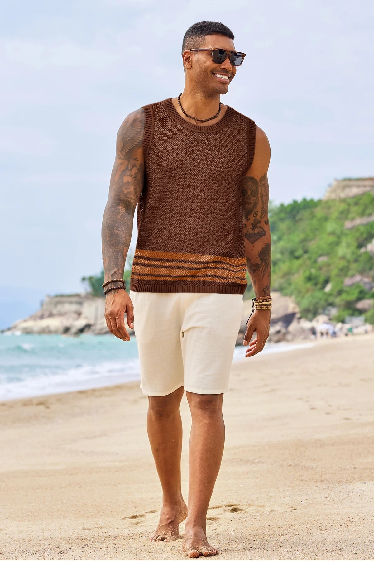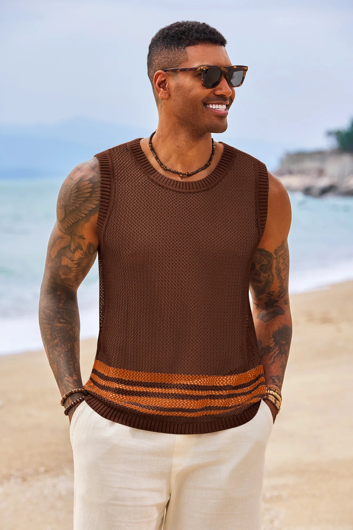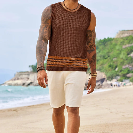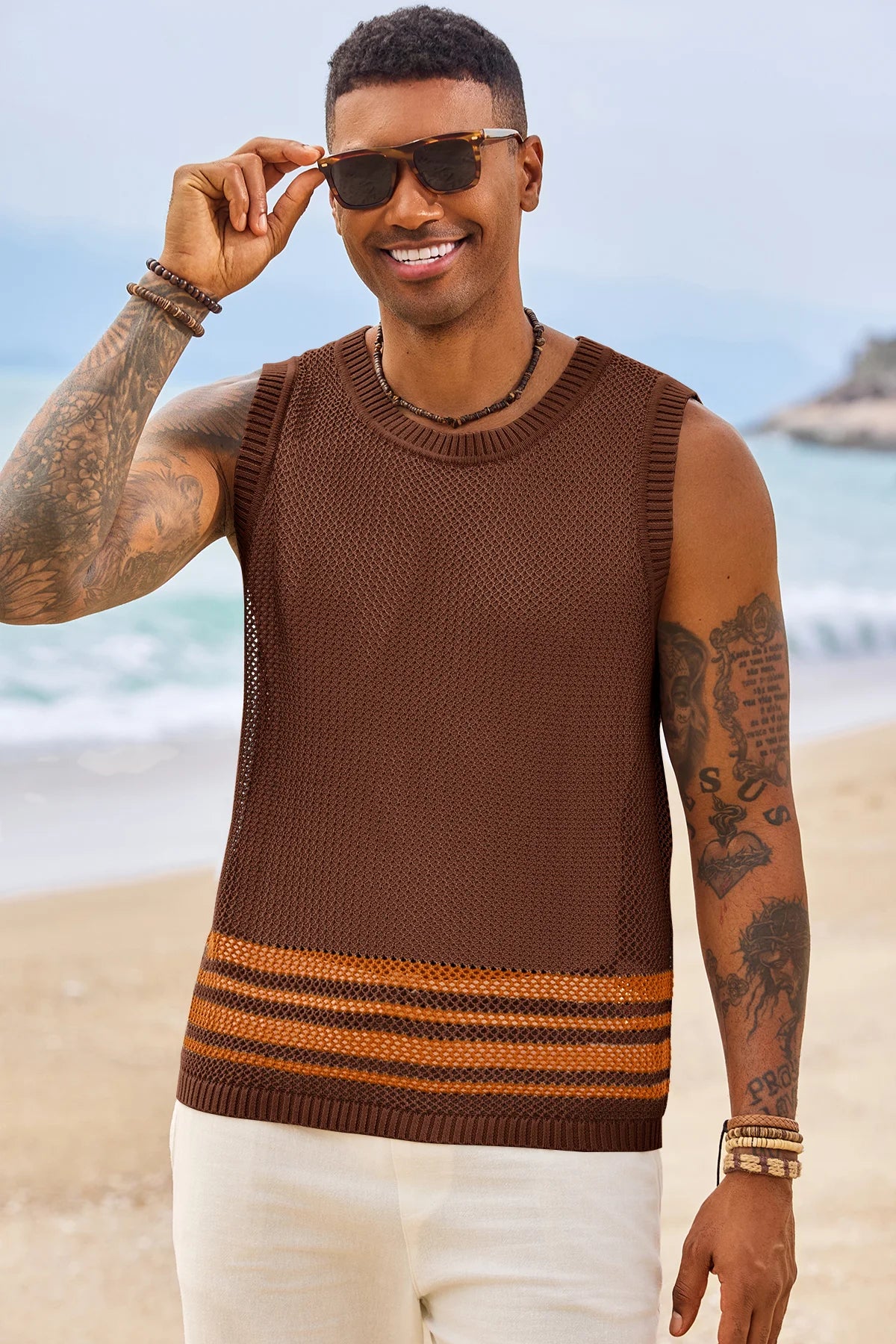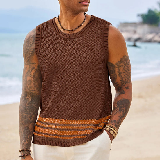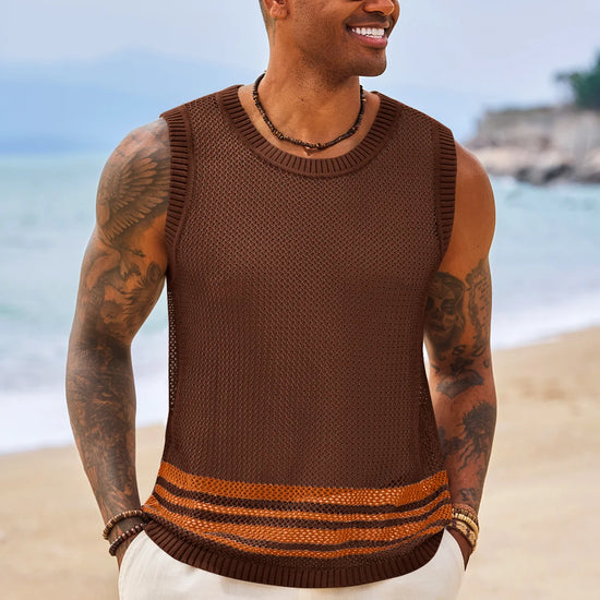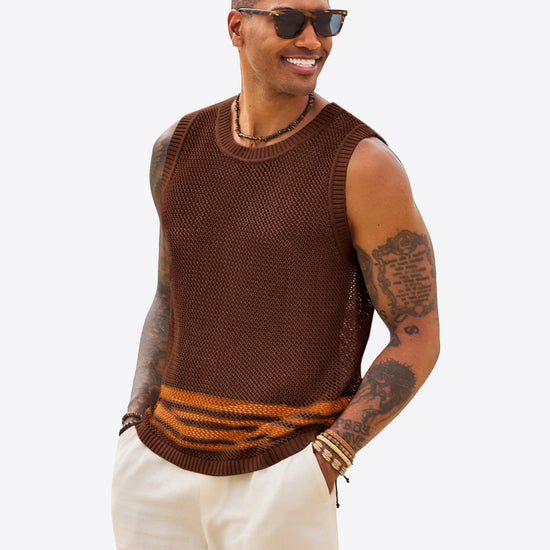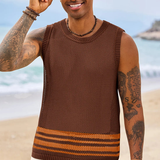Elevate your summer style with Runcati Men’s Crochet See-Through Tank Tops—crafted for beach days and streetwear vibes. This sleeveless crew neck top features a hollow knit design to showcase muscle lines, color-blocked hem for trendy flair, and breathable fabric for all-day coolness. Perfect for beach parties, casual outings, or hip-hop looks, it pairs effortlessly with shorts or jeans for a laid-back hippie aesthetic.