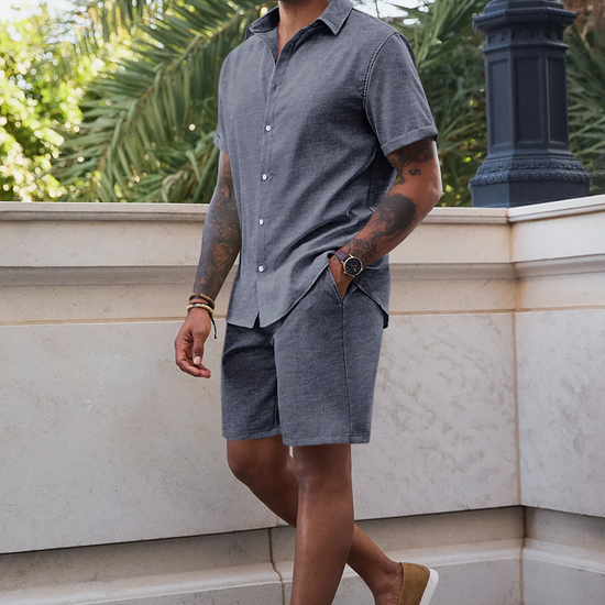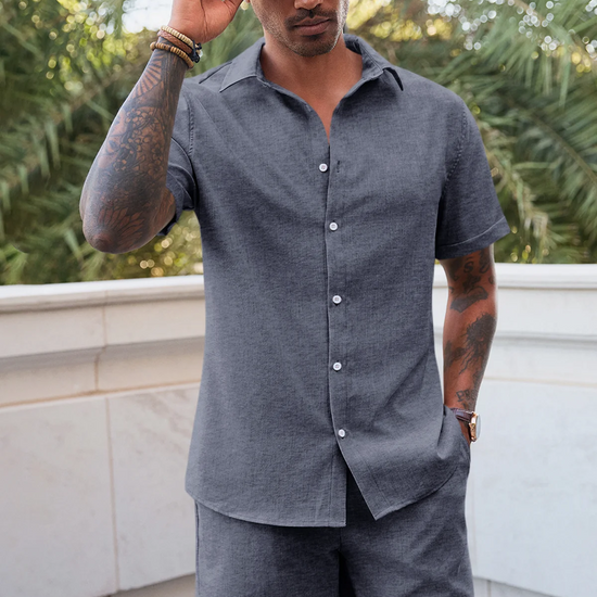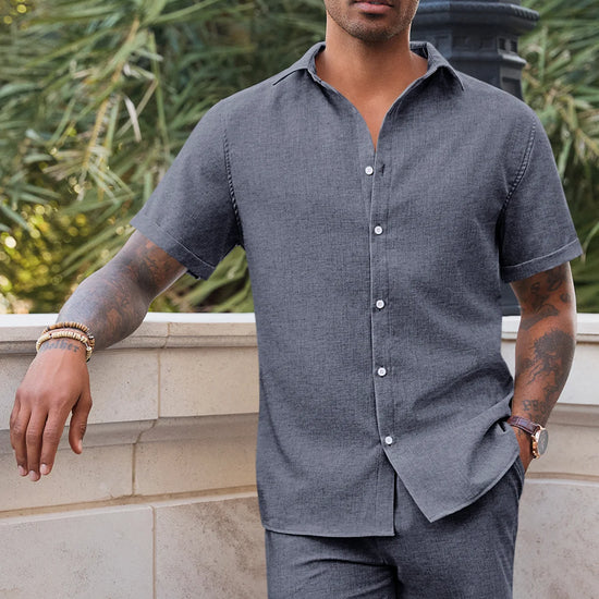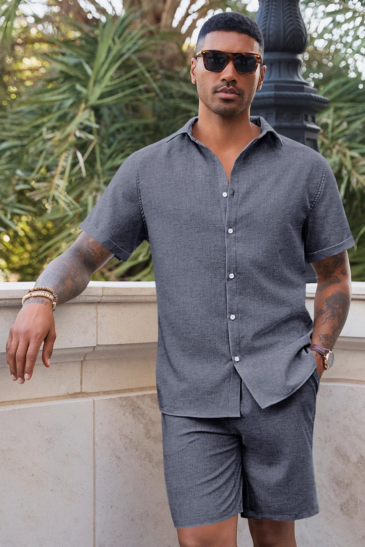 Coordinated Set: Includes a short-sleeve button-down shirt with a sophisticated spread collar and matching shorts.