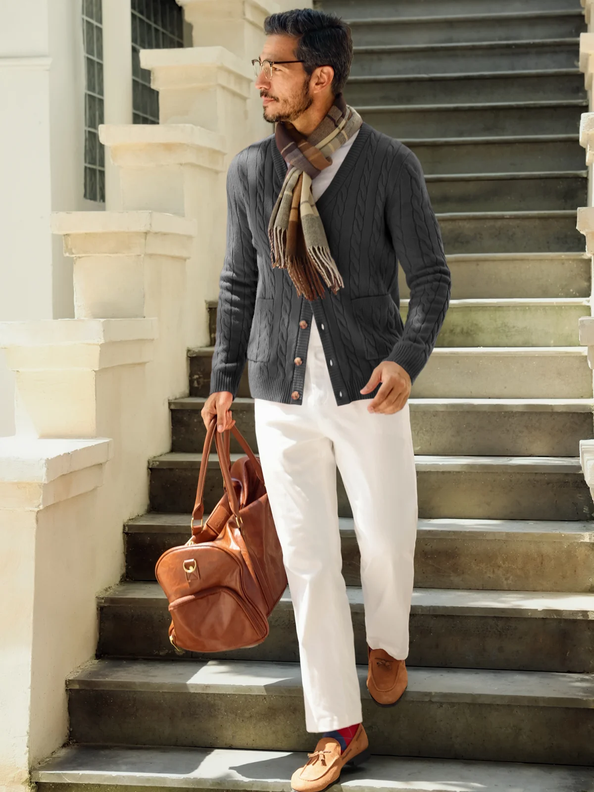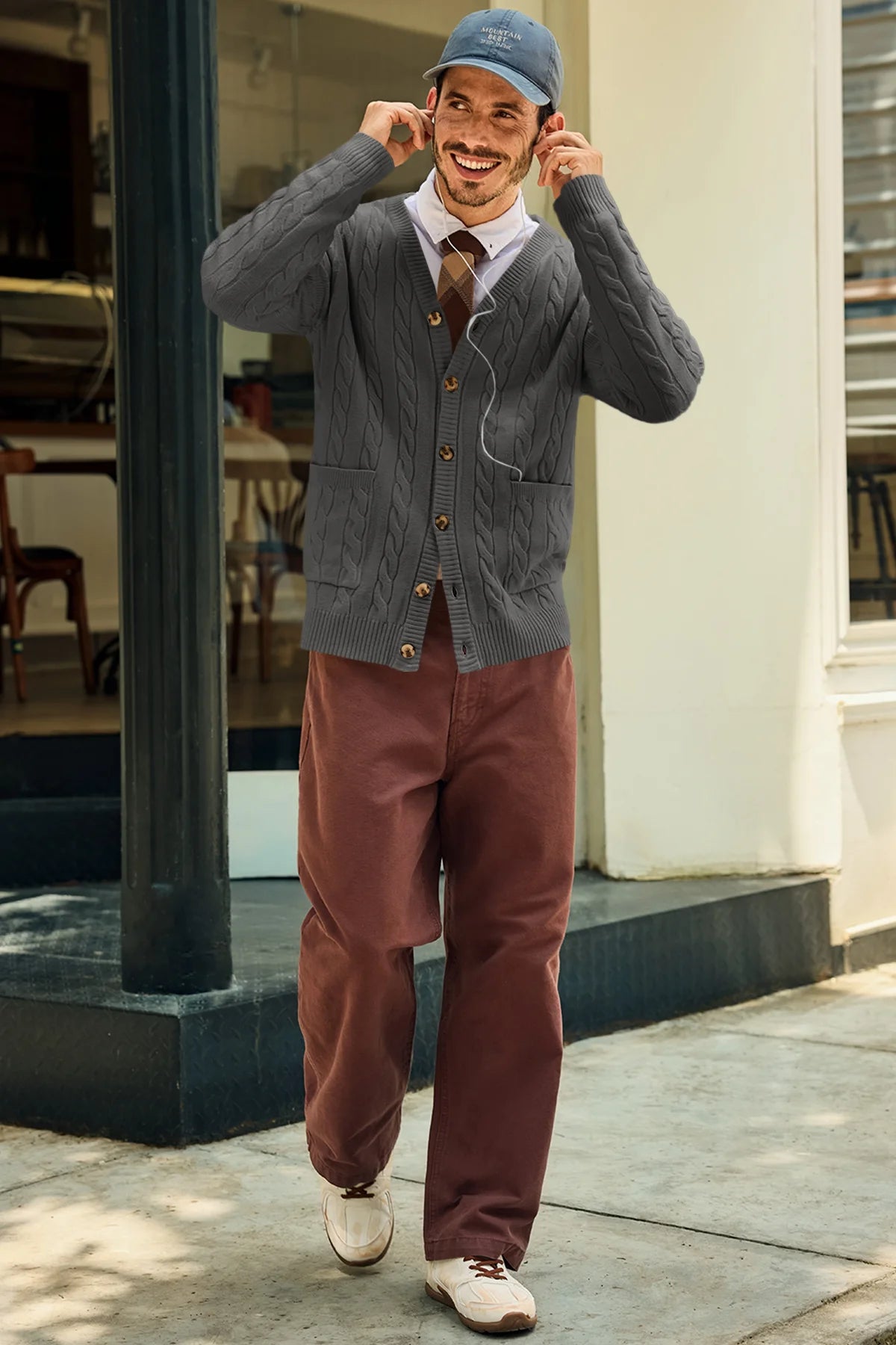 This stylish men's cardigan sweater features a classic V-neck, intricate cable knit design, and two handy patch pockets. Made from soft, quality fabric, it offers lightweight warmth and all-day comfort. Perfect for any occasion, dress it up with a formal shirt or keep it casual with a tee. Plus, it's machine washable for easy care and durability, making it a must-have in your wardrobe!