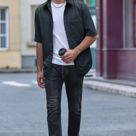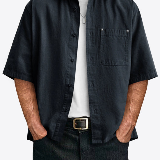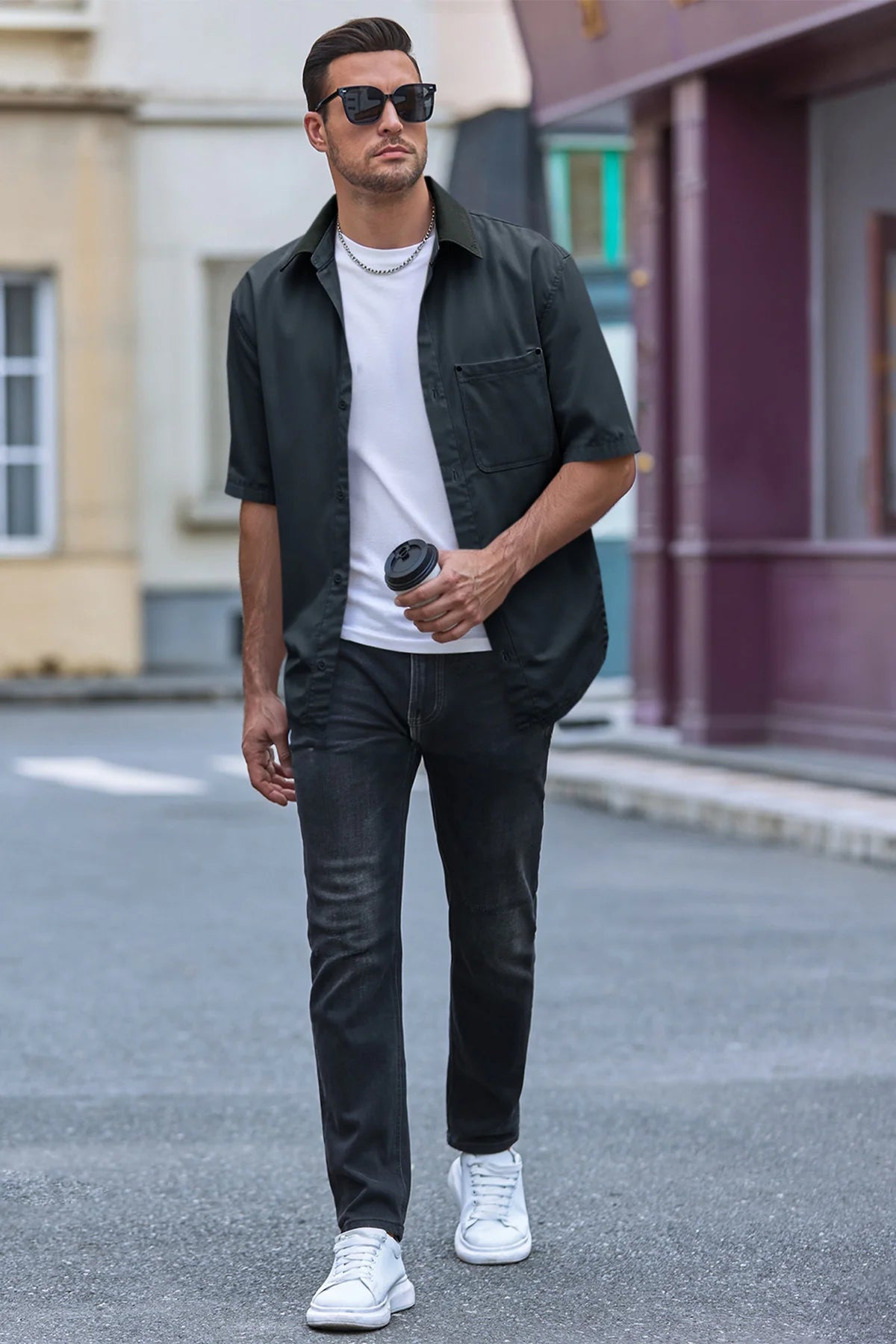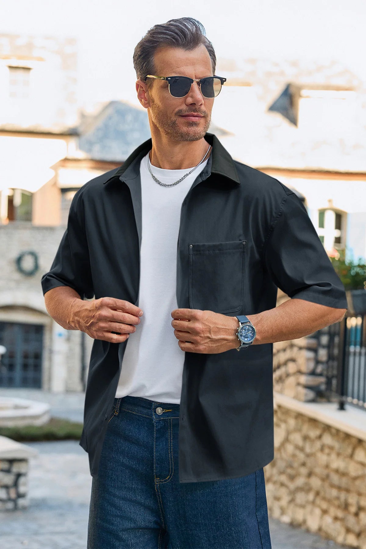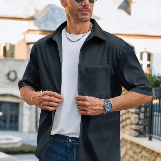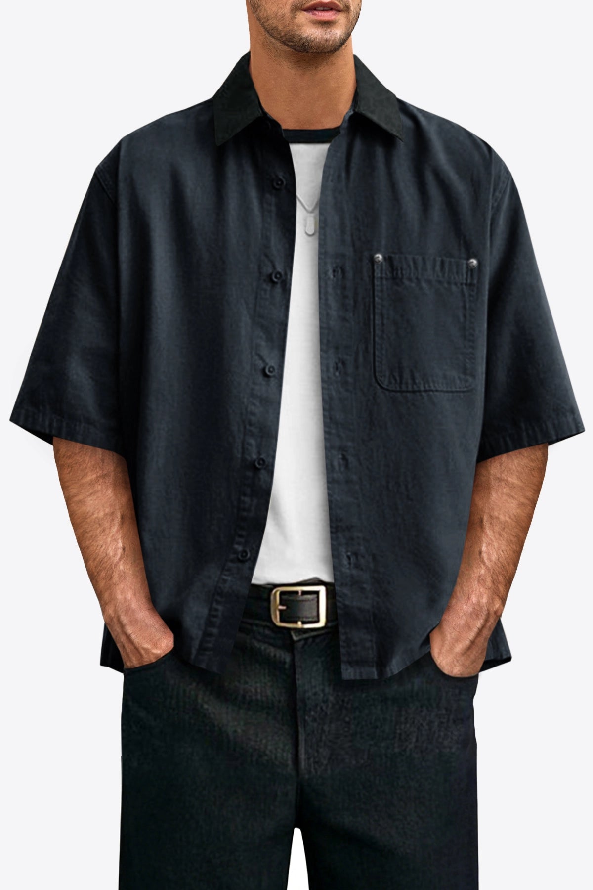 Upgrade your rugged everyday look with the Runcati Mens Button Down Work Shirt. Featuring a unique contrast corduroy lapel and a functional rivet-reinforced chest pocket, this half-sleeve shacket offers a modern twist on classic American workwear. Its loose-fit, tear-resistant design ensures maximum mobility and breathability for any outdoor or urban adventure.