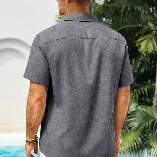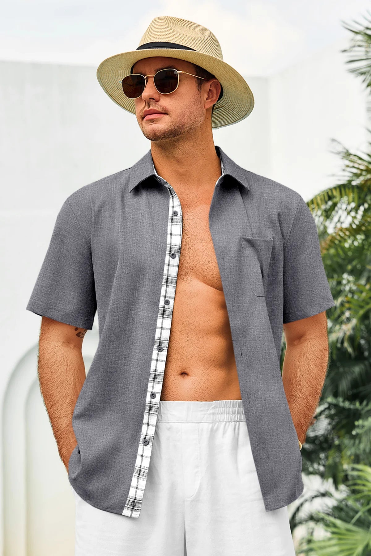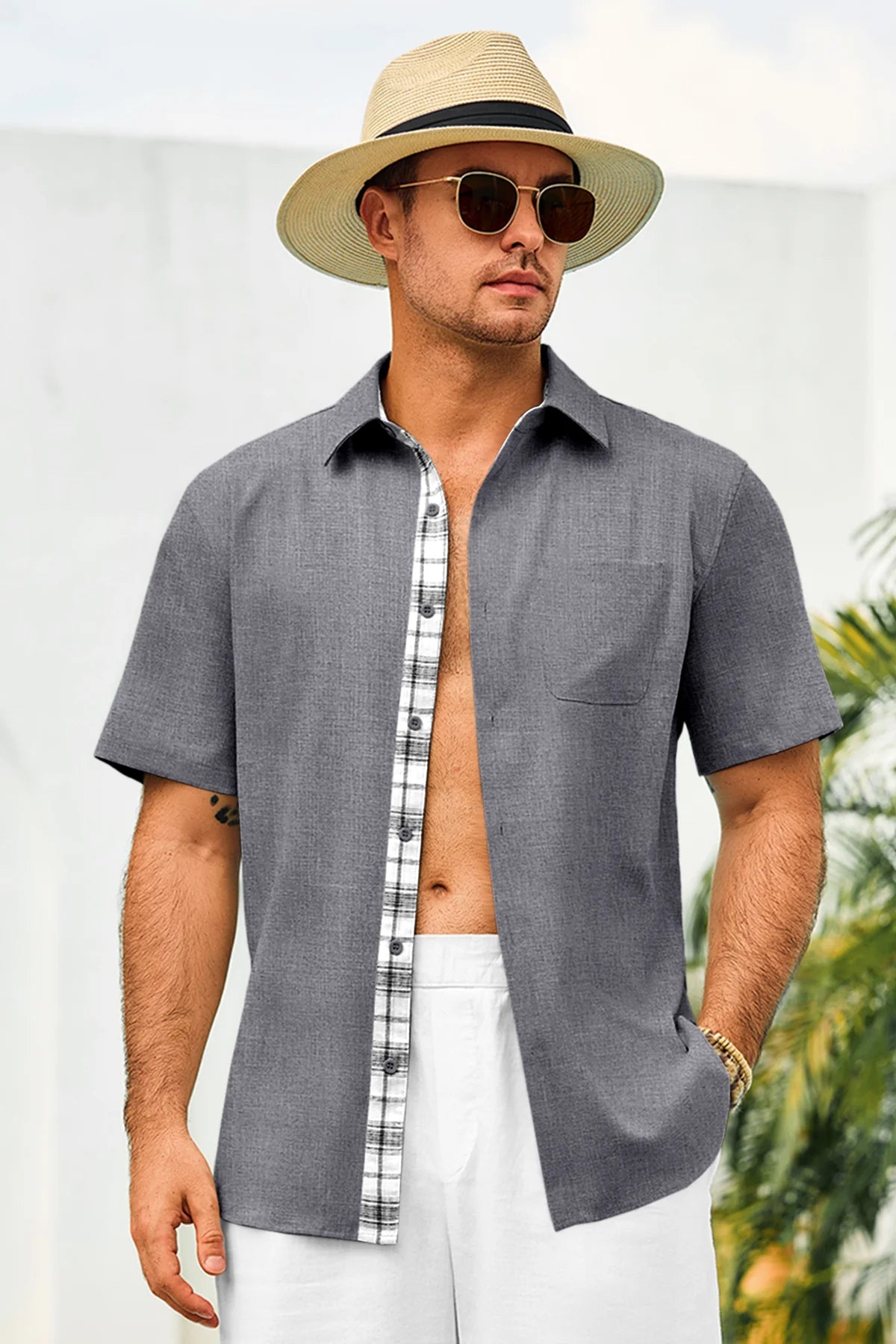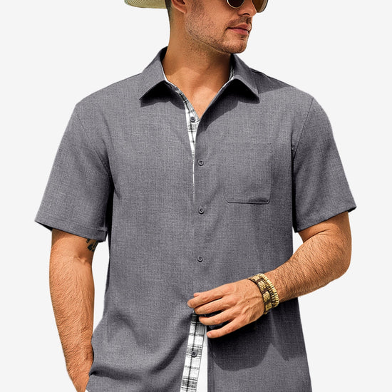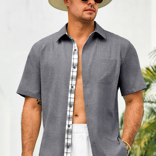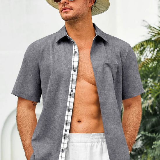 Introducing the mens casual contrasting plaid shirt – a perfect blend of style and comfort! Made from light blens fabric, it’s designed for a relaxed fit with a classic short sleeve, button-down, and spread collar. Featuring unique contrasting plaid design at the collar and placket adds a chic touch, it’s great for weddings or casual beach outings. Available in vibrant colors like Black, White, Sky Blue, and more, this shirt is a must-have for any wardrobe!