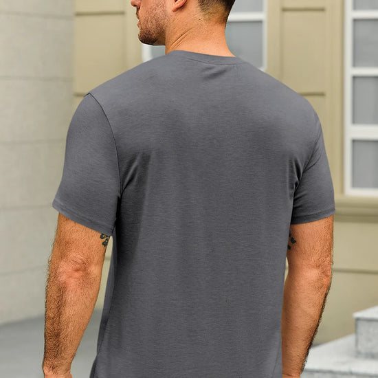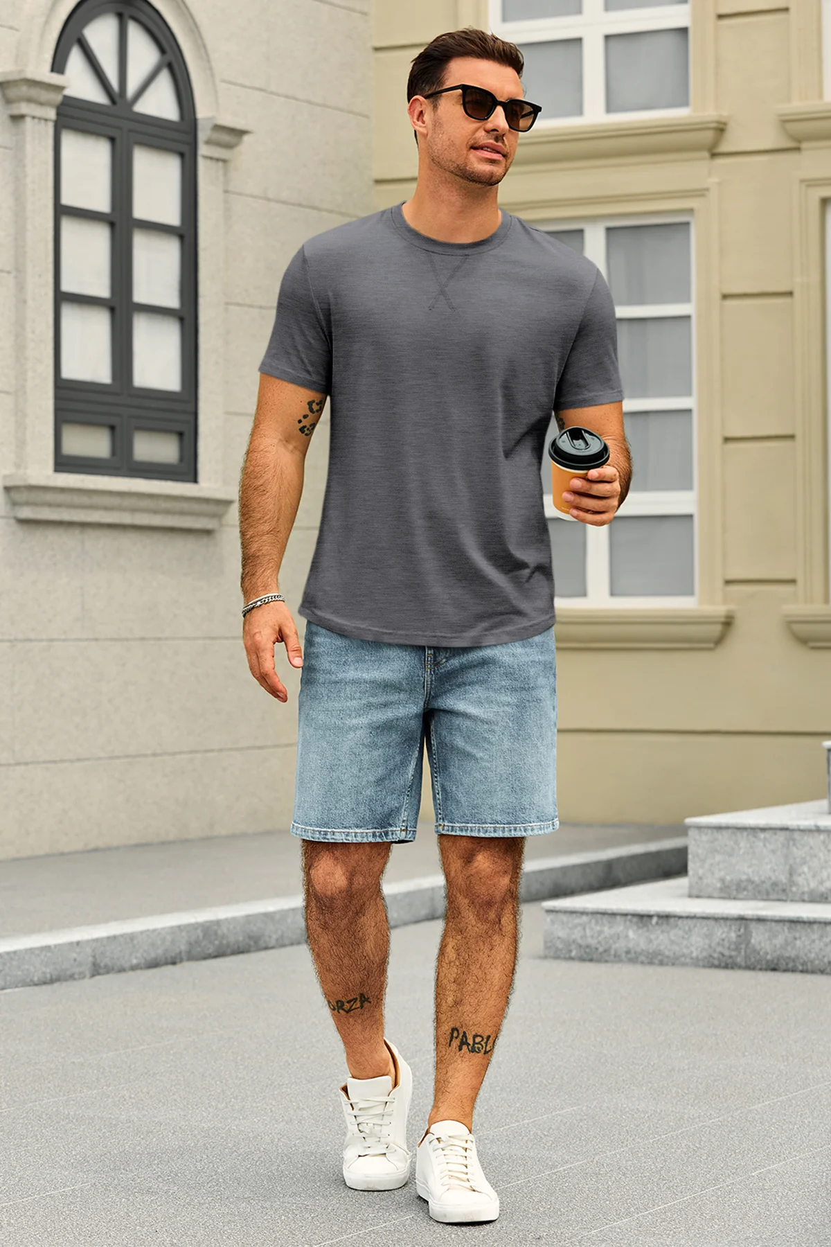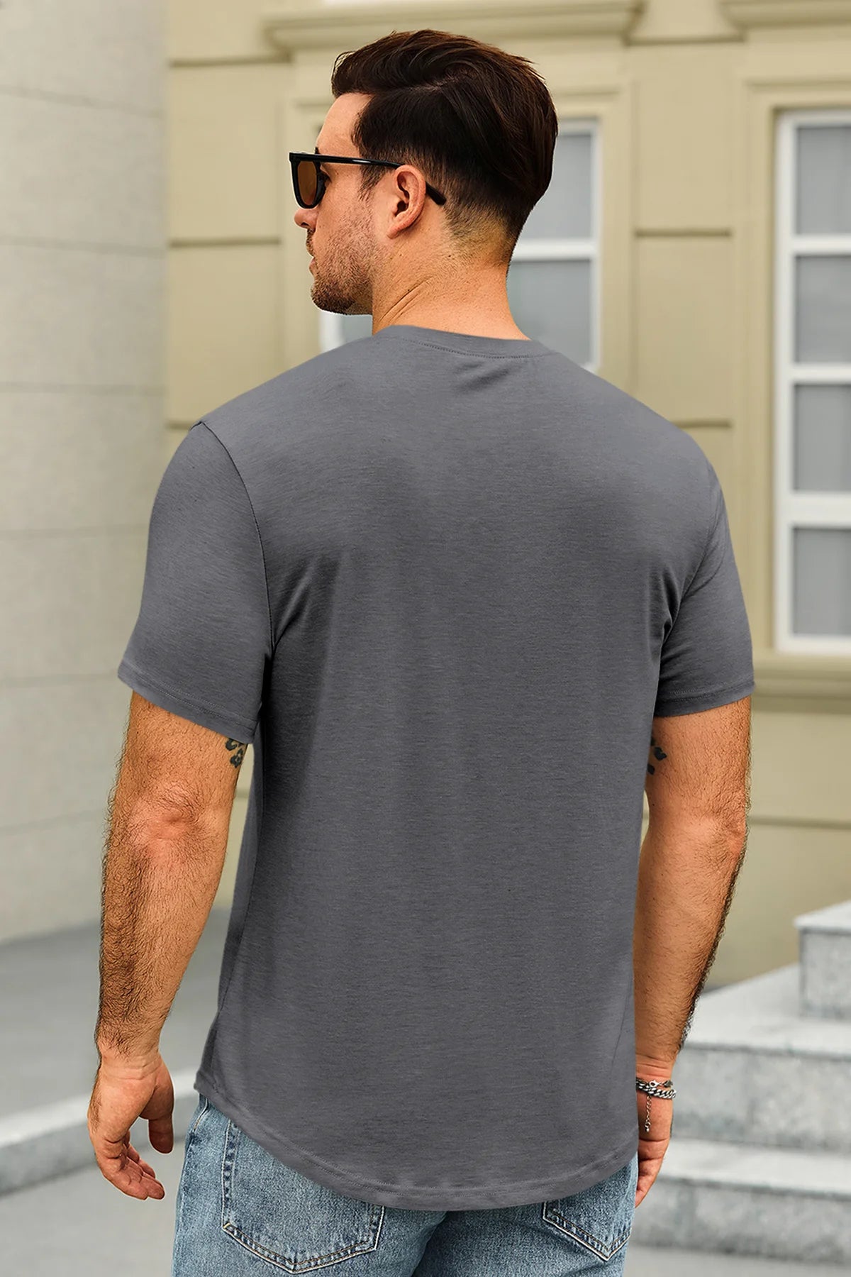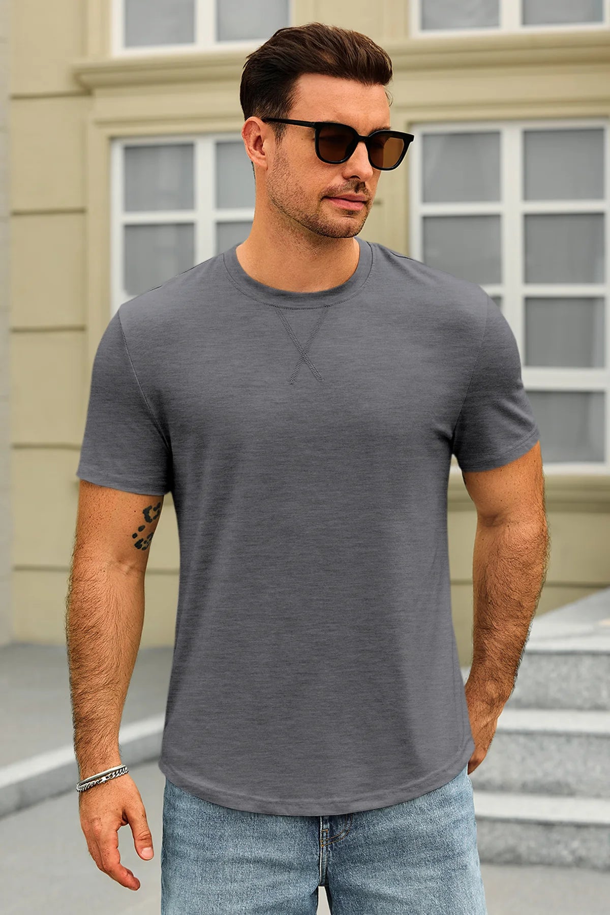 Classic men's short sleeve tee with a crew neck and curved hem. Made from lightweight stretch fabric for a comfortable, regular fit that retains its shape. Versatile for dressing up or down, perfect for casual outings, parties, or daily wear. A timeless, solid-color essential for any wardrobe. Check the size chart before ordering.