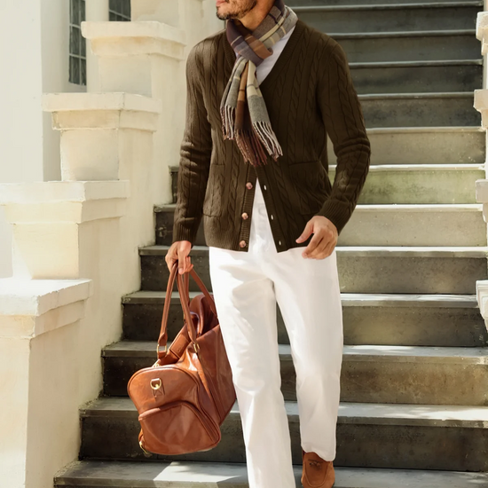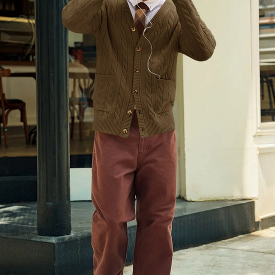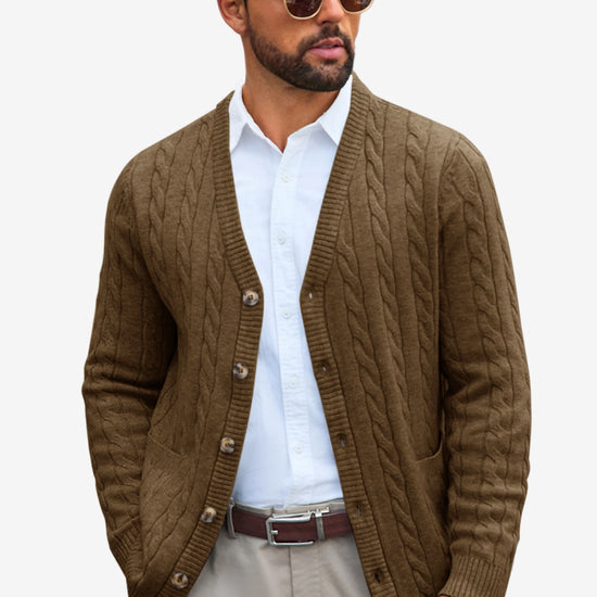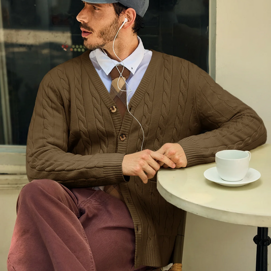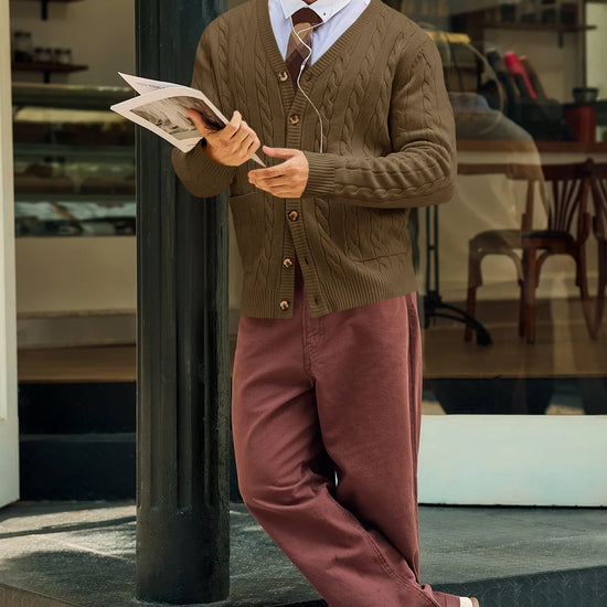 This stylish men's cardigan sweater features a classic V-neck, intricate cable knit design, and two handy patch pockets. Made from soft, quality fabric, it offers lightweight warmth and all-day comfort. Perfect for any occasion, dress it up with a formal shirt or keep it casual with a tee. Plus, it's machine washable for easy care and durability, making it a must-have in your wardrobe!