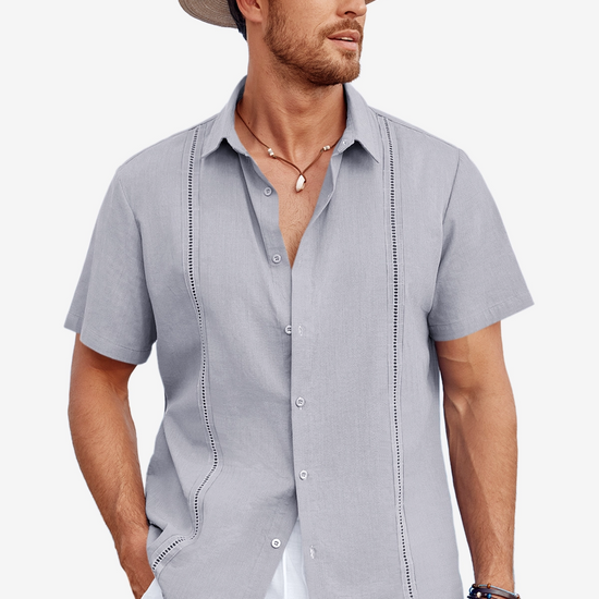 Authentic Cuban Guayabera design with short sleeves, turn-down collar, and button closure for classic appeal.