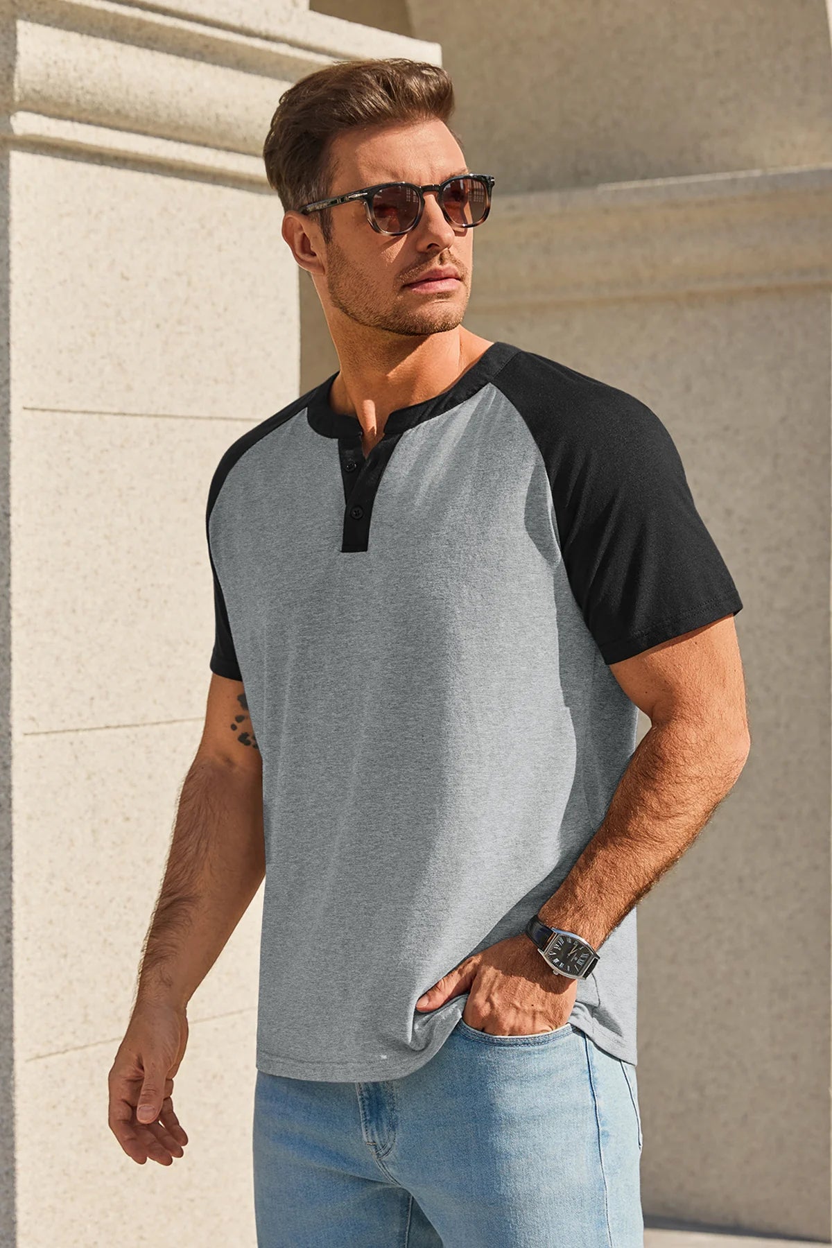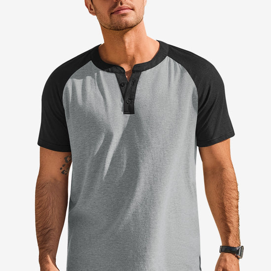 Elevate your casual wardrobe with this Runcati Mens Henley Shirt. It features a classic Henley neck design and raglan short sleeves, paired with a simple yet stylish color block pattern that adds a vibrant street-style vibe. The modern fit is tailored for all body types, accentuating muscular lines while ensuring all-day comfort. Perfect for daily wear, street outfits, school, casual outings, vacations, gym workouts, bodybuilding, powerlifting, running, basketball, baseball, and other outdoor activities.
