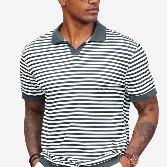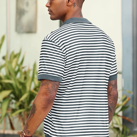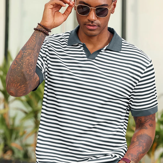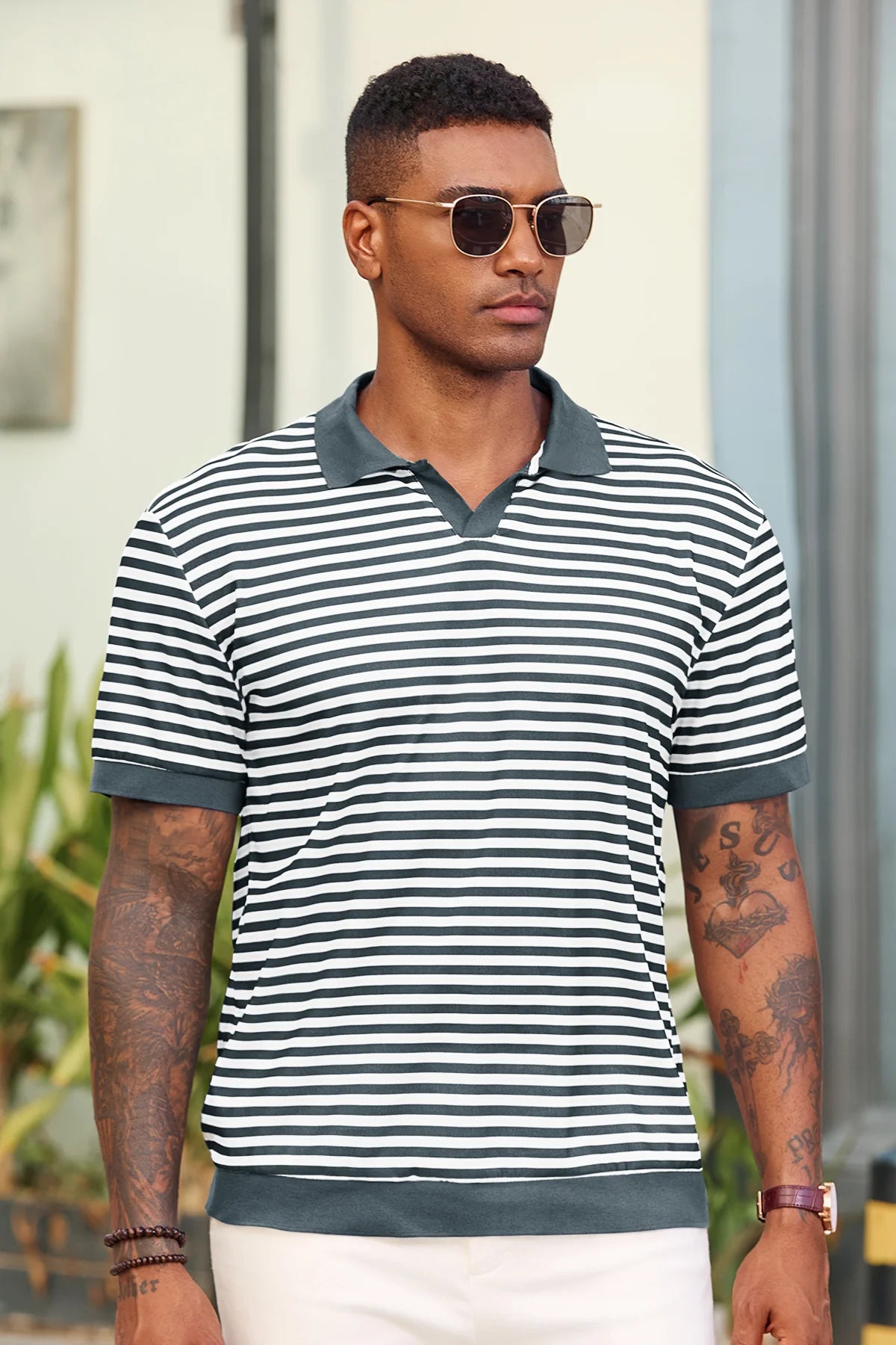 Elevate your wardrobe with Runcati Men’s Short Sleeve Knit Polo Shirt—crafted for comfort and classic style. This 100% polyester polo features a timeless V-neck, resort collar, and striped design, paired with ribbed sleeves and hem for a tailored fit. Soft, stretchy, and breathable, it keeps you cool in hot summer weather while offering versatility for casual or formal moments.