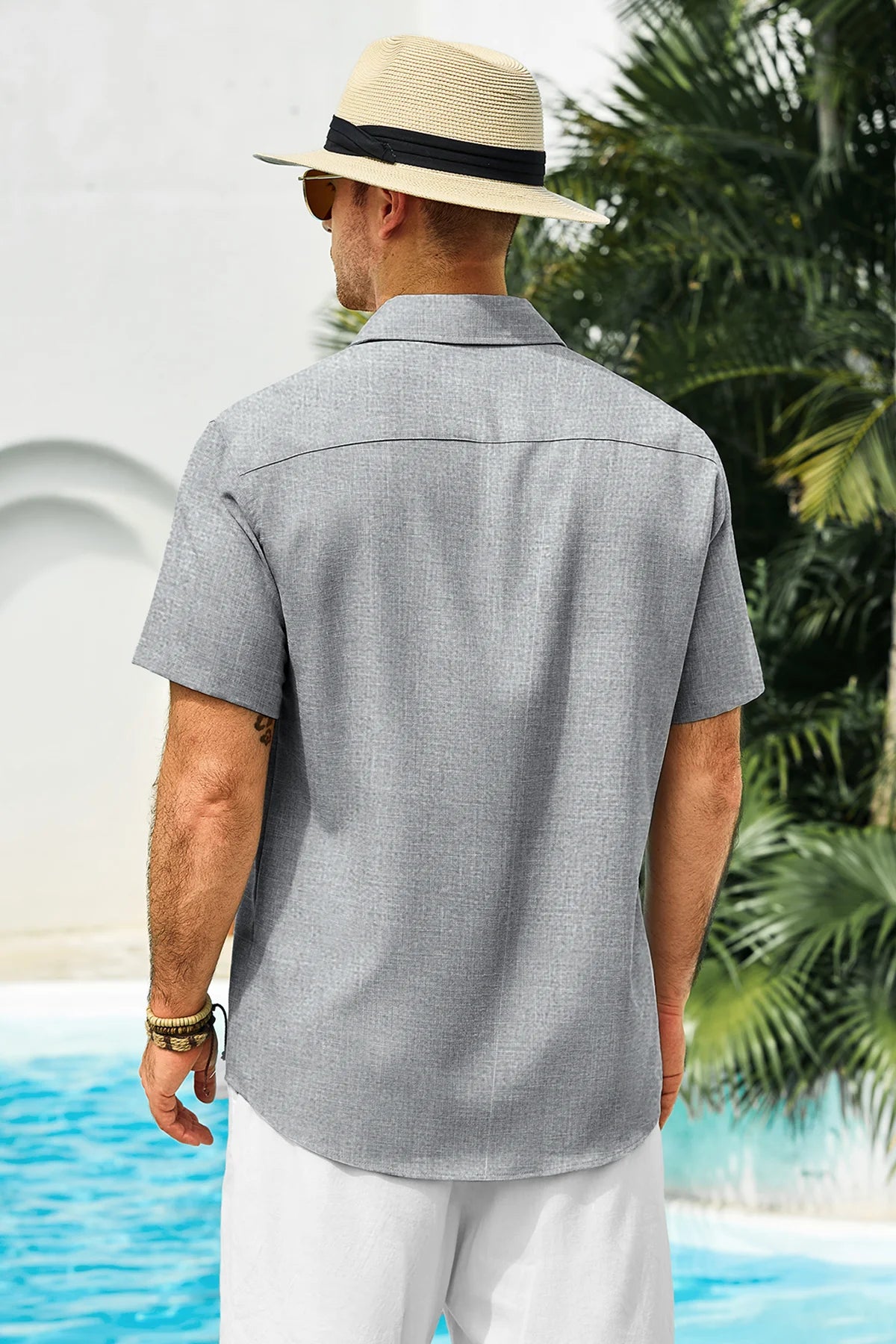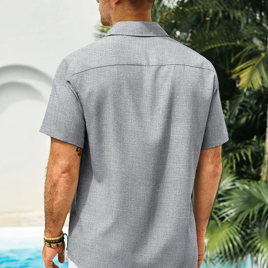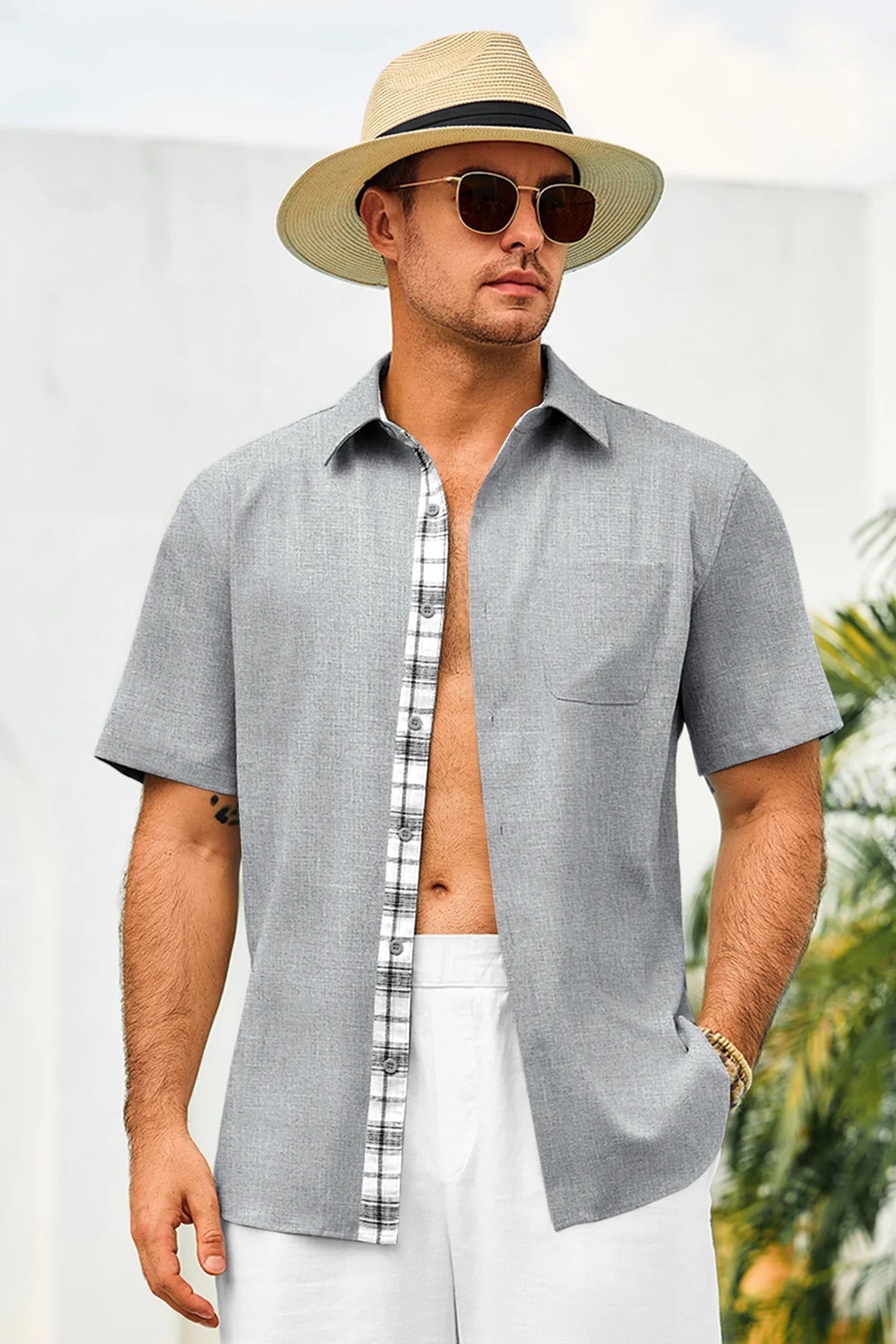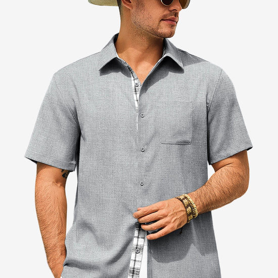 Introducing the mens casual contrasting plaid shirt – a perfect blend of style and comfort! Made from light blens fabric, it’s designed for a relaxed fit with a classic short sleeve, button-down, and spread collar. Featuring unique contrasting plaid design at the collar and placket adds a chic touch, it’s great for weddings or casual beach outings. Available in vibrant colors like Black, White, Sky Blue, and more, this shirt is a must-have for any wardrobe!