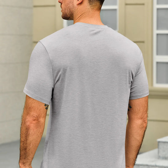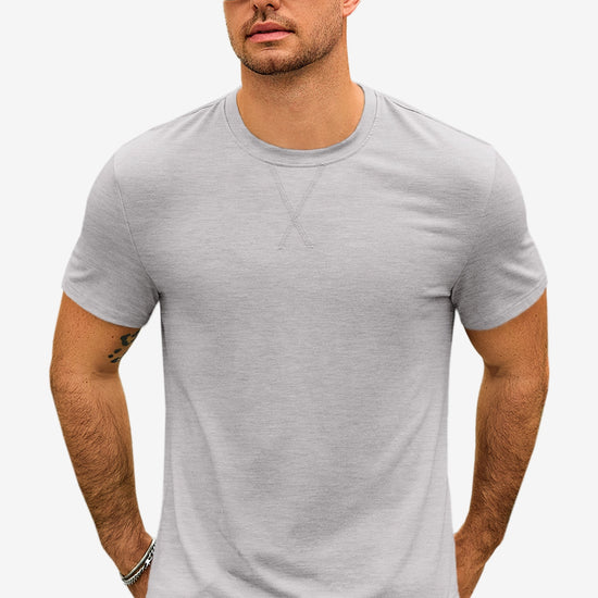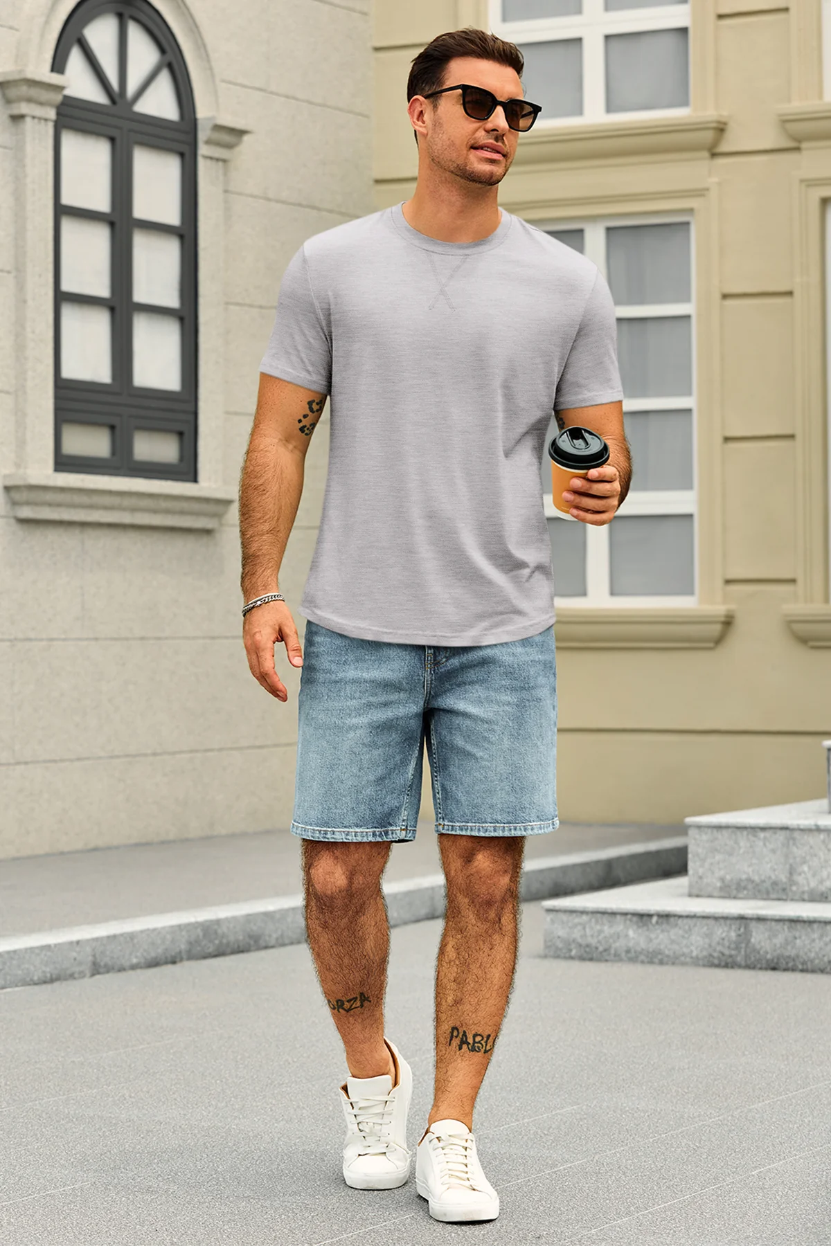 Classic men's short sleeve tee with a crew neck and curved hem. Made from lightweight stretch fabric for a comfortable, regular fit that retains its shape. Versatile for dressing up or down, perfect for casual outings, parties, or daily wear. A timeless, solid-color essential for any wardrobe. Check the size chart before ordering.