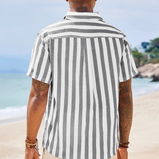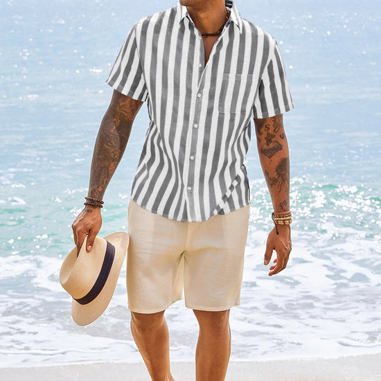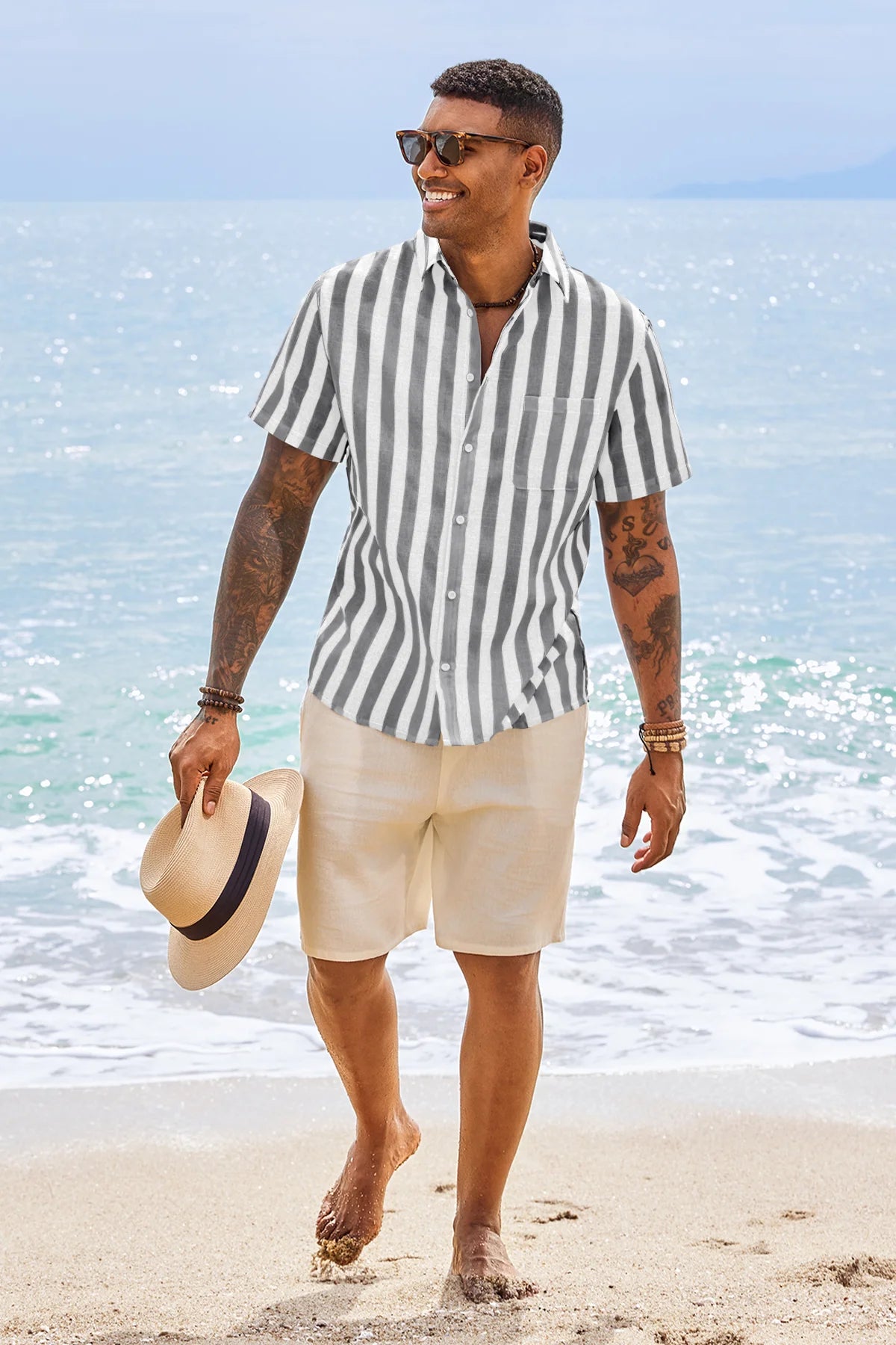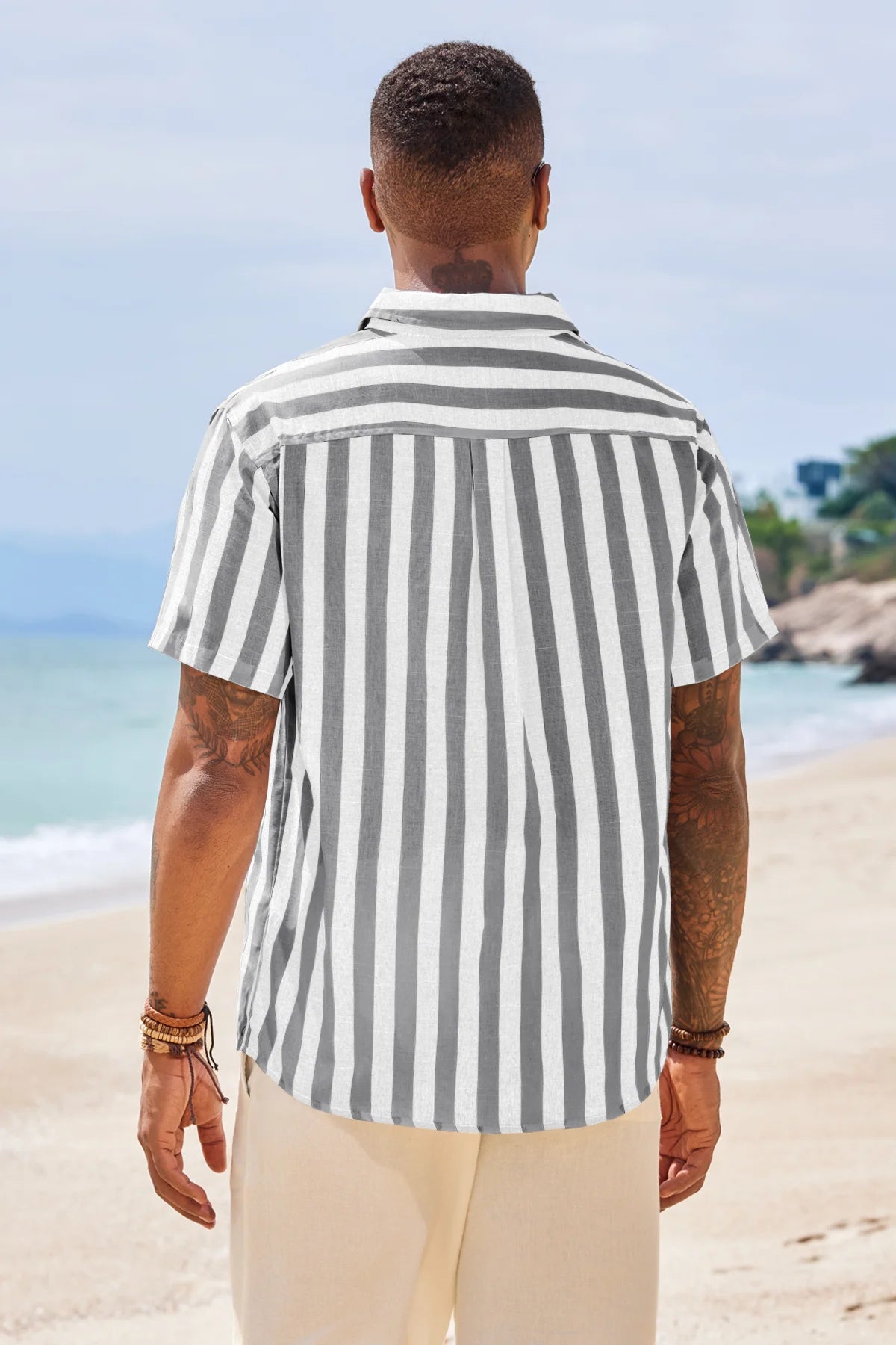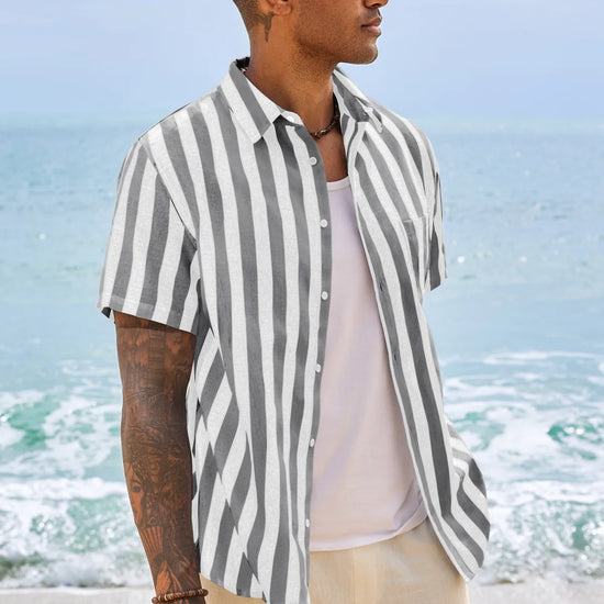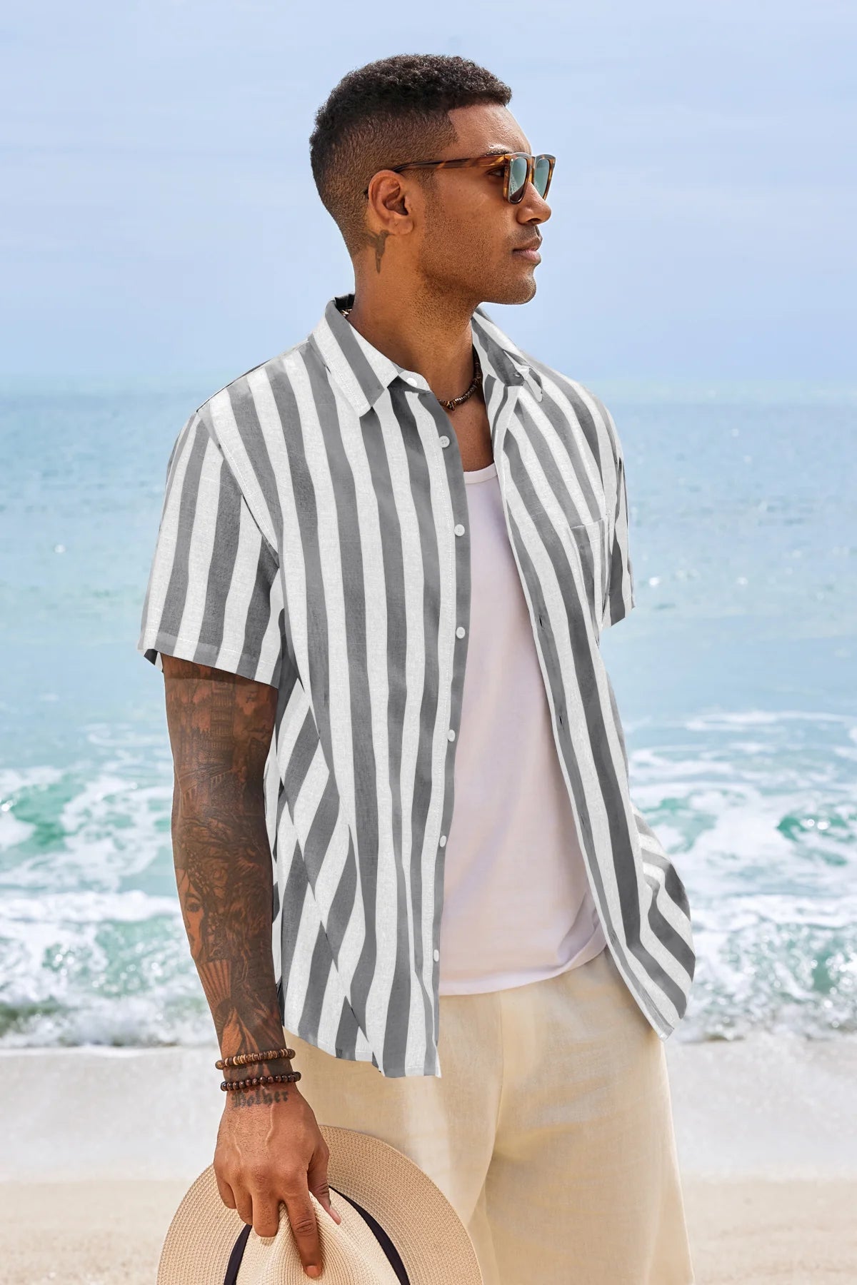 Introducing the men’s casual stripe shirt – a timeless blend of style and comfort! It features classic timeless stripe patterns (available in slim or wide stripe options) for versatile appeal. Designed with a relaxed fit, short sleeves, button-down closure, and spread collar, it’s perfect for business casual, beach outings, weddings, or daily wear. A wardrobe staple that balances sophistication and ease!