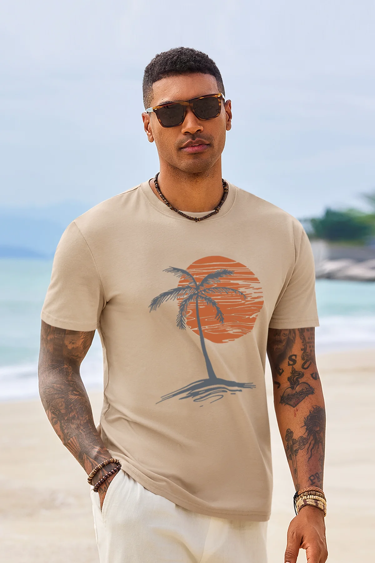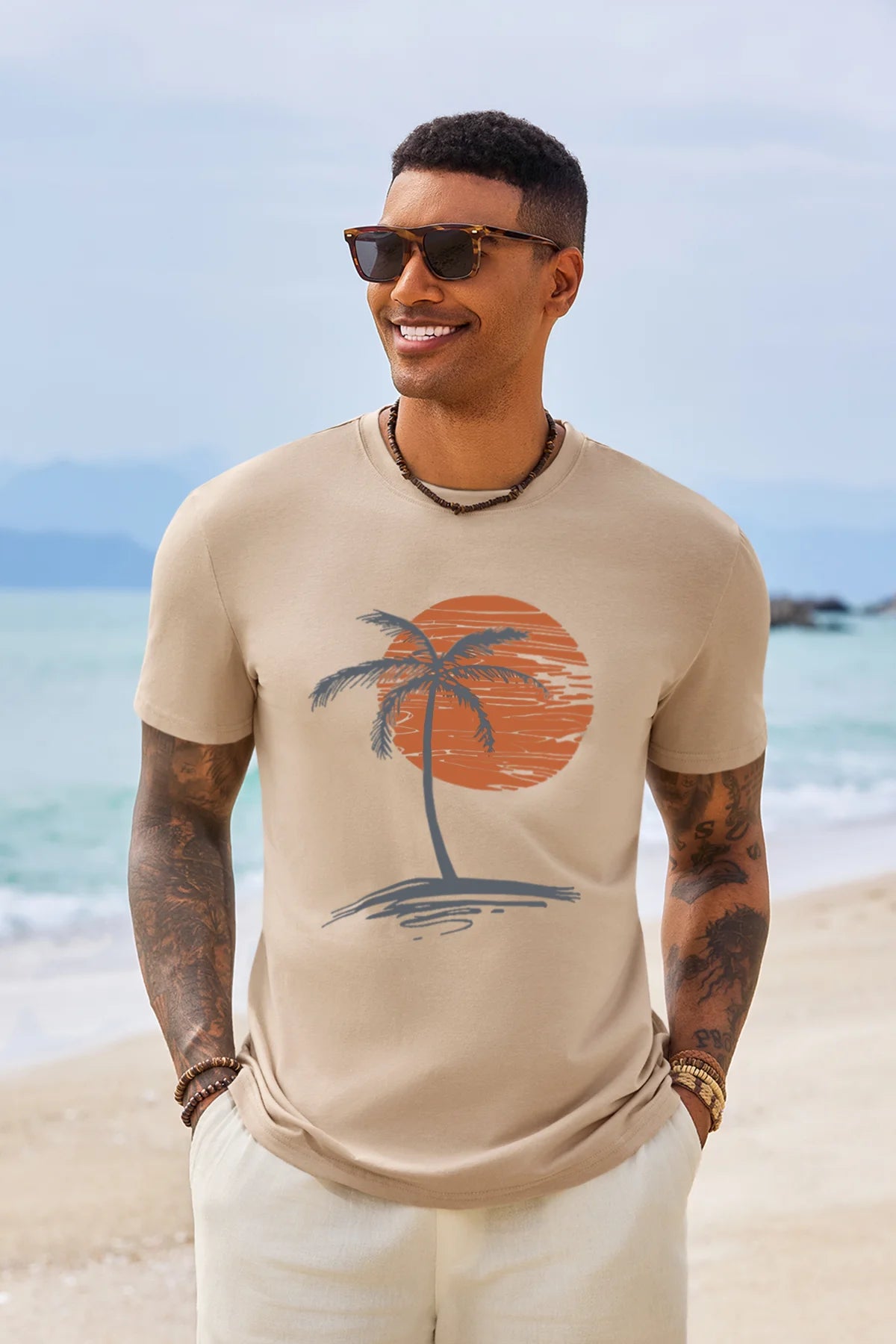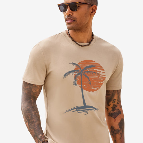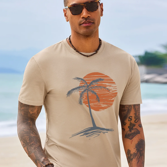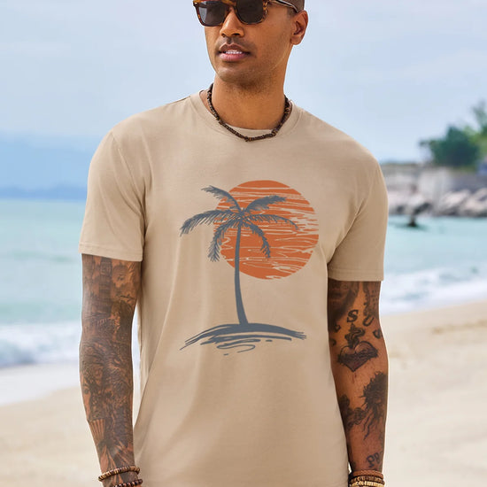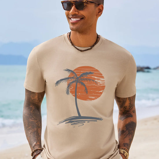 Add a tropical vibe to your wardrobe with this Runcati Mens Short Sleeve T-Shirt. It features a classic crew neck design and a stylish sunset palm tree print on the chest—simple yet atmospheric. The basic fit accommodates various body types, making it suitable for both casual wear and sports activities.Easy to pair with shorts, joggers, or jeans, it effortlessly creates a stylish casual look. Perfect for the beach, camping, workouts, daily outings, and other versatile occasions, while maintaining color and shape well after washing.