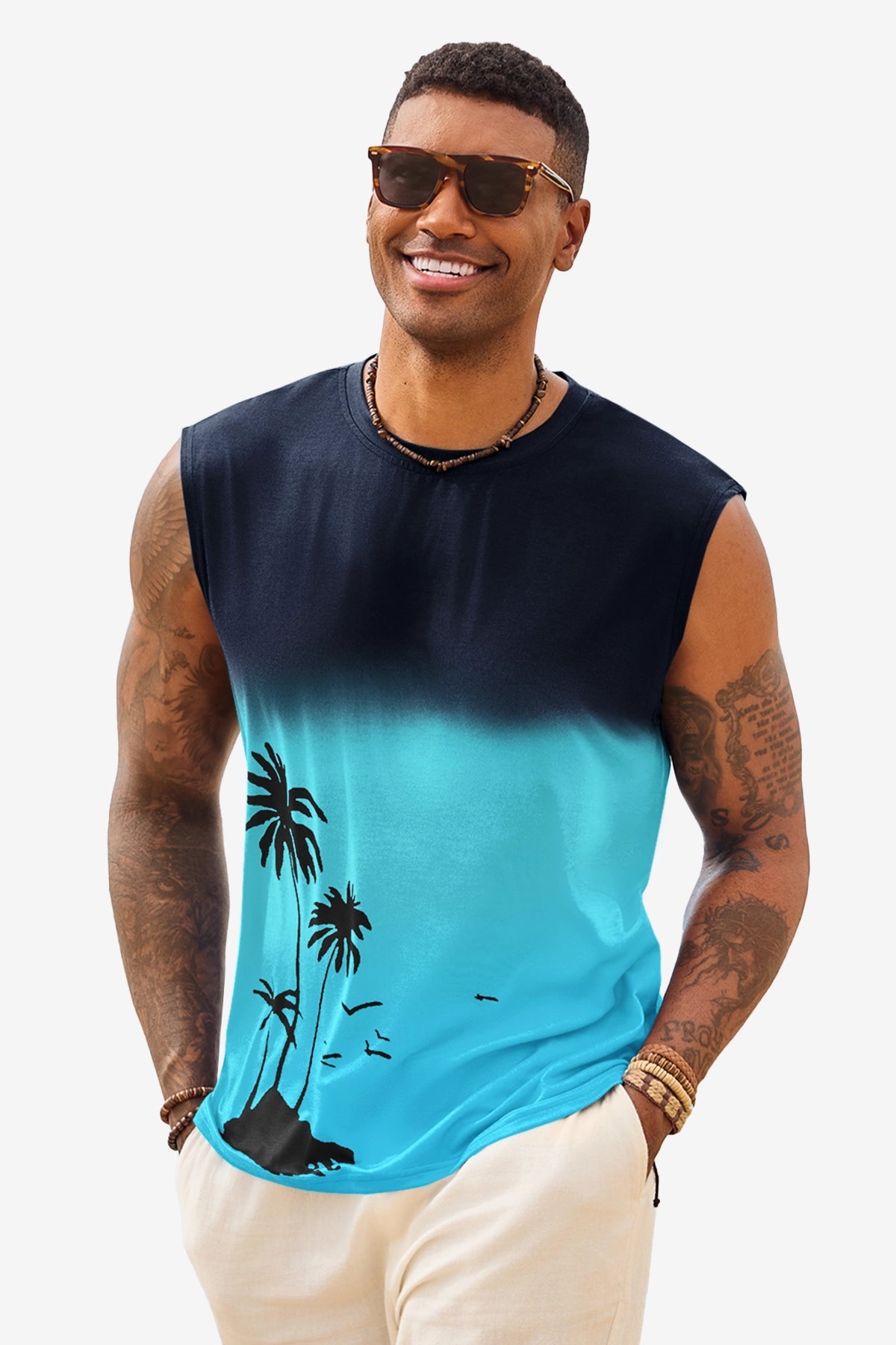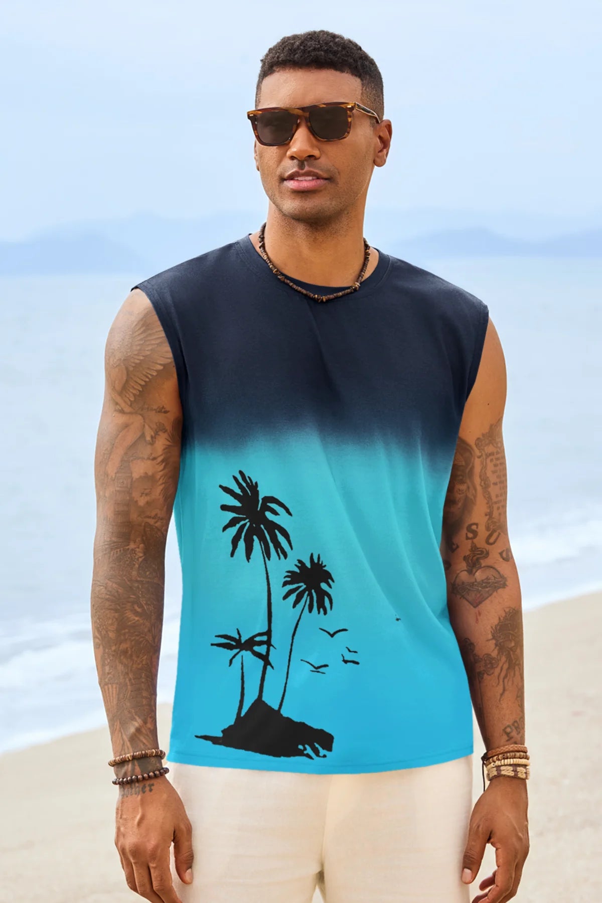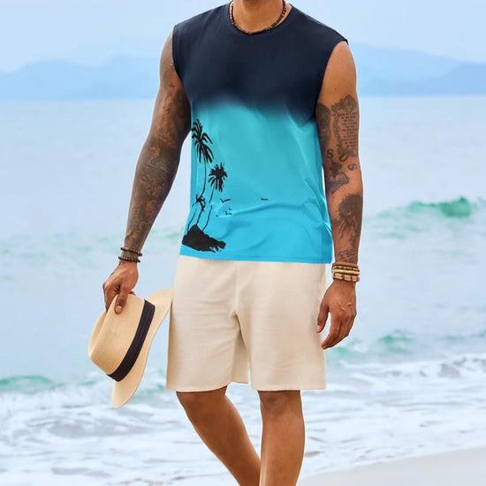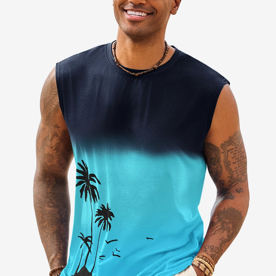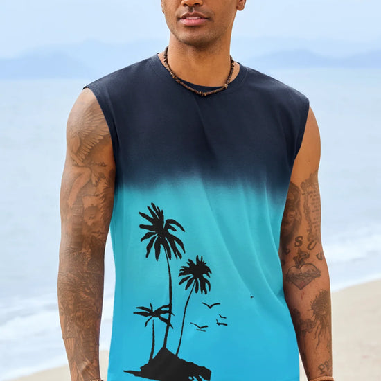 Elevate your summer vibe with this Runcati men's graphic tank top. Featuring a striking palm tree gradient print, this sleeveless shirt blends retro Hawaiian aesthetics with a modern muscle fit. Whether you're hitting the gym or heading to a beach bonfire, its moisture-wicking fabric ensures you stay cool, dry, and stylish under the sun.