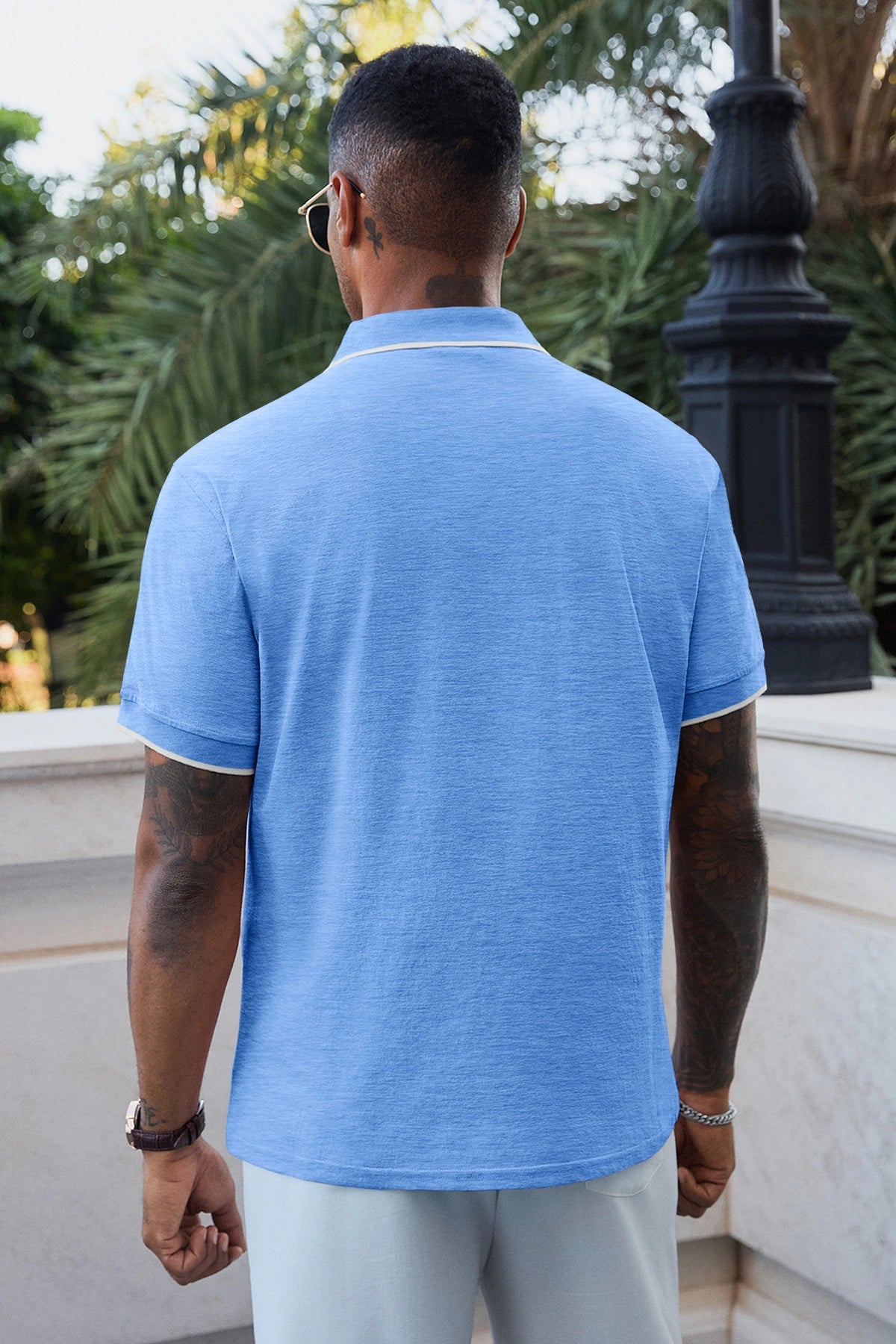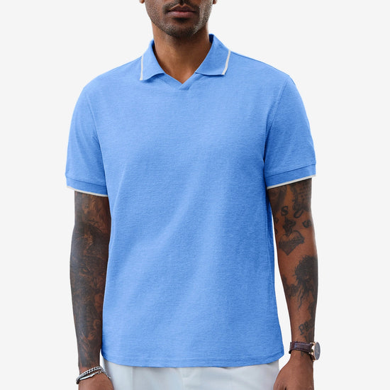 Contrast color splicing on collar and cuffs adds subtle visual interest to the classic polo silhouette.