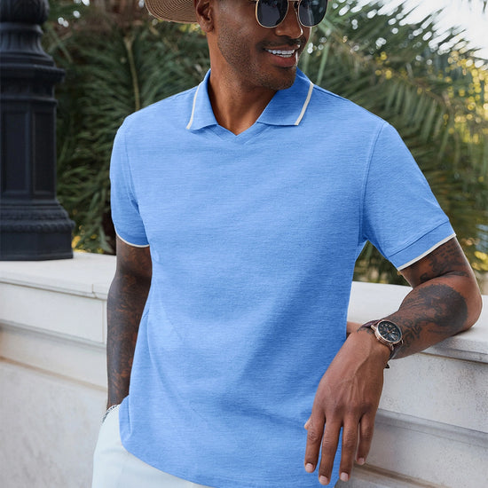 Elevate your wardrobe with Runcati Men’s Vintage V-Neck Polo Shirts—crafted for old-money charm and all-day comfort. Made from 100% polyester, this short-sleeve knit golf shirt features a button-free lapel, contrast color splicing, and ribbed detailing for a retro-modern vibe. Lightweight, stretchy, and wrinkle-resistant, it’s perfect for office days, golf outings, dates, or casual vacations, blending versatility with timeless style.